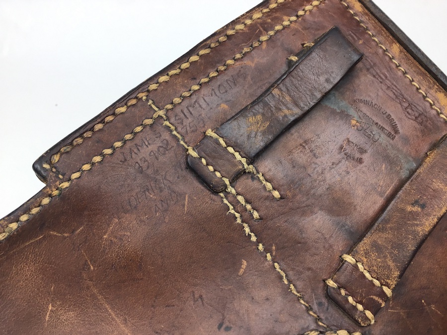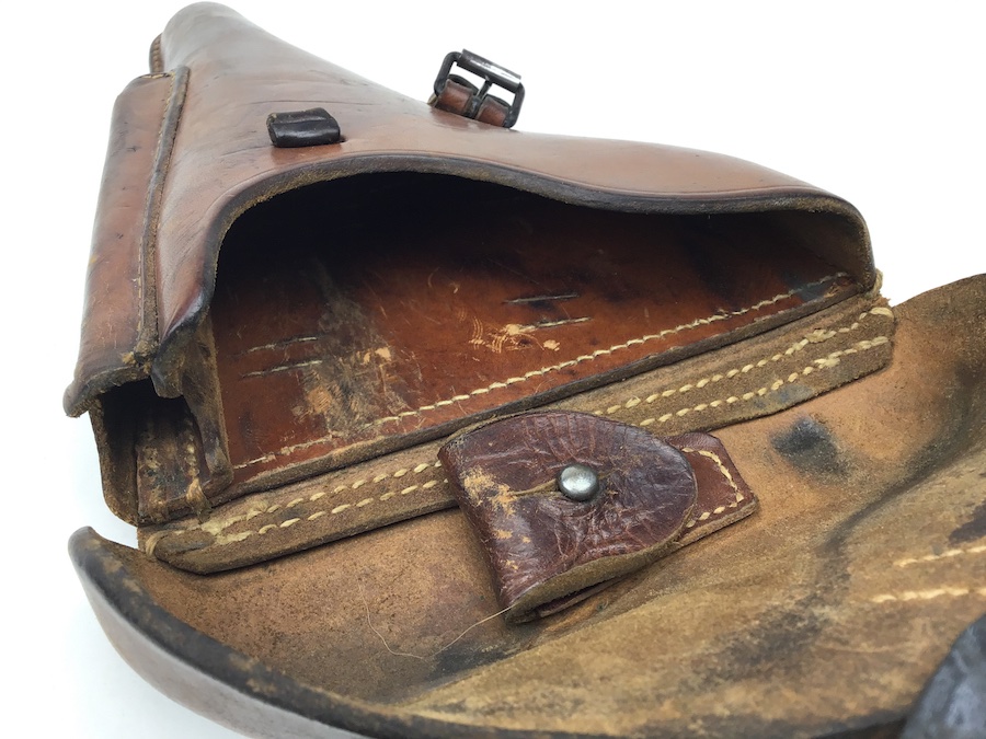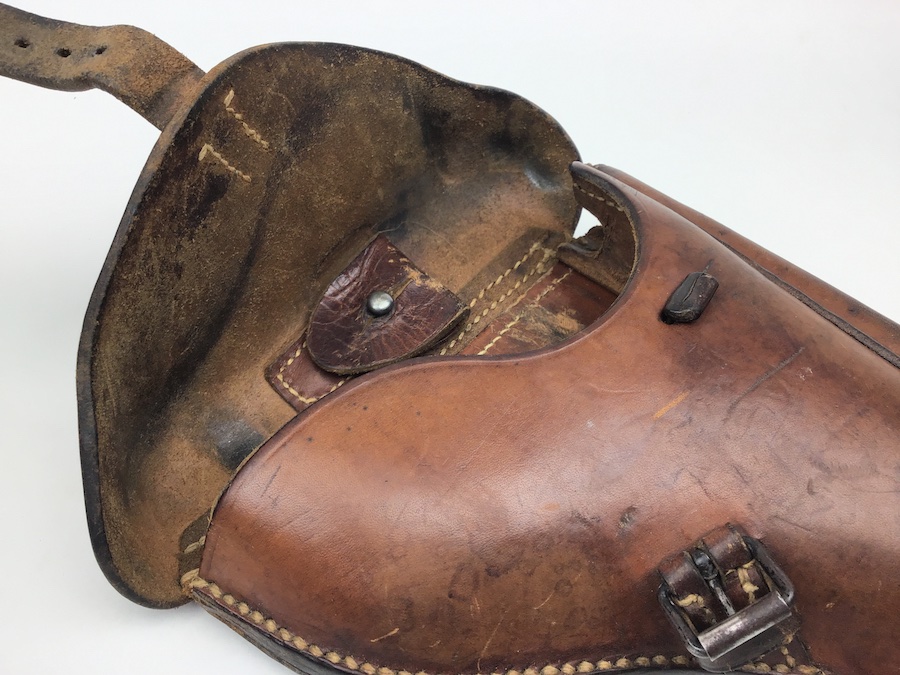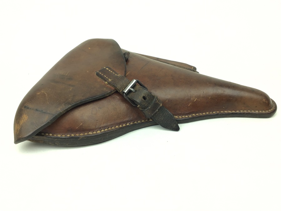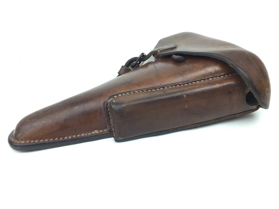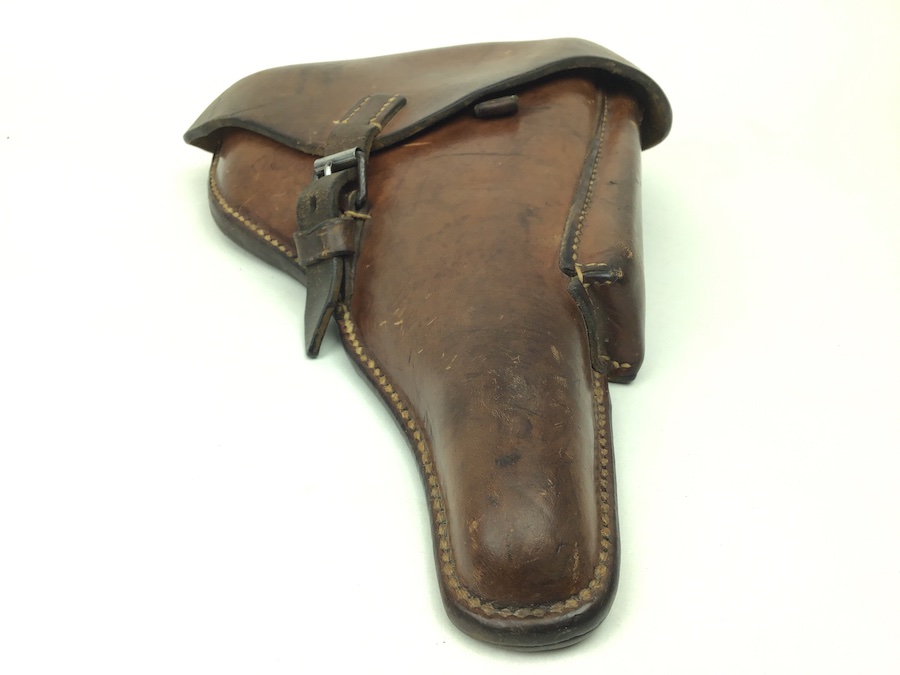 4/28/20 – This is a very good, original WW2 production Luger holster. The holster has clean brown leather. There is minor use wear, but it is fully intact with original stitching. The back of the holster is 1940 dated with a “Kimnach U Brunn” maker stamp. There’s also a “WaA416” waffen proof.  It was personalized above the belt loops, as well as the back. Guaranteed original and authentic.