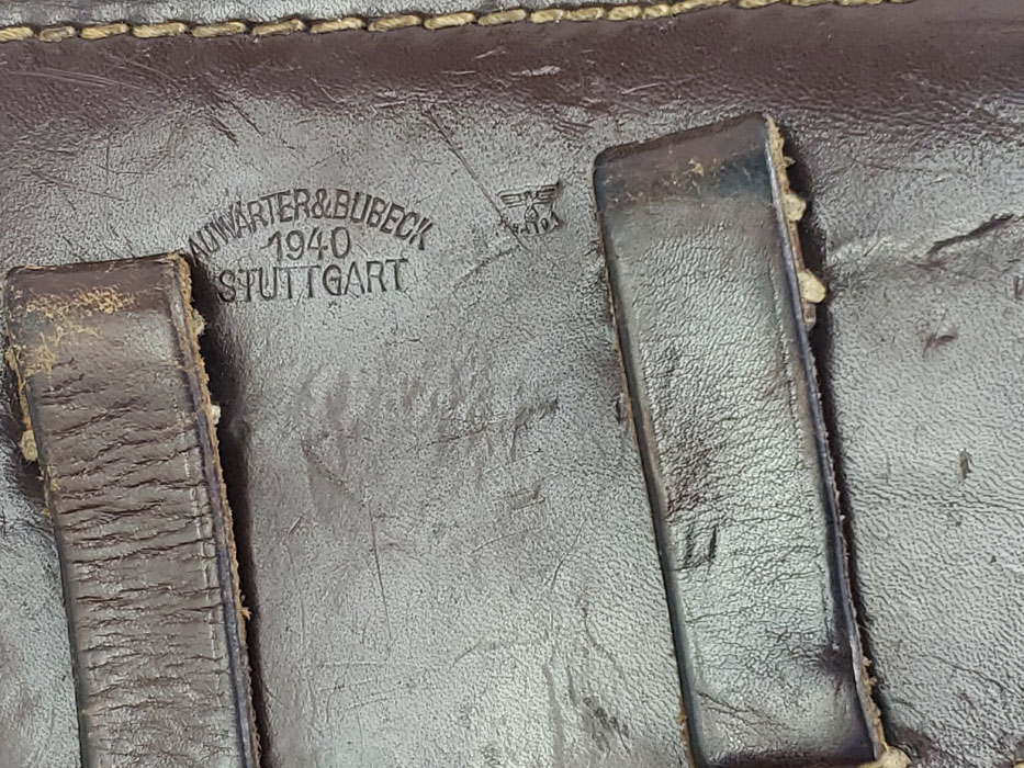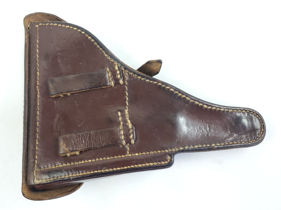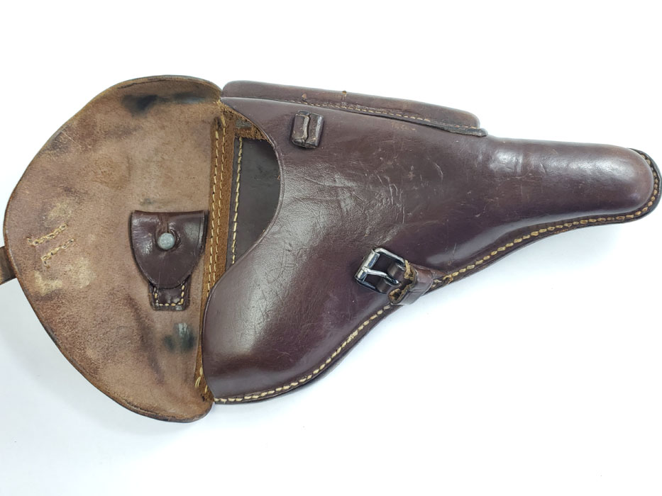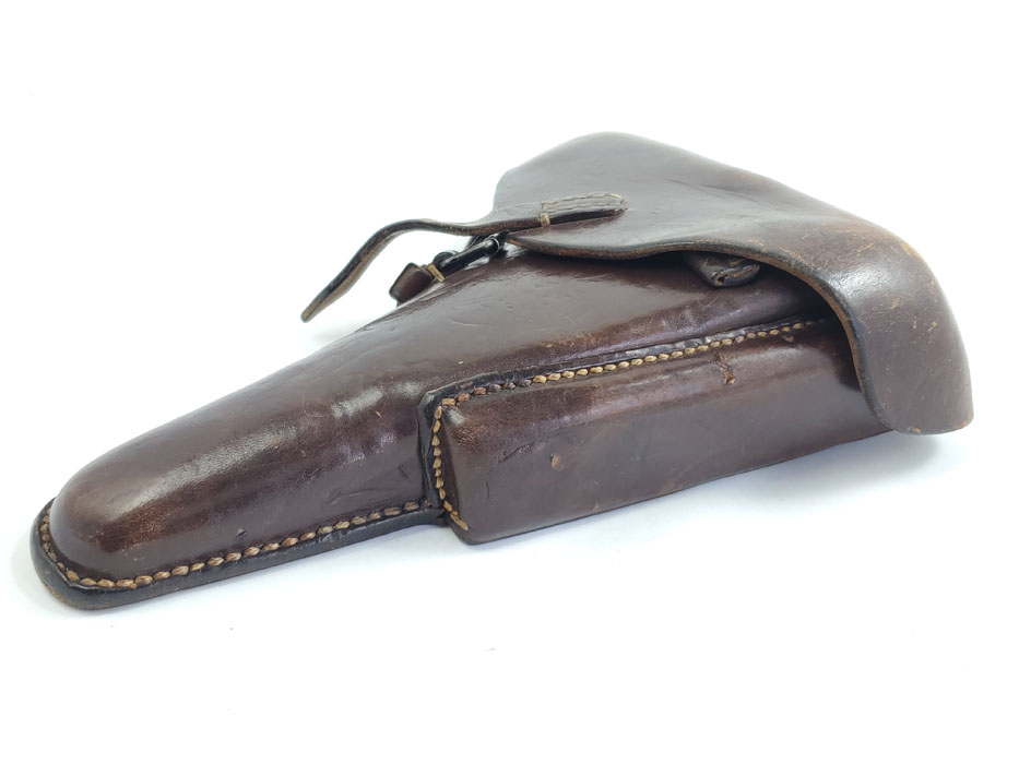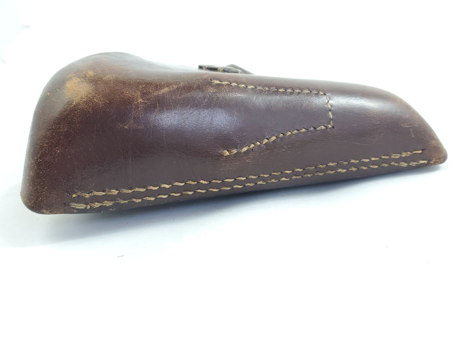 6/2/20 – This is a brown leather 1940 Luger holster from WW2. The leather is pliable but clean and completely in tact with no major issues or notable flaws. Very nice brown leather is fairly scarce for 1940. The back of the holster is maker stamped and dated with a waffen military proof stamp. Some light surface scuffing on the lid. Nice all original stitching is in tact.