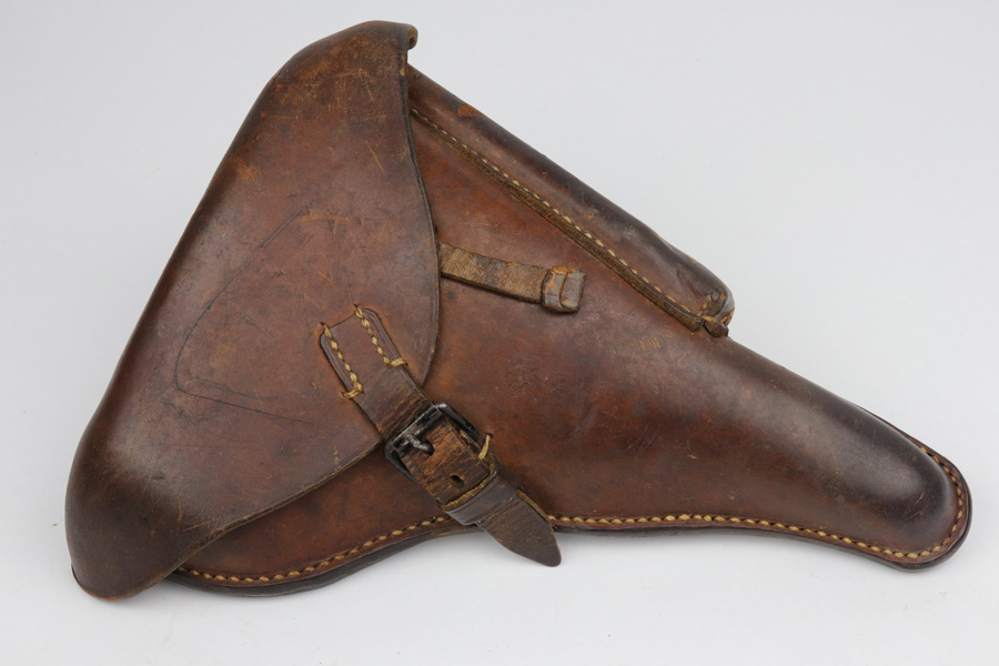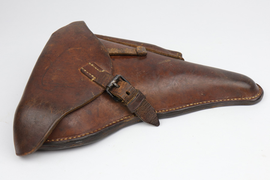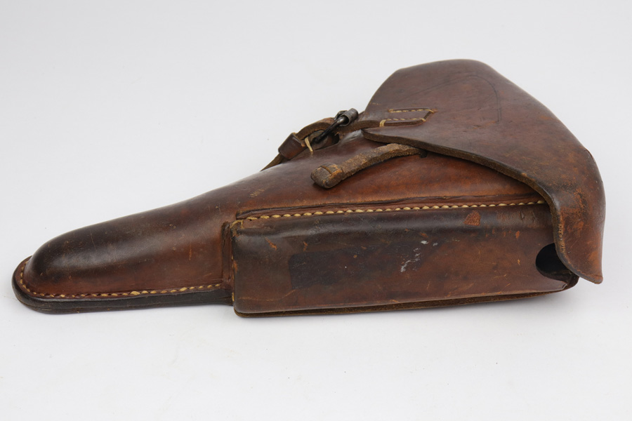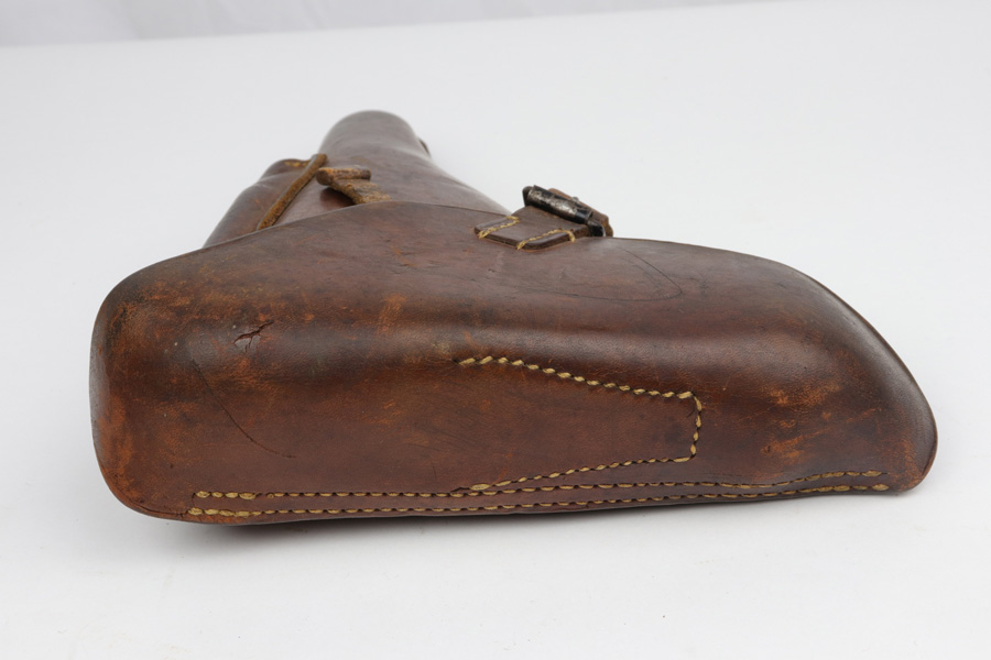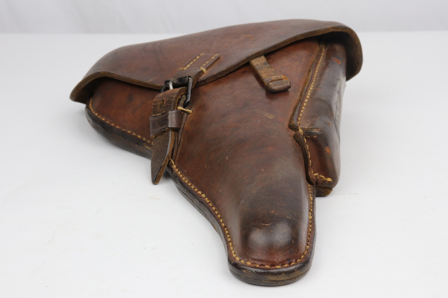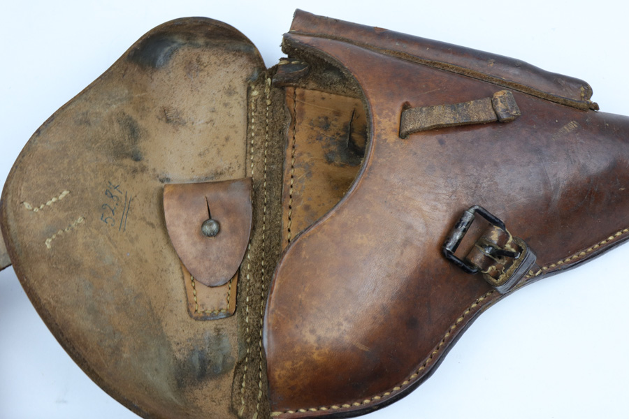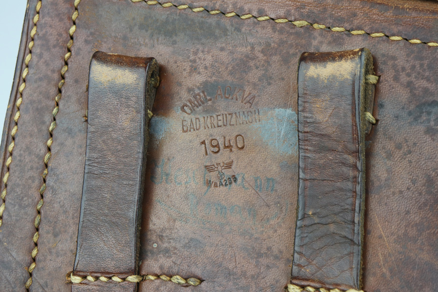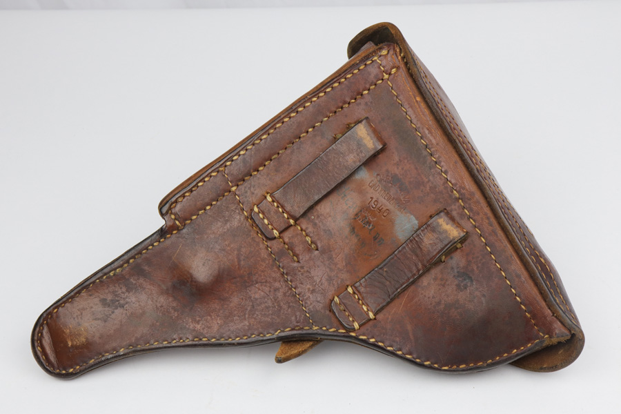 5/24/19 – This is an original 1940 dated holster made by Carl Ackva. The holster is semi-rare as it’s brown leather and not black like most that were made during 1940. The holster has some scuffing on the top leather and magazine pouch, as well as light spotty discoloration in areas, but this is mostly normal wear from aging and use. All original leather and stitching. Interior leather has spotting as well – as shown in photos. Generally this holster is in great condition and doesn’t have any major flaws. Strong date stamp, waffen stamp, and maker stamp.