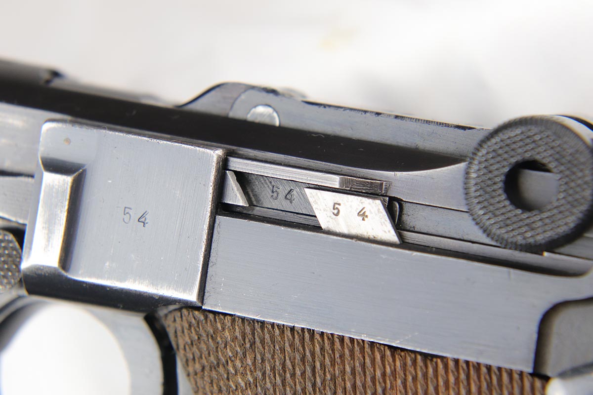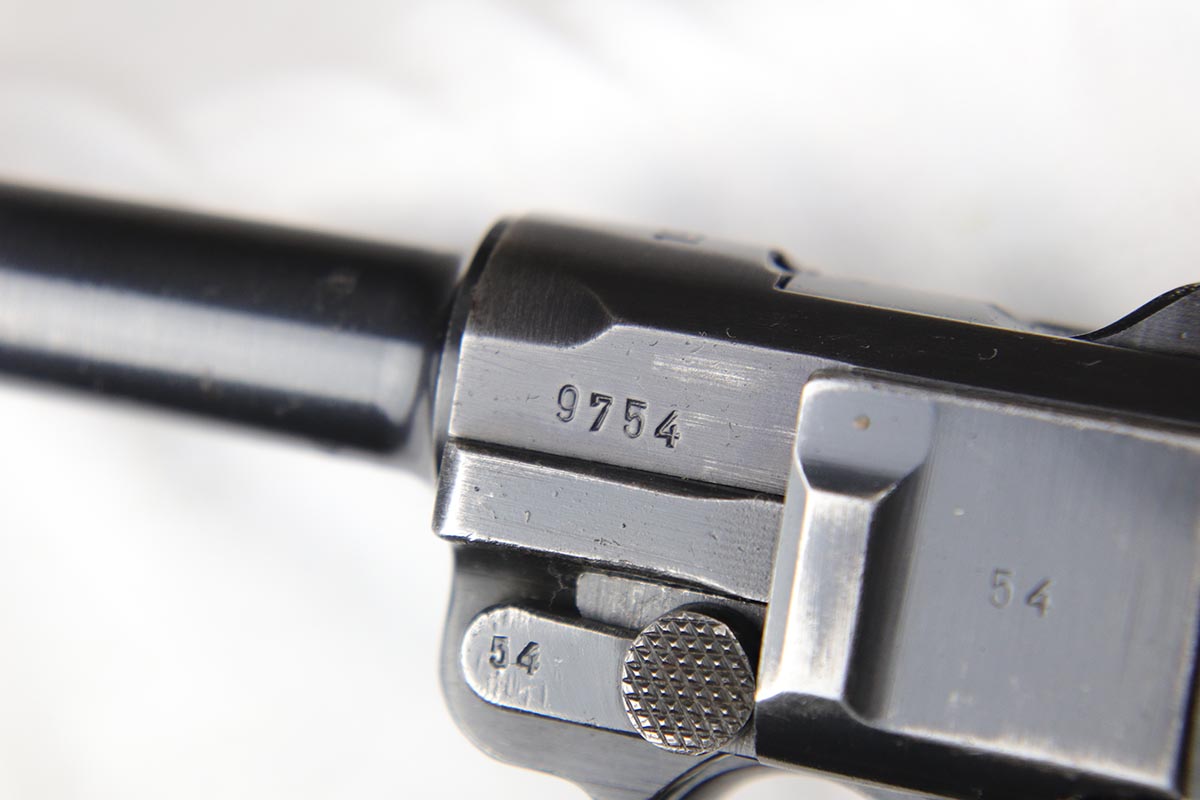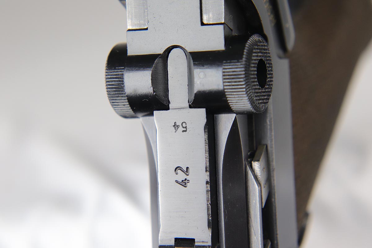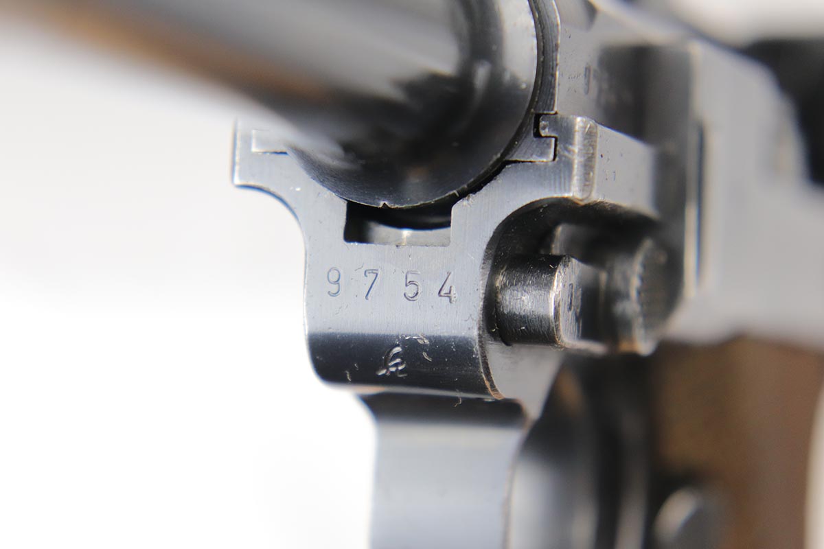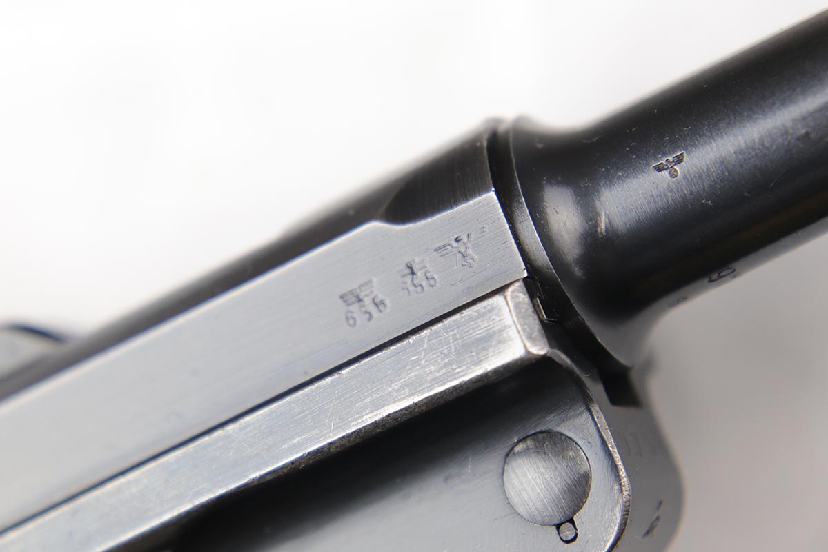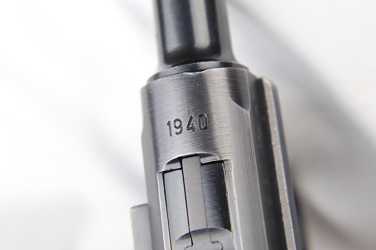 4/21/18 – This is an original 1940 dated “42 Code” Mauser Luger. The pistol was made in 1940 by Mauser and given the “42” code to hide production numbers. The pistol is all original, fully functional and matching. The overall condition is about 95% with some light edge wear and muzzle wear. There is some bluing loss on the barrel and side plate, as well as a few light ping marks on the takedown lever. The straps are beautiful though with very minimal wear. The grips are original and period correct but not numbered on the interior. The bore has some light patina within the grooves, but overall a very nice bore. The magazine is eagle/655 proofed which is correct for this pistol.