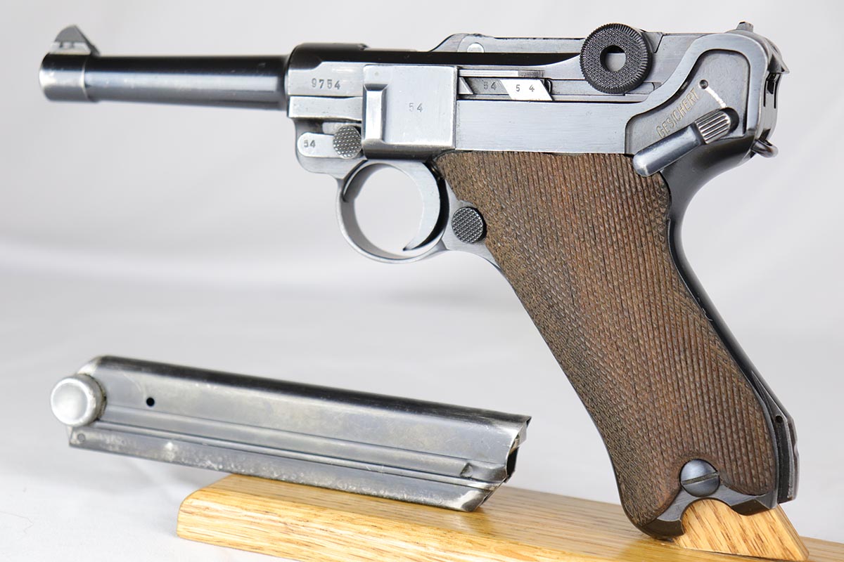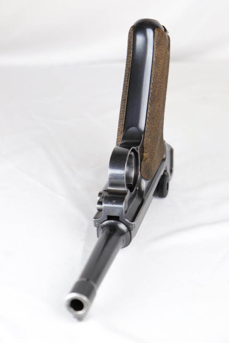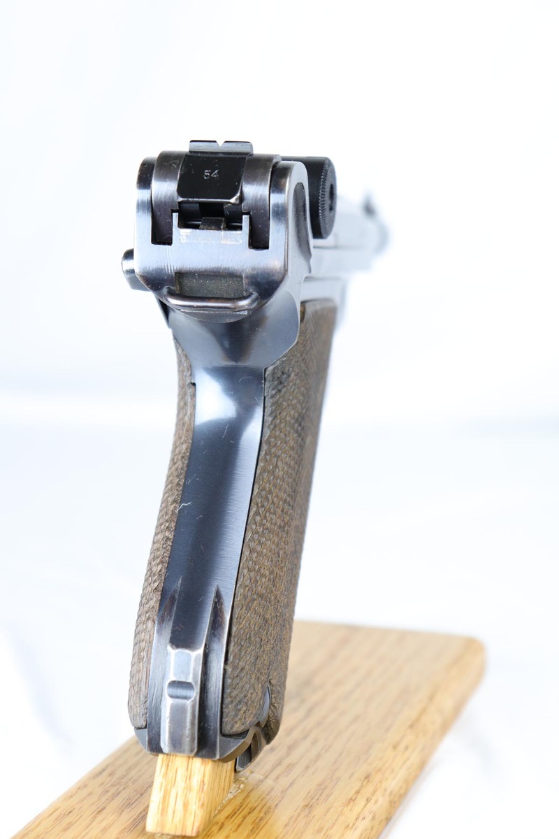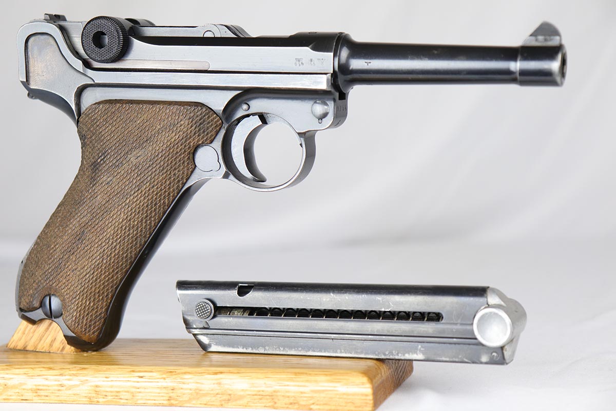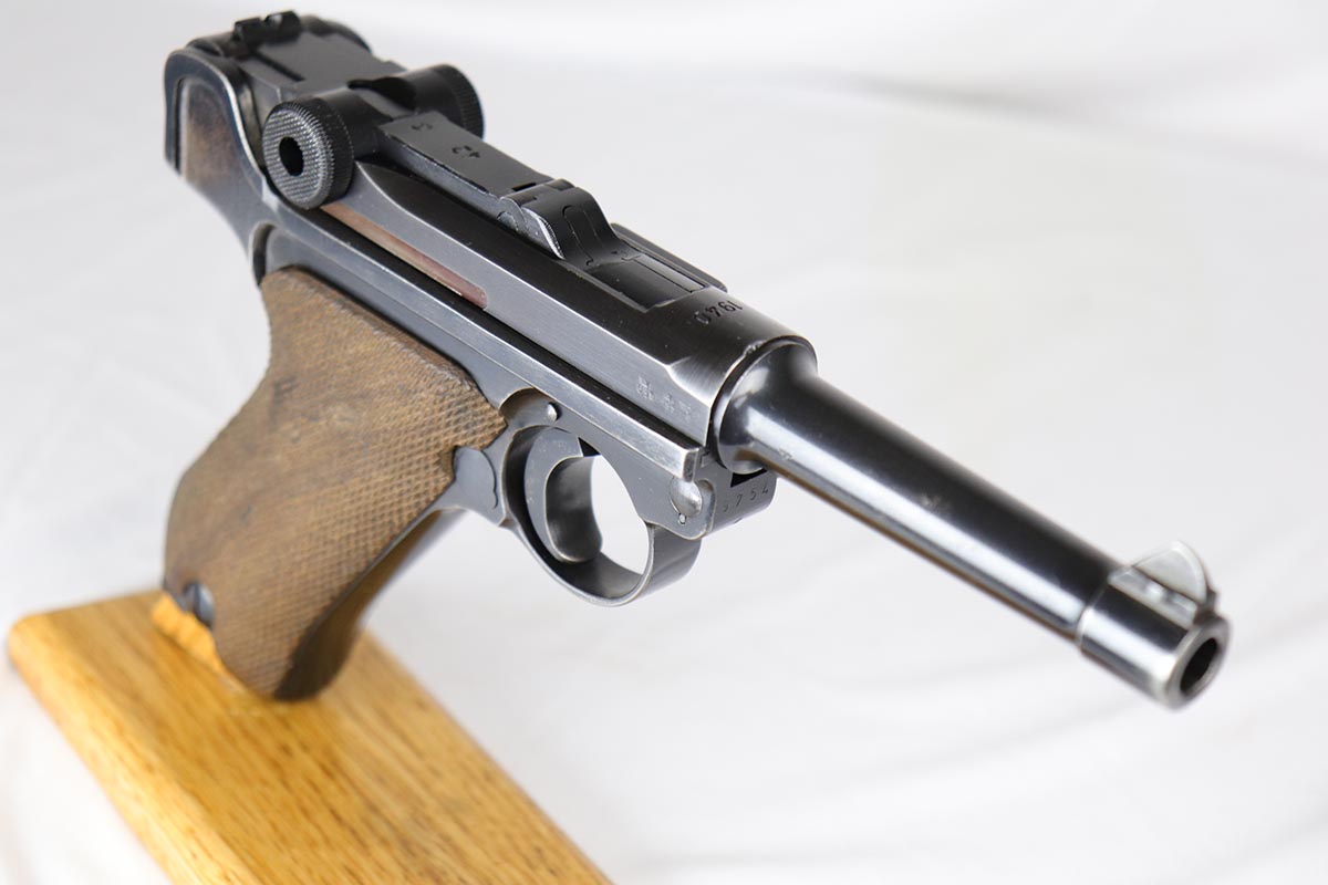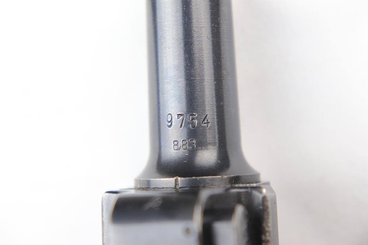 4/21/18 – This is an original 1940 dated “42 Code” Mauser Luger. The pistol was made in 1940 by Mauser and given the “42” code to hide production numbers. The pistol is all original, fully functional and matching. The overall condition is about 95% with some light edge wear and muzzle wear. There is some bluing loss on the barrel and side plate, as well as a few light ping marks on the takedown lever. The straps are beautiful though with very minimal wear. The grips are original and period correct but not numbered on the interior. The bore has some light patina within the grooves, but overall a very nice bore. The magazine is eagle/655 proofed which is correct for this pistol.