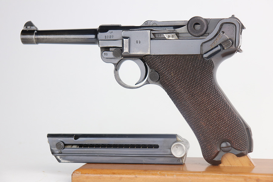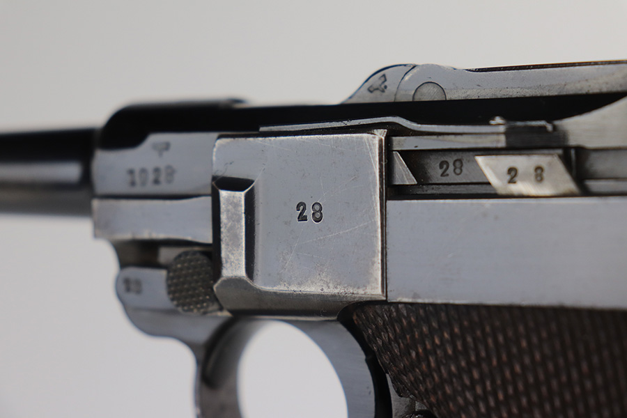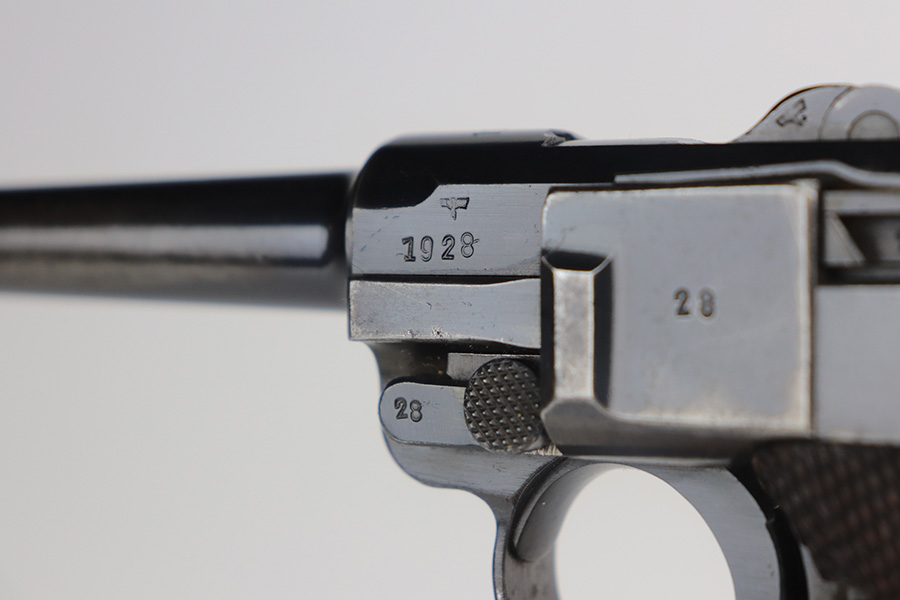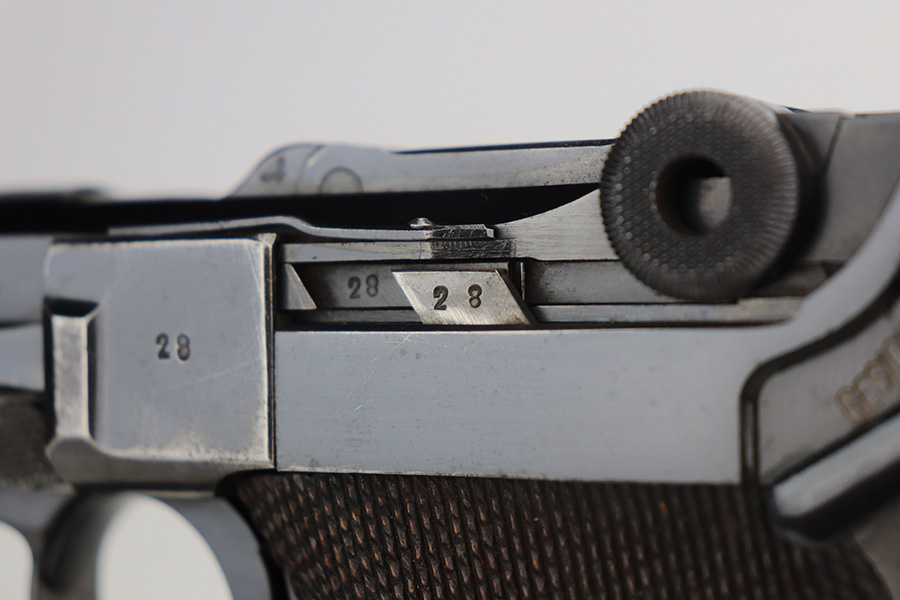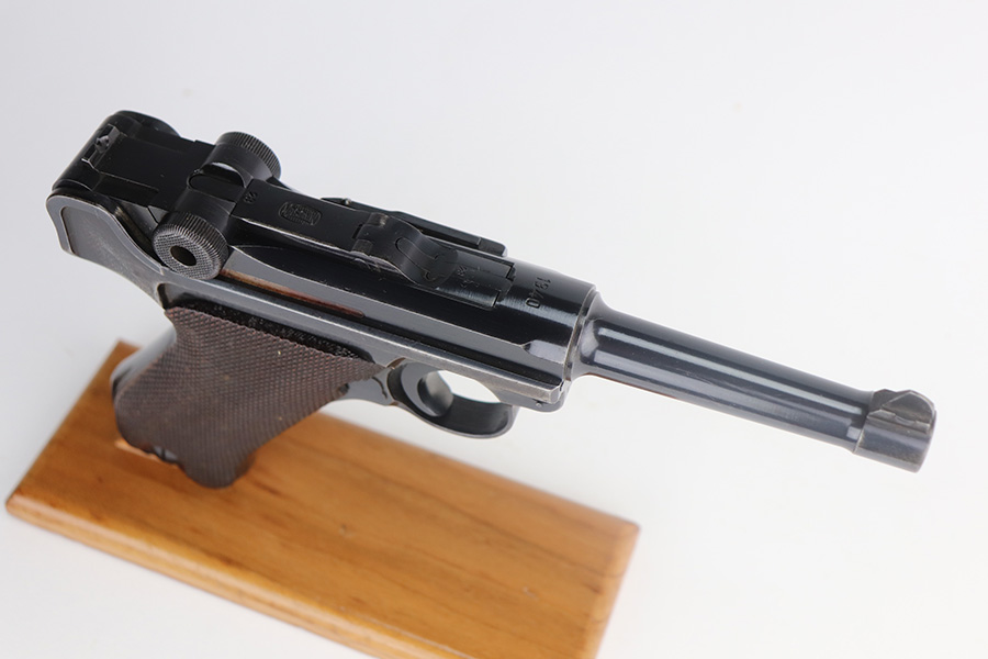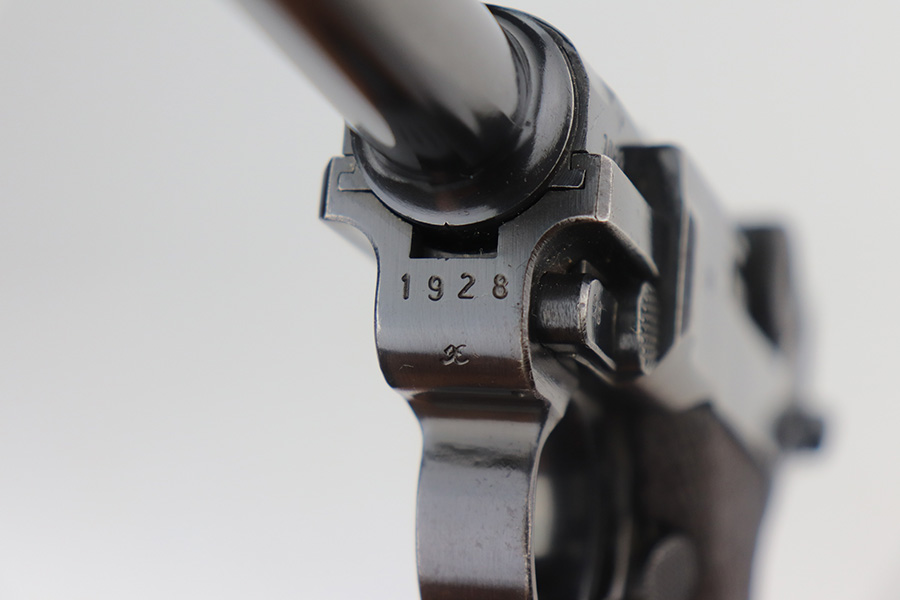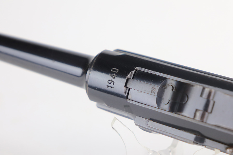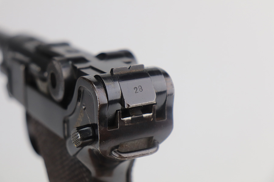 5/26/21 – This is a very nice example of a Mauser Banner Luger issued to the Nazi police force in 1940. There is a police sear safety but no police markings. It is, however, in the “Eagle C” range. In any case, the gun is all matching and comes with a matching magazine. It has retained about 91-92% of its original finish. There is minor wear on the side plate, side rails, and around the muzzle. Thinning on the straps. Tiny dots of oxidation throughout. Scratchy wear at the base of the front strap. Some light scratches on the side plate and left side of the frame. Comes with excellent waffen-proofed grips. Minty bore.