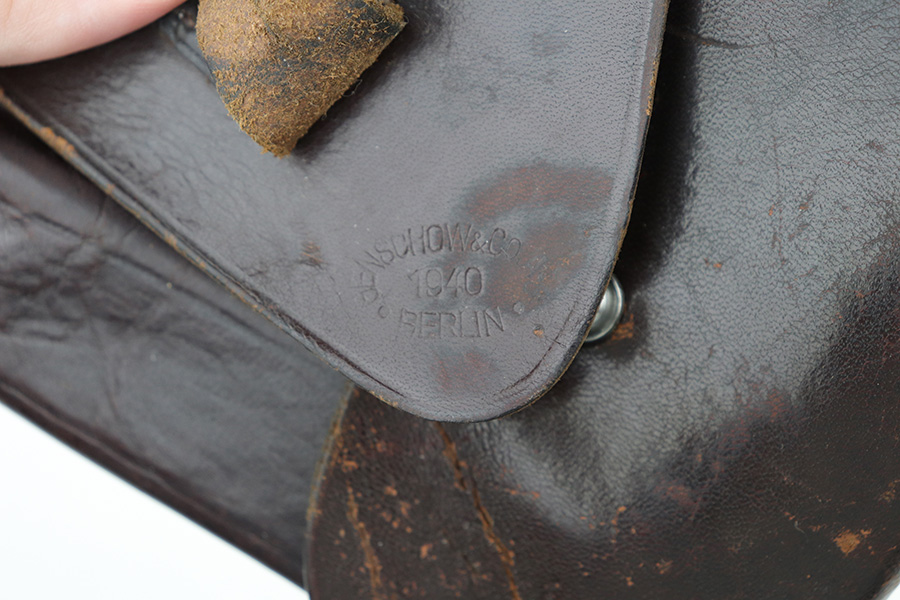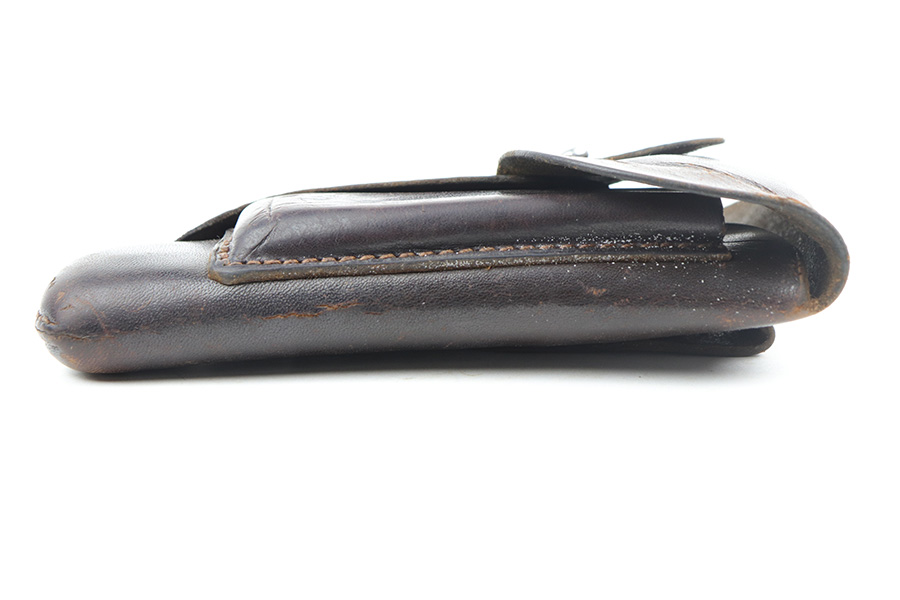 8/30/21 – This is a fairly rare 1940 dated holster for a Mauser HSC pistol. The holster is maker stamped and dated under the closure strap. The interior leather shows a faint Mauser ink stamp, where the “M” is the most visible letter of the stamp (mostly faded out). There’s also a waffen proof stamp on the closure strap. The leather has some mild surface cracking on the front, just above the magazine pouch location (seen in first photo). However the leather is in tact and in good overall condition. No stitching issues.