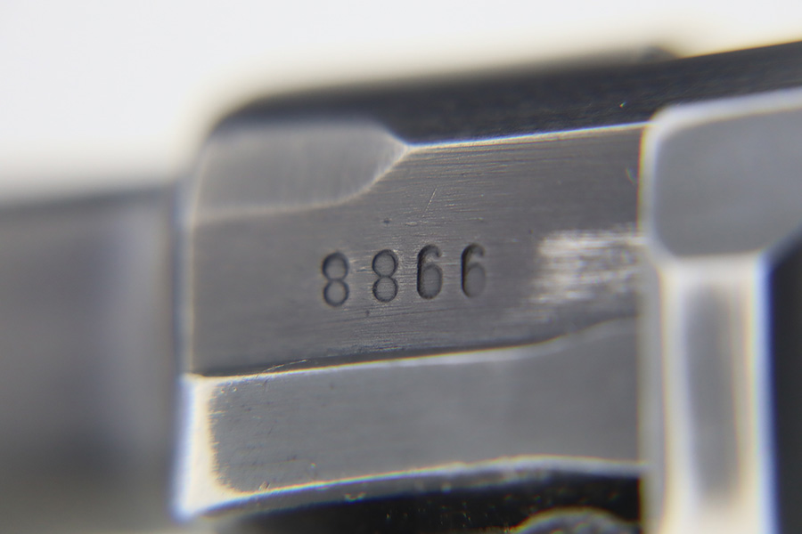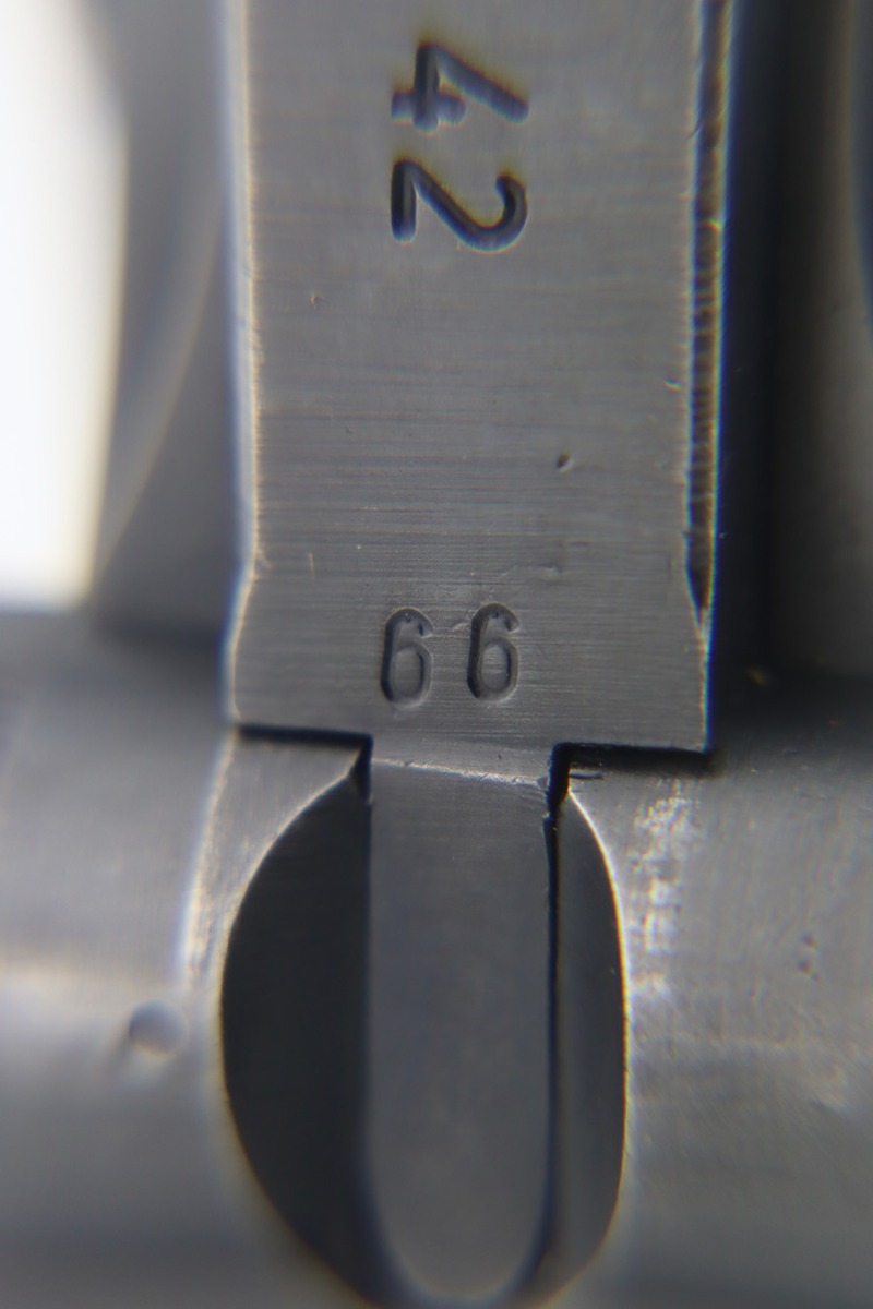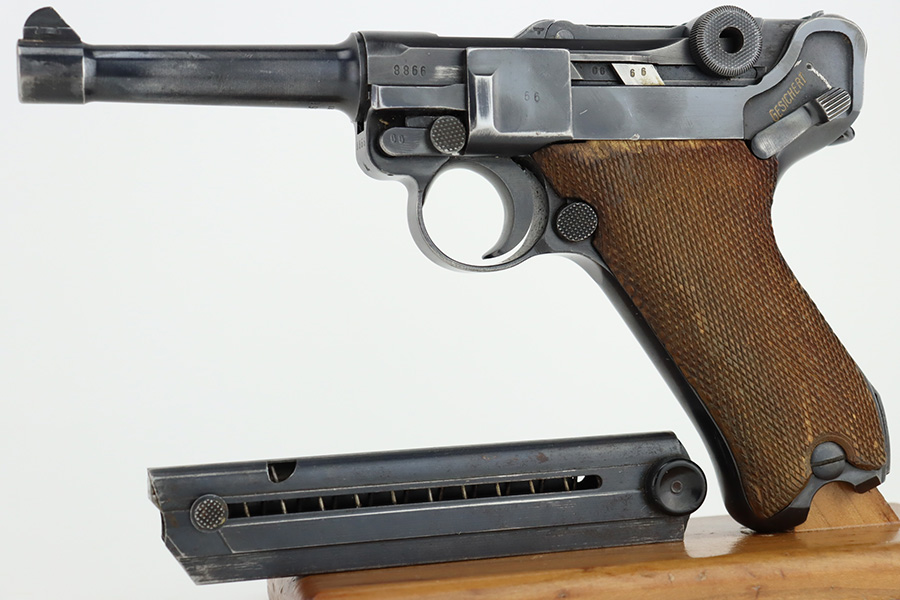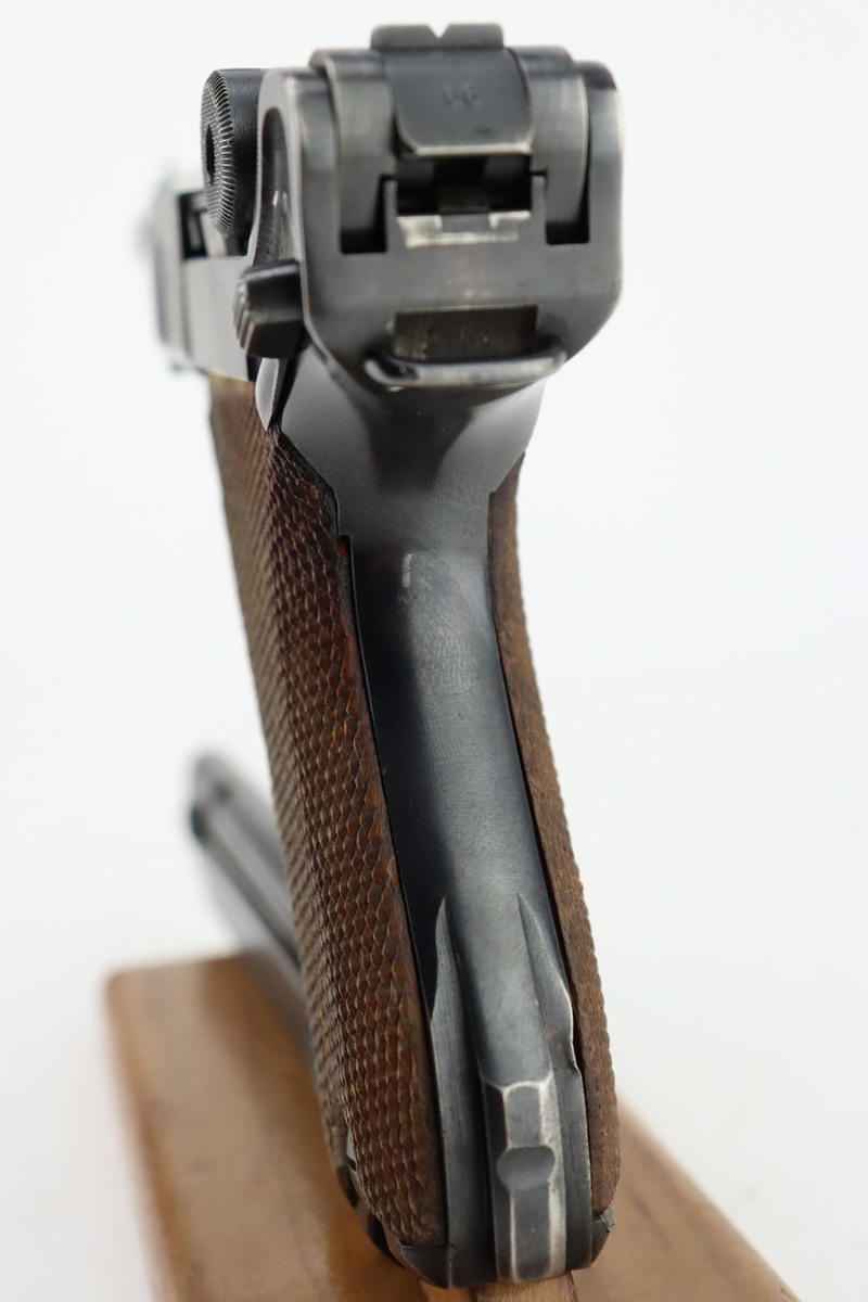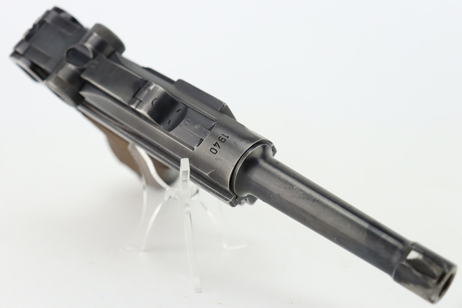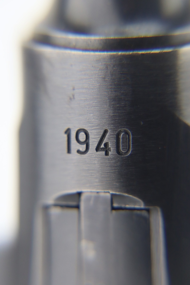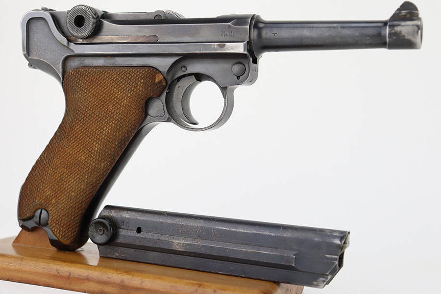 1/18/24 – This is a very nice example of a “42 Code” Mauser Luger issued to the Nazi military in 1940. It is all matching and has the proper “Eagle 655” Nazi military acceptance proofs. It has retained about 93% of its original bluing. There is wear around the muzzle, along the barrel, and on some of the high edges. Fitted with un-numbered “Eagle 655” proofed wood grips – there are hairline cracks on both sides, but only visible from the inside. Comes with an original black widow magazine – tiny chip in the base. Very nice bore with good rifling.
