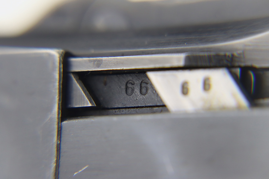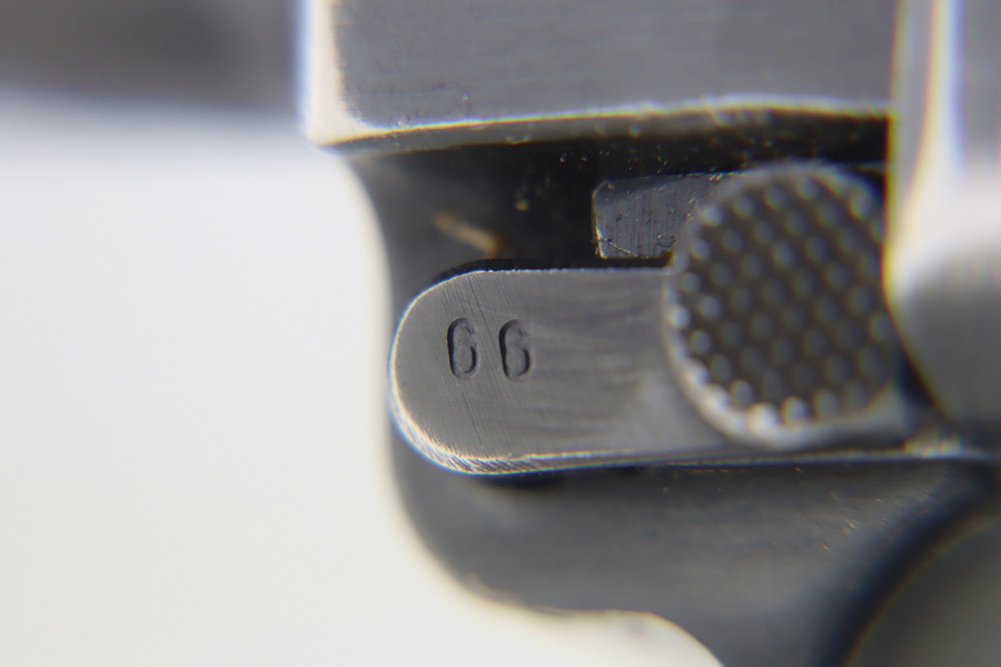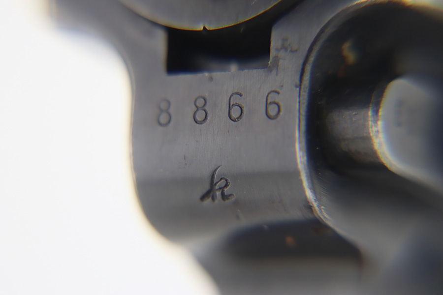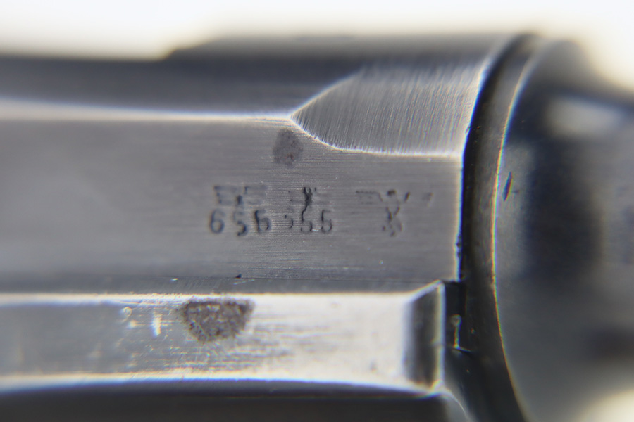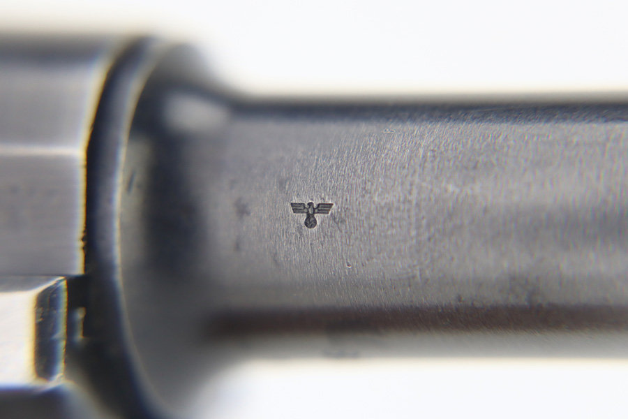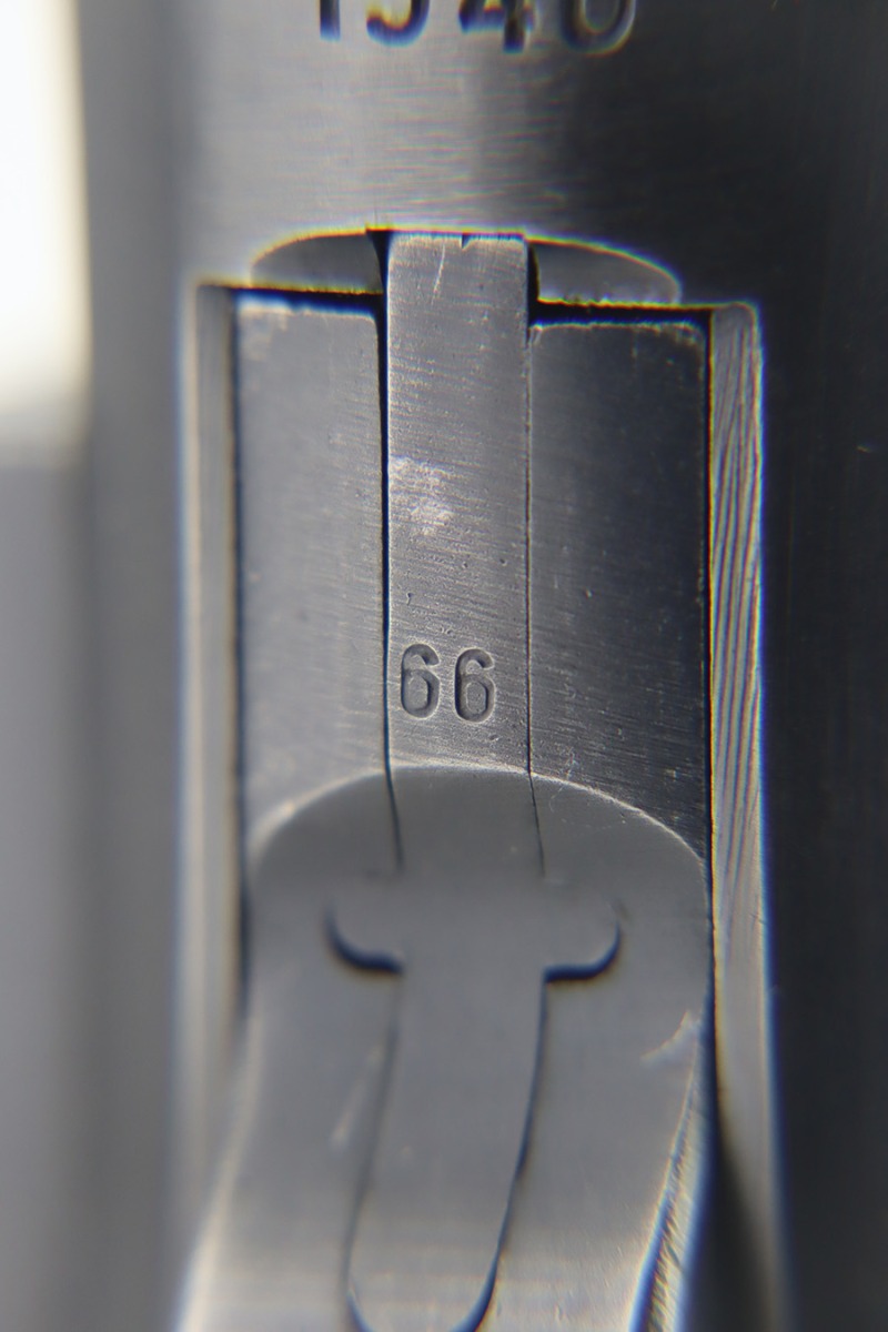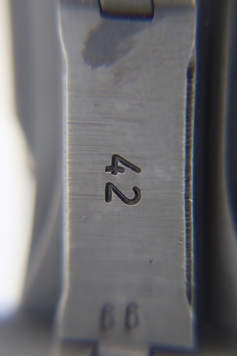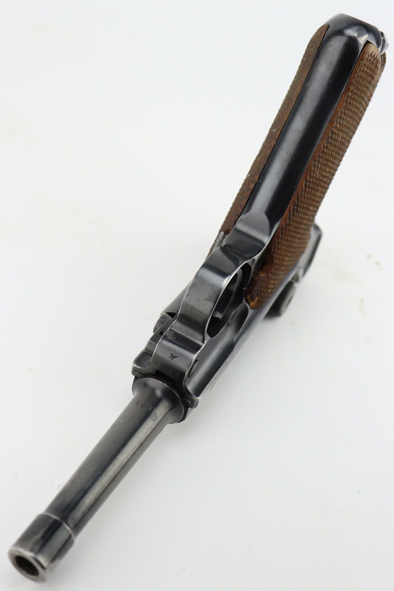 1/18/24 – This is a very nice example of a “42 Code” Mauser Luger issued to the Nazi military in 1940. It is all matching and has the proper “Eagle 655” Nazi military acceptance proofs. It has retained about 93% of its original bluing. There is wear around the muzzle, along the barrel, and on some of the high edges. Fitted with un-numbered “Eagle 655” proofed wood grips – there are hairline cracks on both sides, but only visible from the inside. Comes with an original black widow magazine – tiny chip in the base. Very nice bore with good rifling.