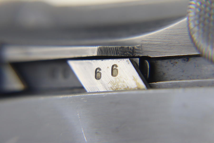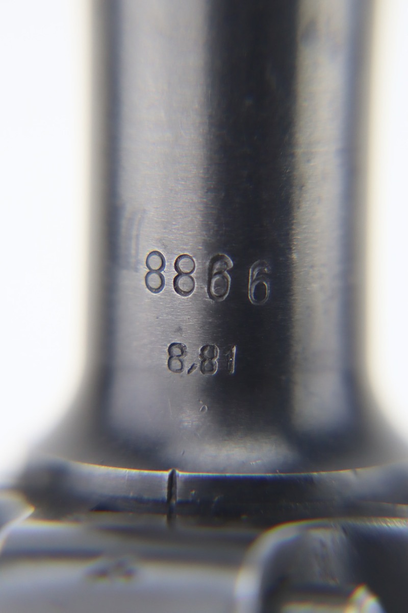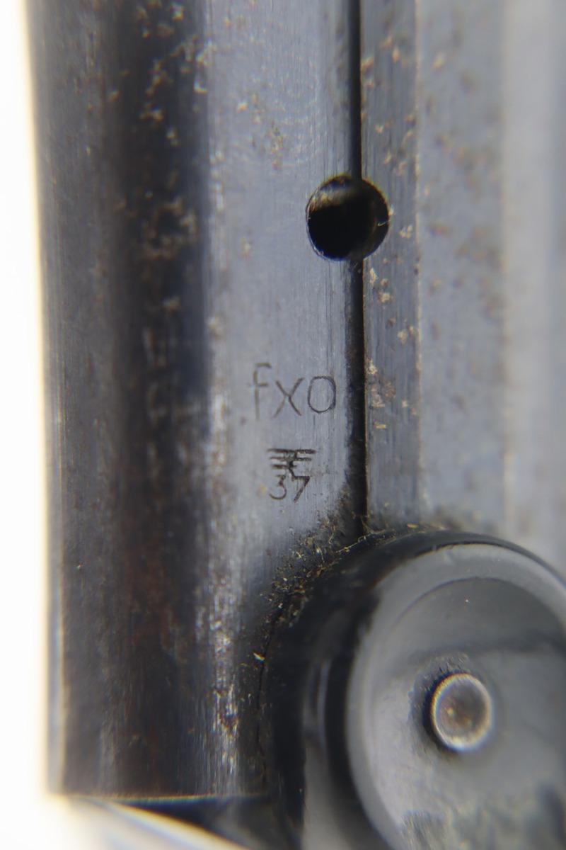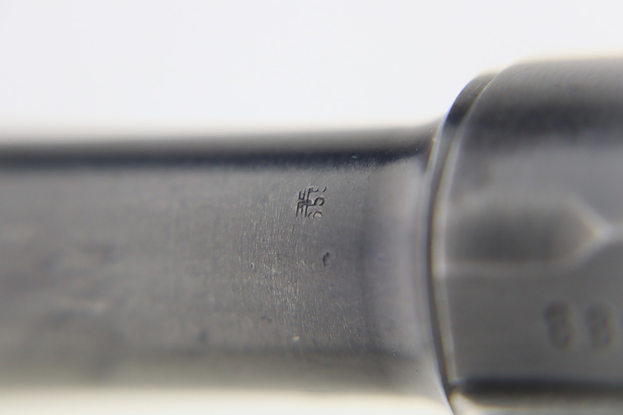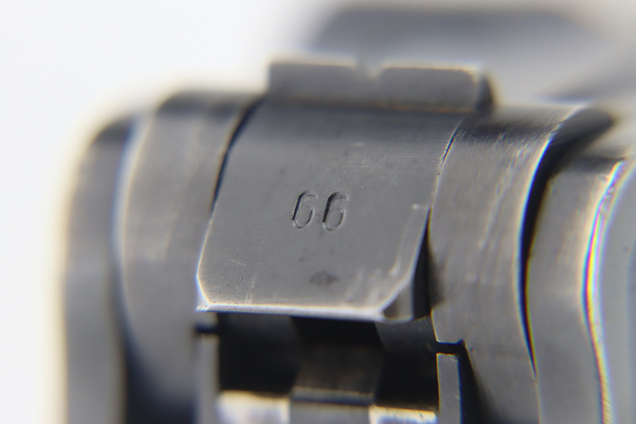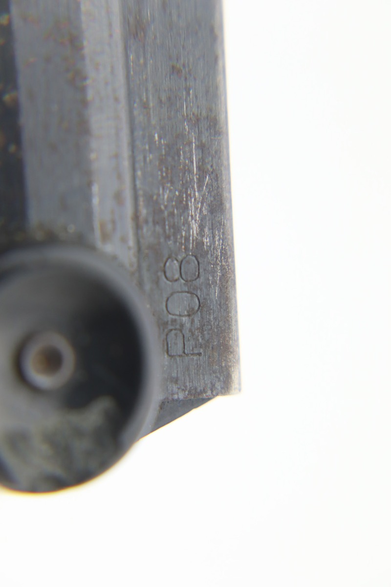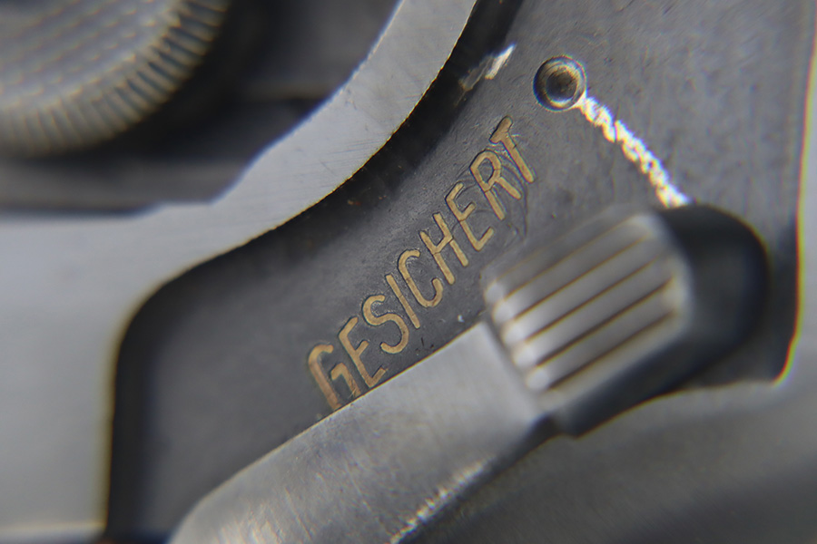 1/18/24 – This is a very nice example of a “42 Code” Mauser Luger issued to the Nazi military in 1940. It is all matching and has the proper “Eagle 655” Nazi military acceptance proofs. It has retained about 93% of its original bluing. There is wear around the muzzle, along the barrel, and on some of the high edges. Fitted with un-numbered “Eagle 655” proofed wood grips – there are hairline cracks on both sides, but only visible from the inside. Comes with an original black widow magazine – tiny chip in the base. Very nice bore with good rifling.