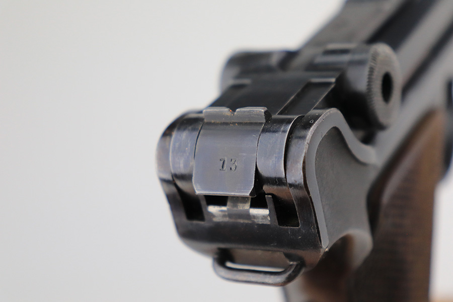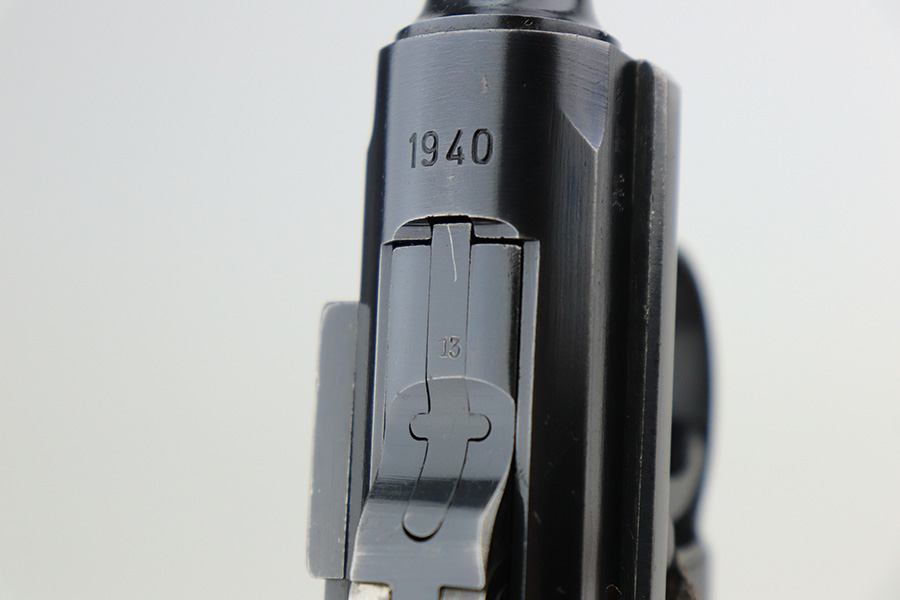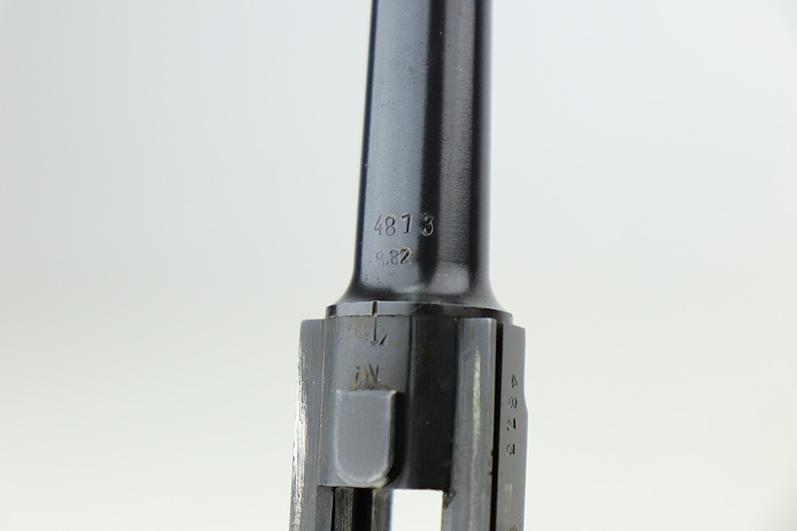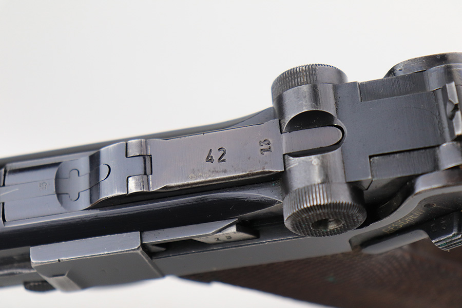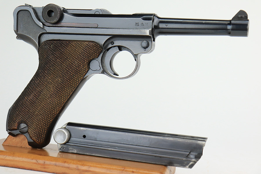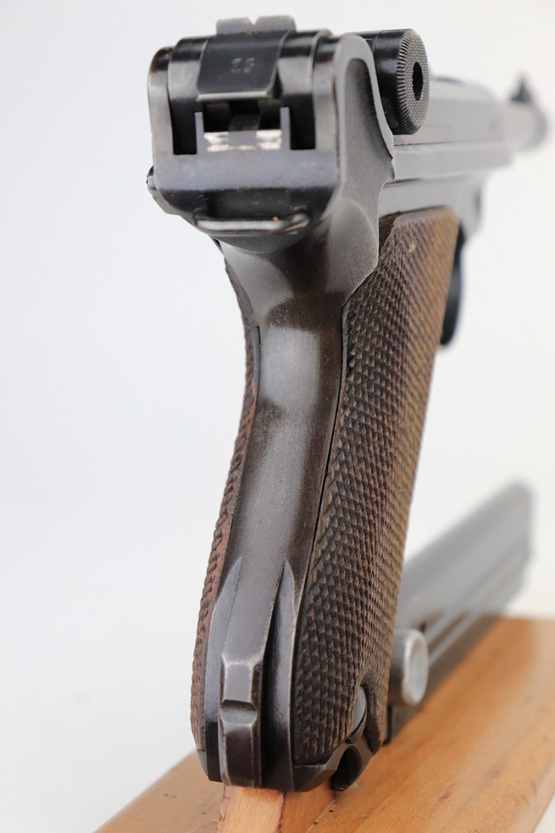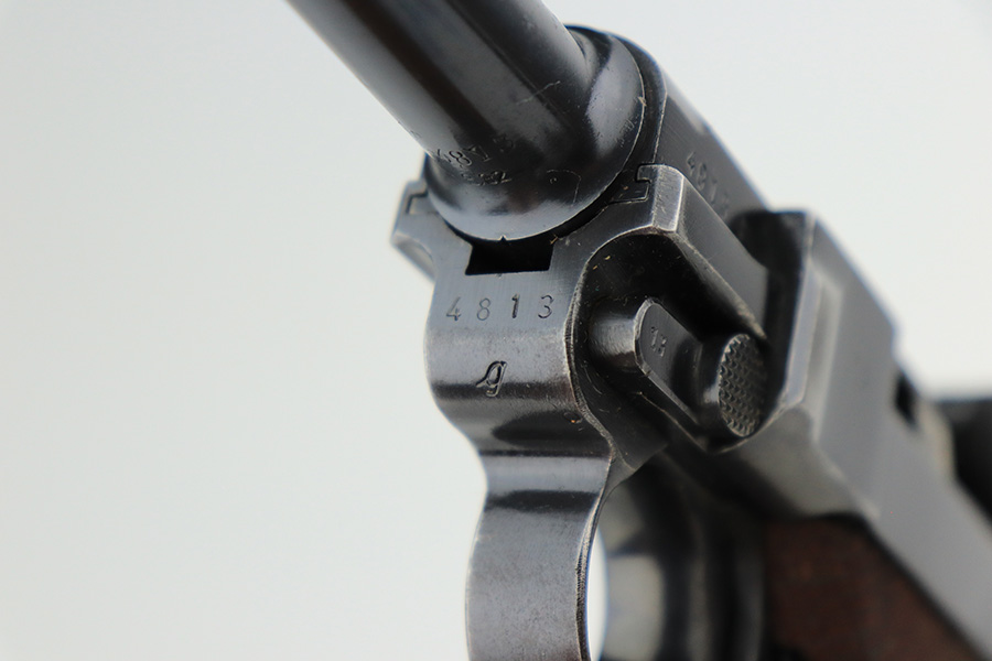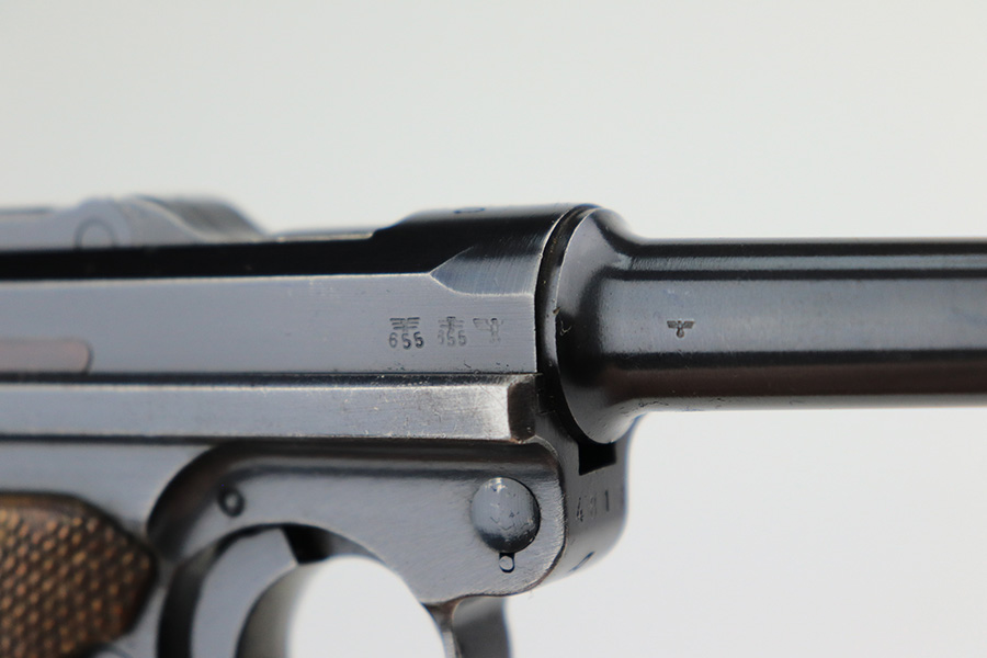 4/22/22 – This is an all matching and original Army Mauser Luger from 1940. All numbered parts of the pistol match, including the original grips. Firing pin, hold open and toggle pin are all numbered and matching, as well. The pistol has 90% of the original blue remaining with a very nice profile, showing standard bluing loss on the sideplate, right side rail and left side of the muzzle (likely holster wear). The straps show some general patina and dulling, also. Bore is fairly shiny with strong rifling but has a little frost throughout the grooves. The grips have sharp checkering and no cracks or chips. Period original but mismatched magazine.