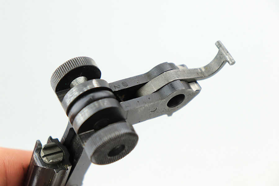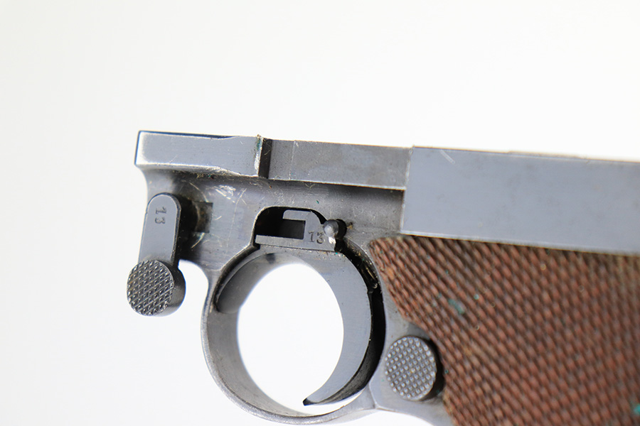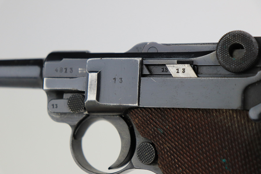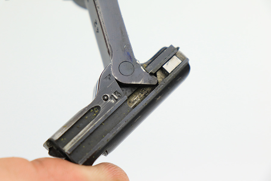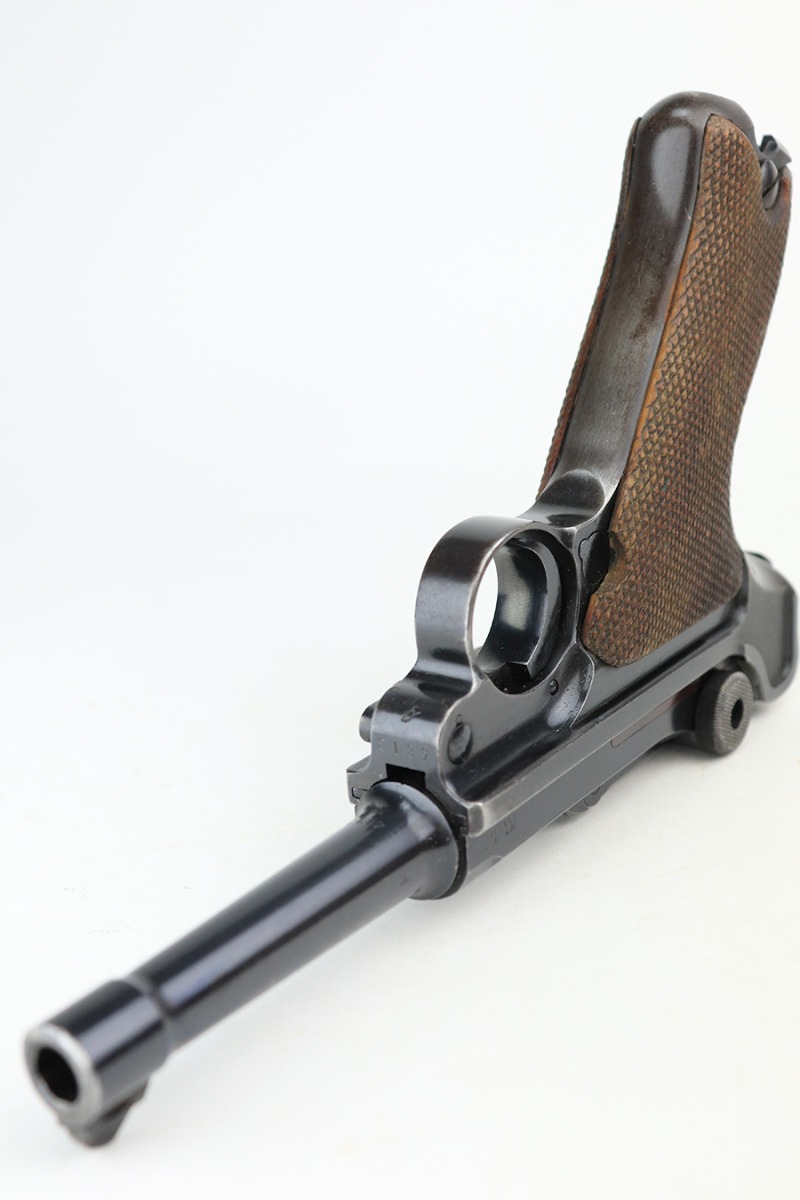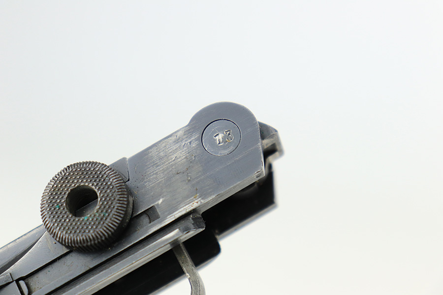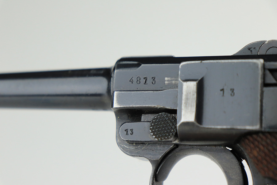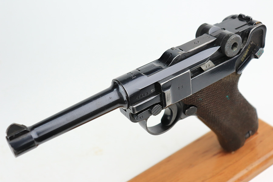 4/22/22 – This is an all matching and original Army Mauser Luger from 1940. All numbered parts of the pistol match, including the original grips. Firing pin, hold open and toggle pin are all numbered and matching, as well. The pistol has 90% of the original blue remaining with a very nice profile, showing standard bluing loss on the sideplate, right side rail and left side of the muzzle (likely holster wear). The straps show some general patina and dulling, also. Bore is fairly shiny with strong rifling but has a little frost throughout the grooves. The grips have sharp checkering and no cracks or chips. Period original but mismatched magazine.