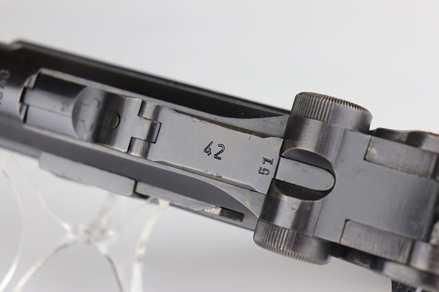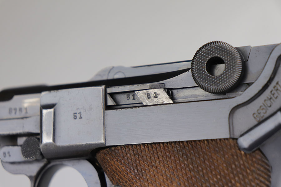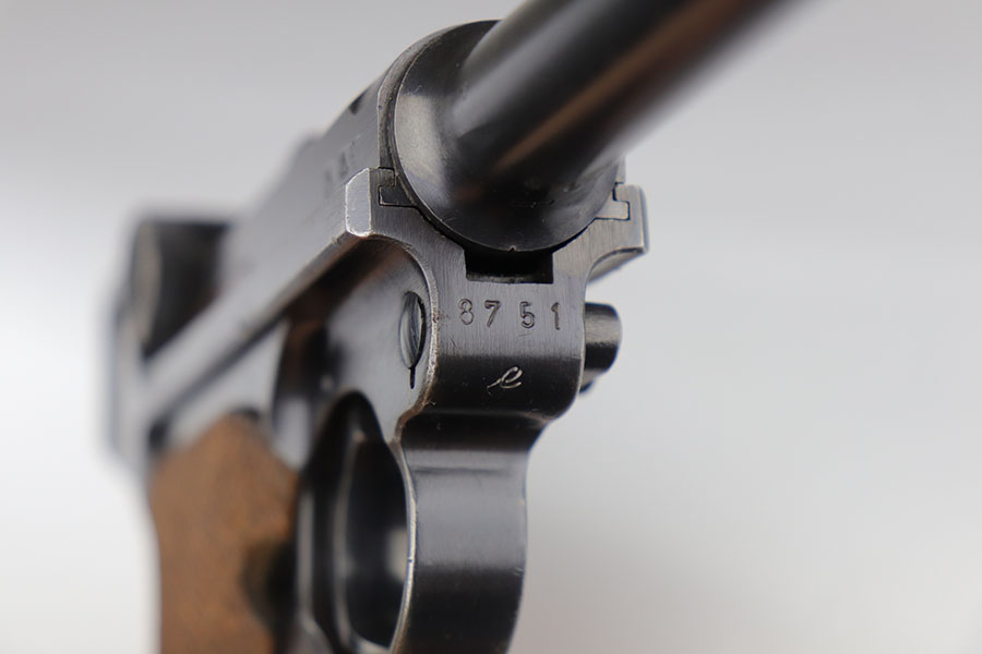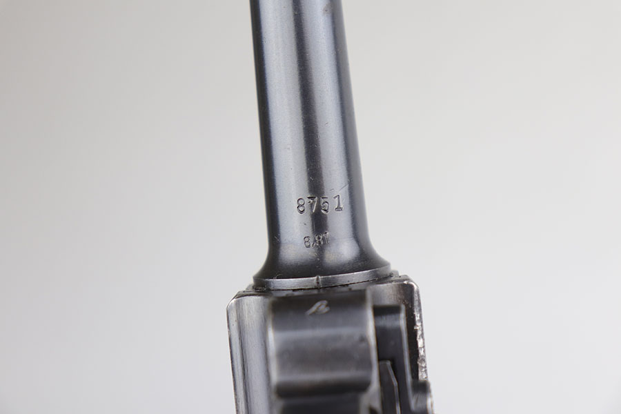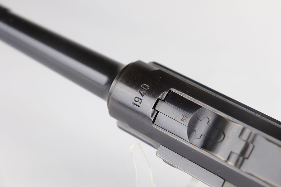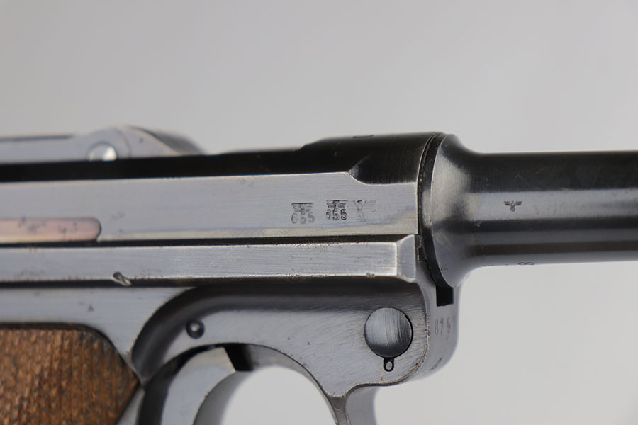 7/21/20 – This is an all matching and original Mauser Luger from 1940, including the magazine. It has about 93-94% of the original blue with high edge wear on the muzzle, sideplate, right side rail and trigger guard. There are also very minor areas of freckling on the sideplate, left side of barrel and ejector. The grips are minty and fit perfectly but are unmarked. Bore would be near mint except it wasn’t cleaned properly so there is some freckling near the muzzle end.