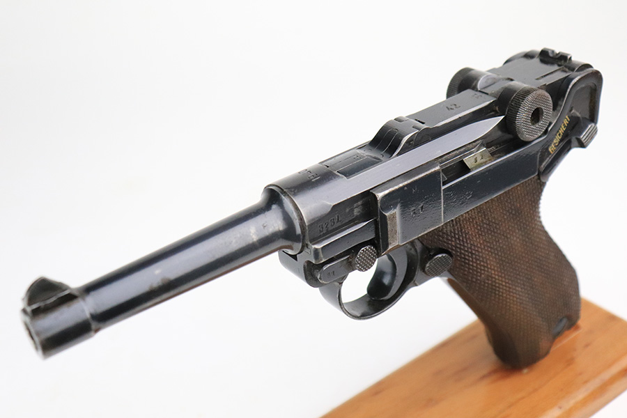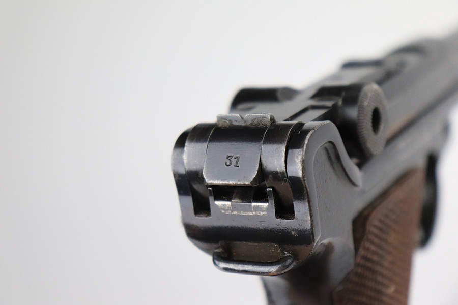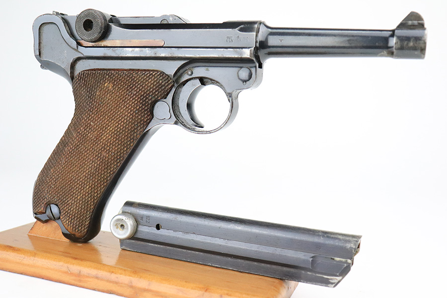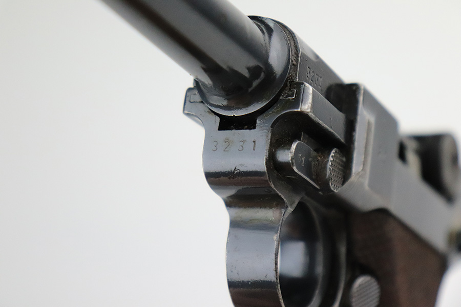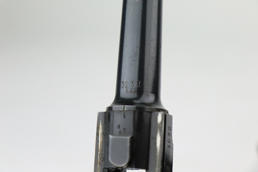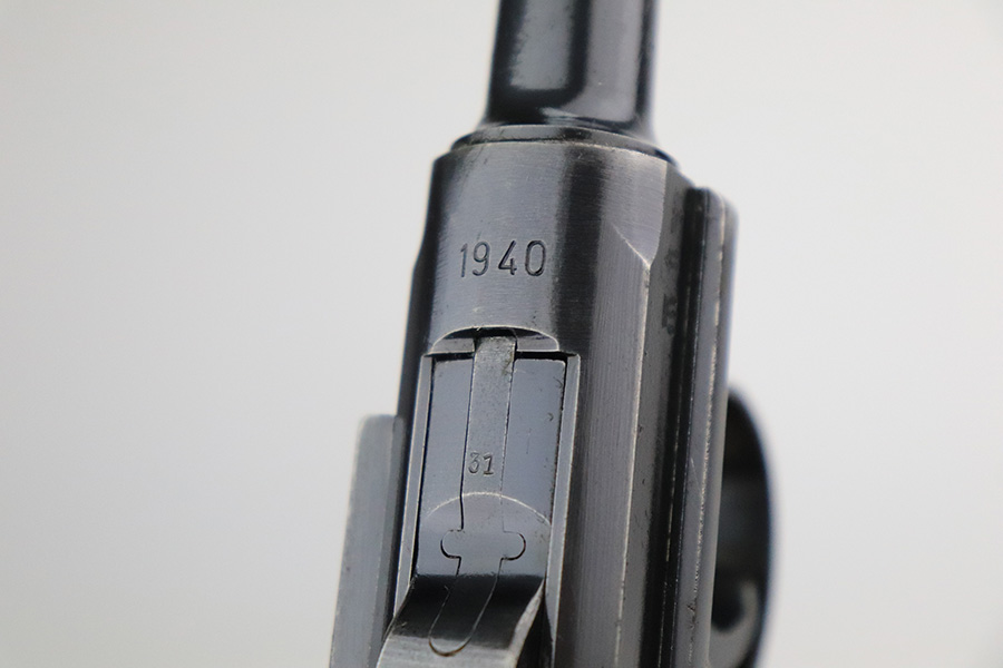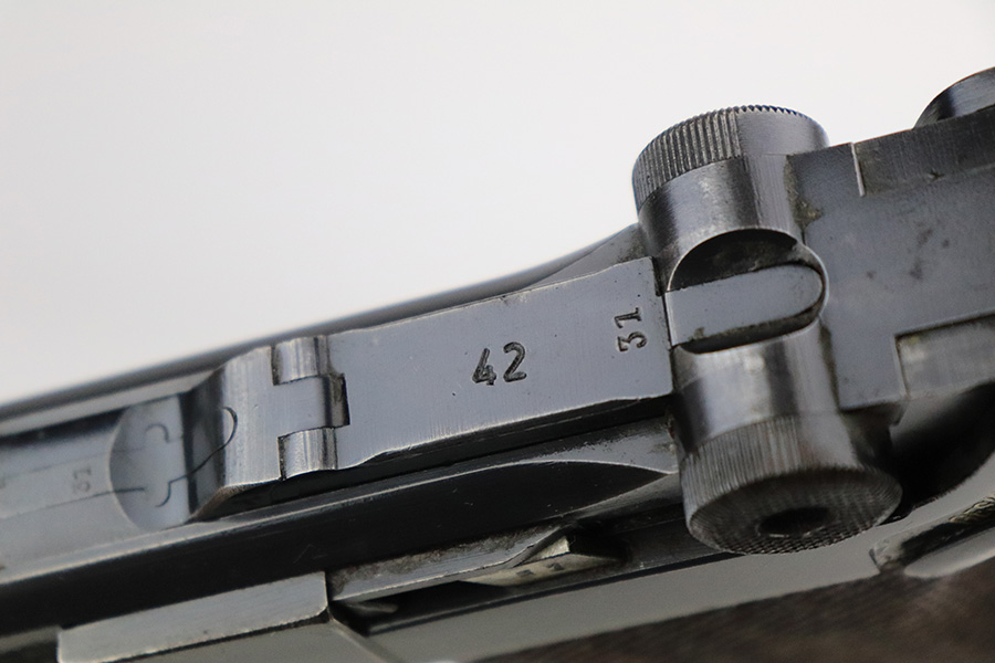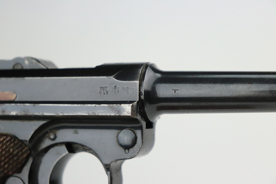 7/18/22 – This is an excellent example of a Mauser Luger issued to the Nazi military in 1940. It is all matching, has a “42” Mauser factory code on the toggle, and has the proper “Eagle 655” military acceptance proofs. It also comes with one original matching-numbered magazine. The gun has retained about 94-95% of its original bluing. Areas of minor wear on the side plate and on the side rails. Splotchy discoloration around the muzzle and some thinning along the barrel. Some light freckling on the grip straps. There are areas with small dots of oxidation here and there. Comes with excellent matching-numbered wood grips. The bore is shiny and has very strong rifling with very light freckling here and there.