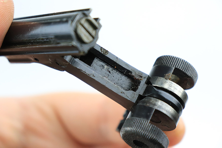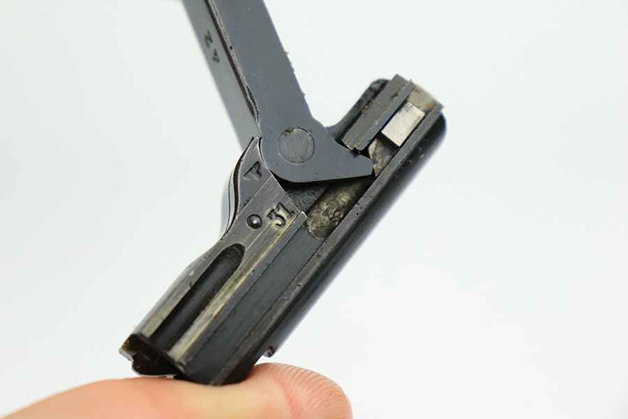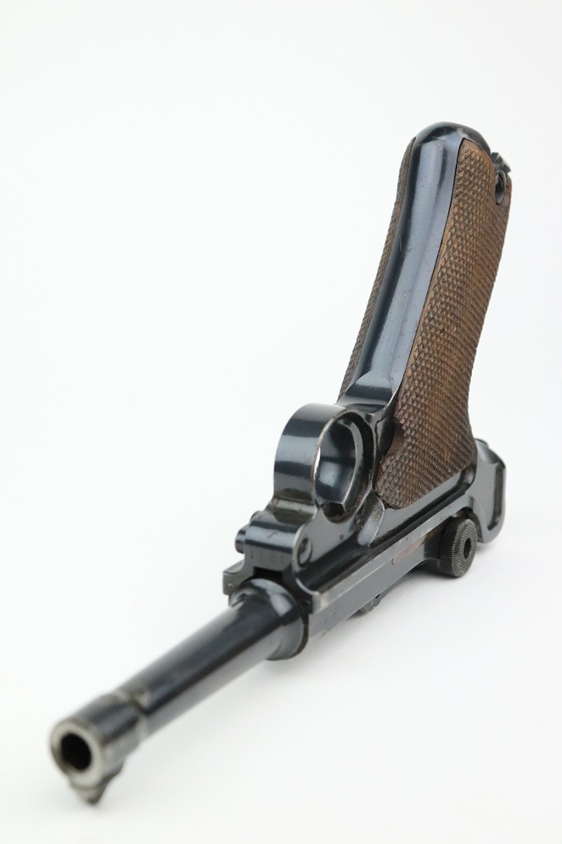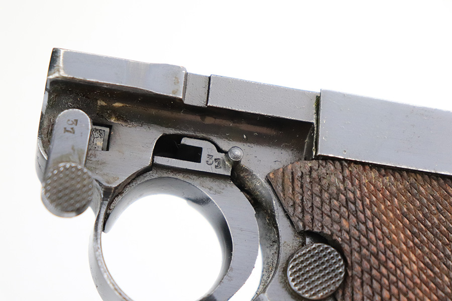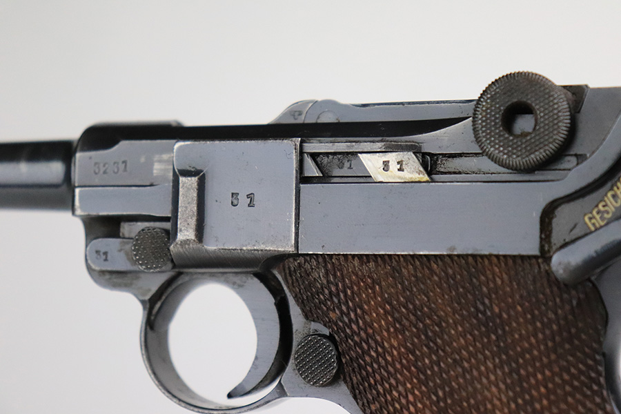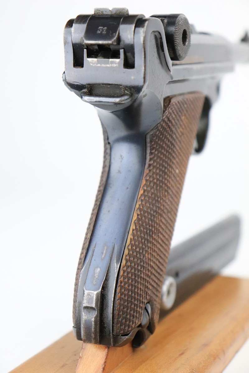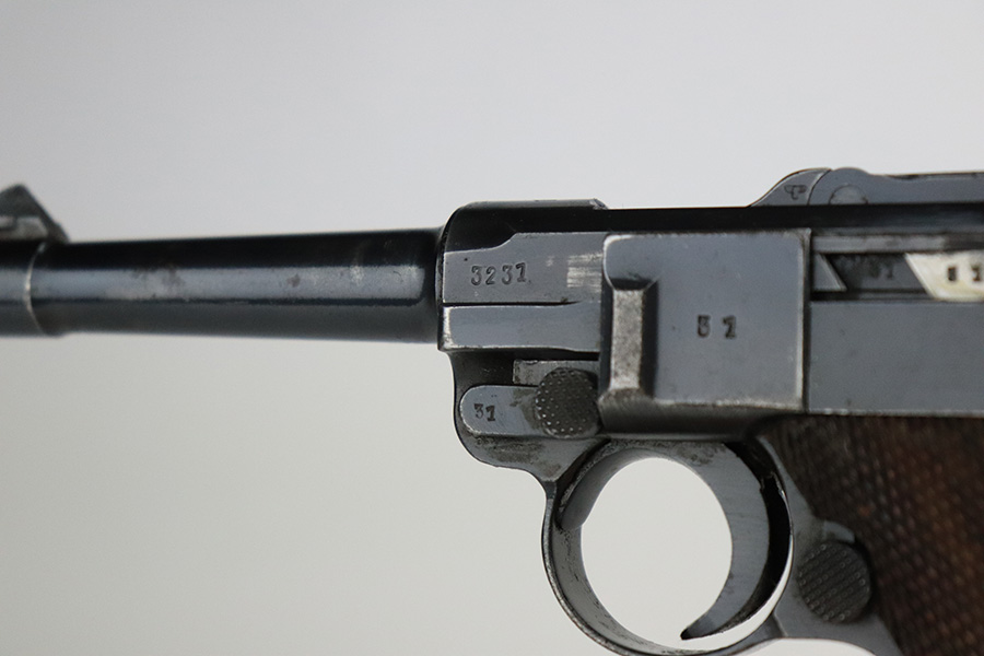 7/18/22 – This is an excellent example of a Mauser Luger issued to the Nazi military in 1940. It is all matching, has a “42” Mauser factory code on the toggle, and has the proper “Eagle 655” military acceptance proofs. It also comes with one original matching-numbered magazine. The gun has retained about 94-95% of its original bluing. Areas of minor wear on the side plate and on the side rails. Splotchy discoloration around the muzzle and some thinning along the barrel. Some light freckling on the grip straps. There are areas with small dots of oxidation here and there. Comes with excellent matching-numbered wood grips. The bore is shiny and has very strong rifling with very light freckling here and there.