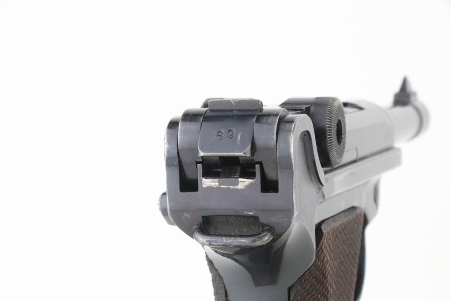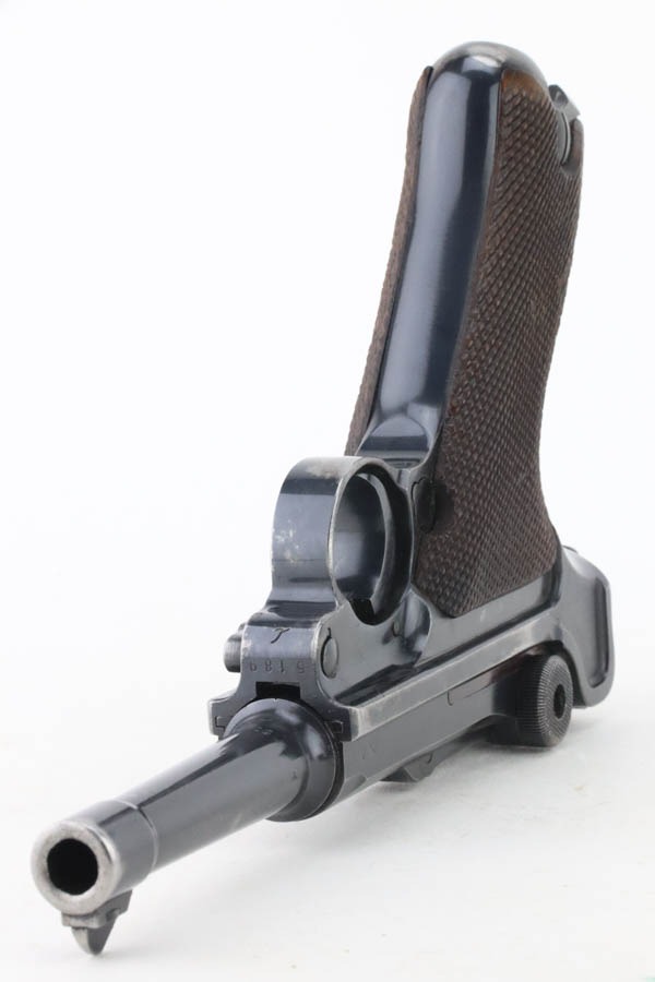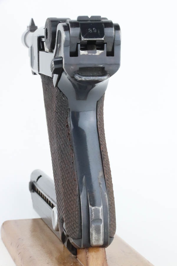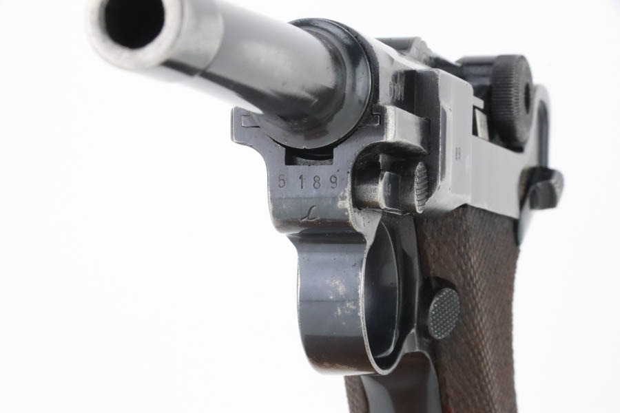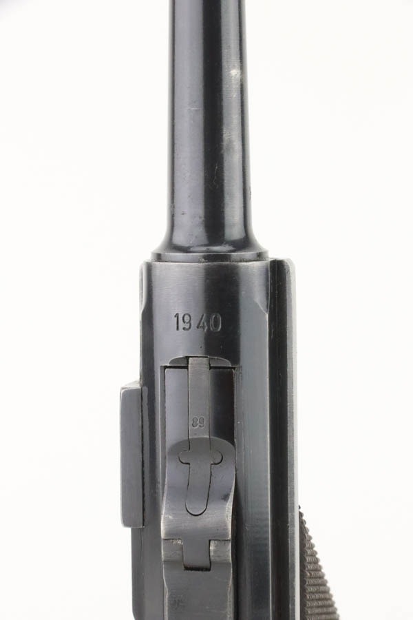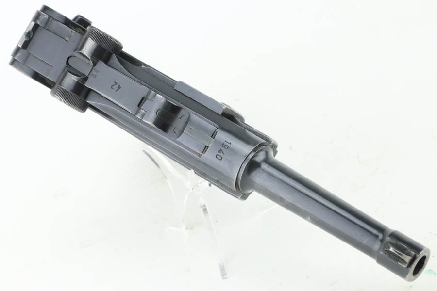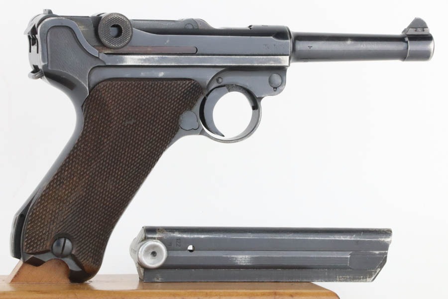 10/15/24 – This is a nice example of a Mauser Luger issued to the Nazi military in 1940. All matching with the proper “Eagle 655” military acceptance proofs. Comes with one original matching-numbered magazine. The gun’s original high polish finish rates roughly 85% with spotty wear mainly on the left side of the gun and underside of the trigger guard. Fitted with excellent “Eagle 655” proofed wood grips. The bore has good rifling, but there is minor frosting throughout.