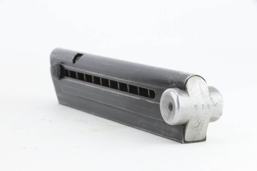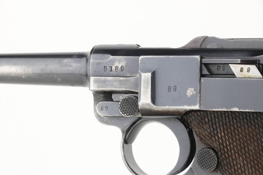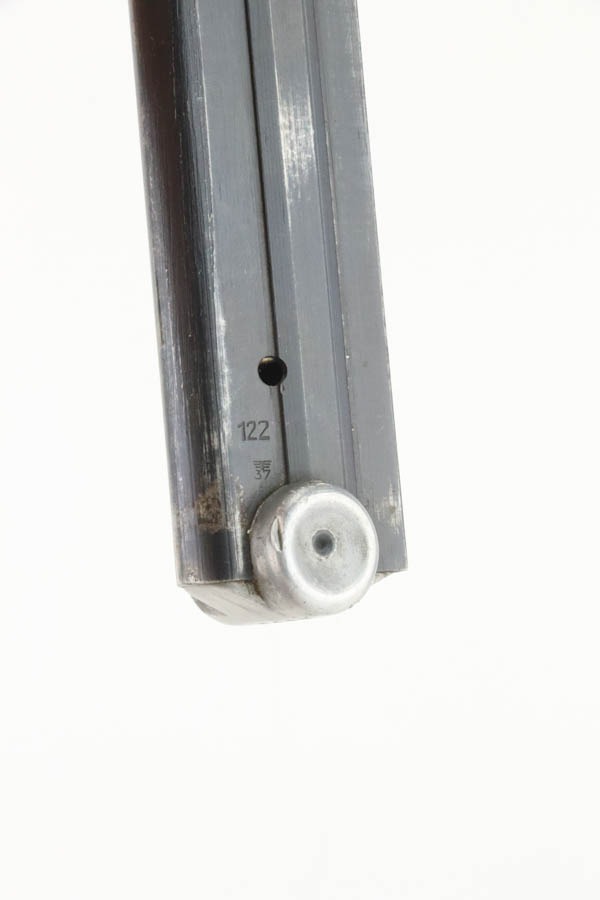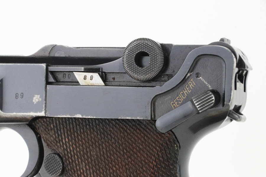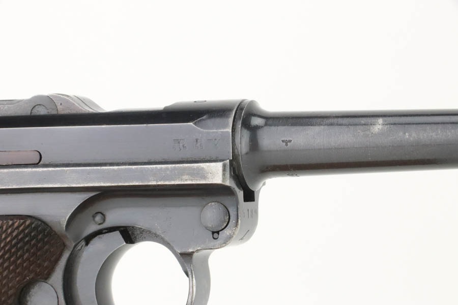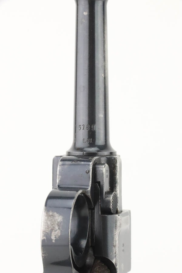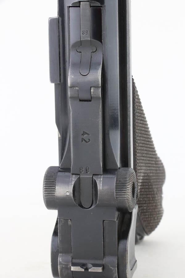 10/15/24 – This is a nice example of a Mauser Luger issued to the Nazi military in 1940. All matching with the proper “Eagle 655” military acceptance proofs. Comes with one original matching-numbered magazine. The gun’s original high polish finish rates roughly 85% with spotty wear mainly on the left side of the gun and underside of the trigger guard. Fitted with excellent “Eagle 655” proofed wood grips. The bore has good rifling, but there is minor frosting throughout.