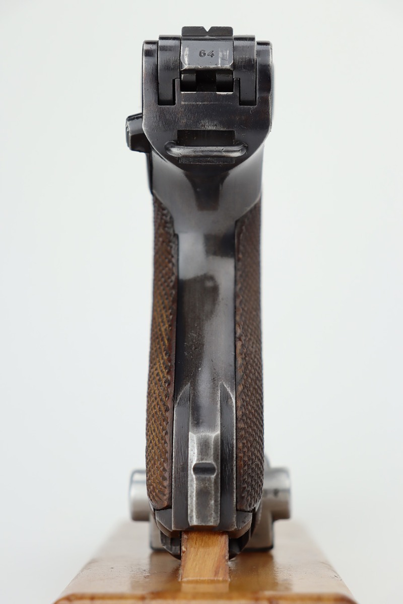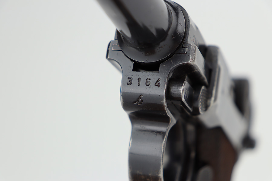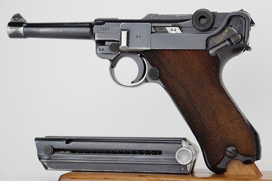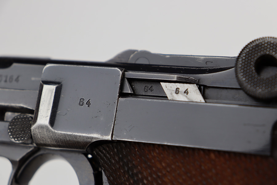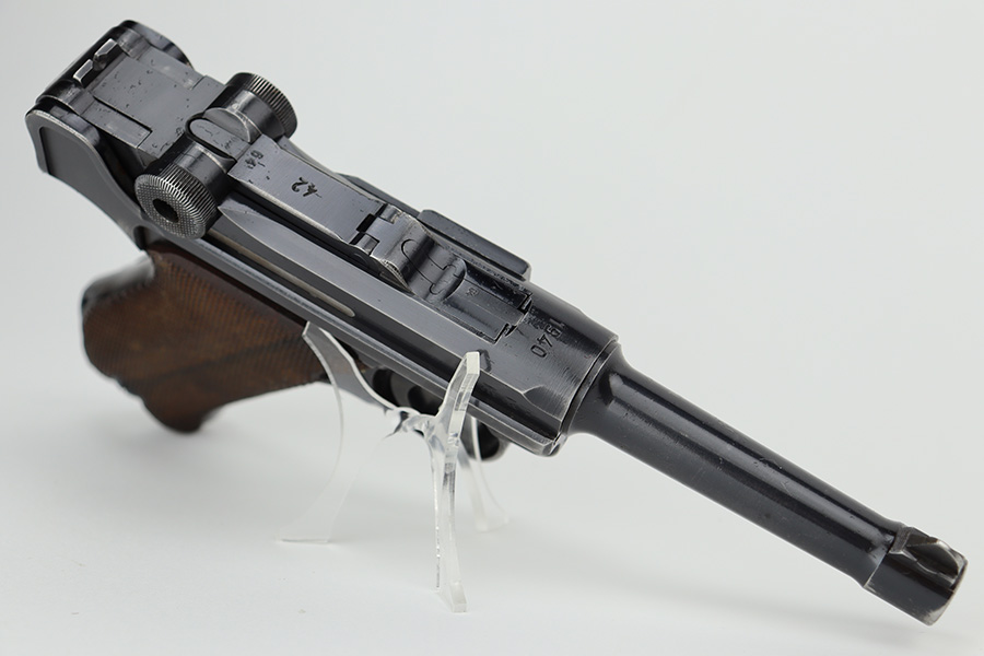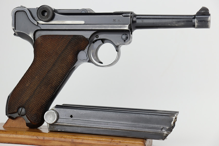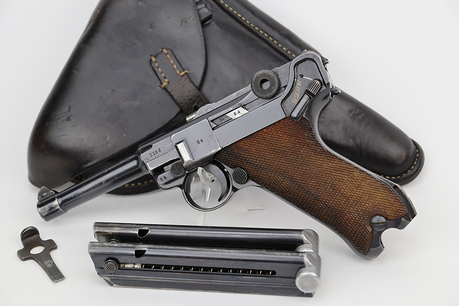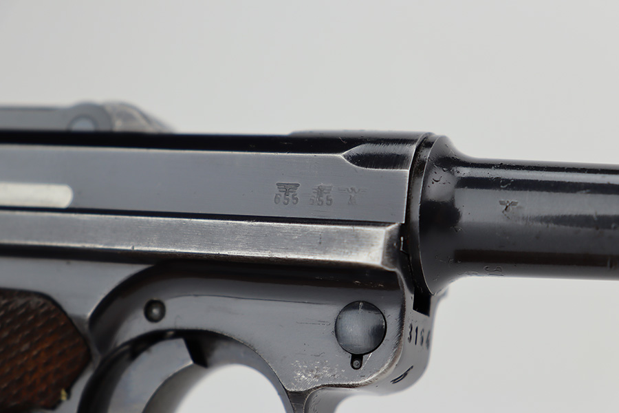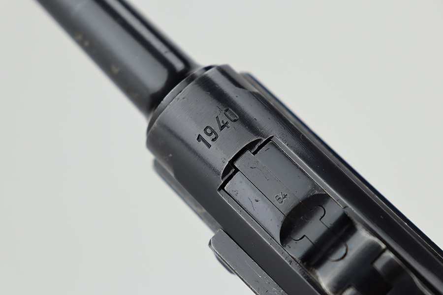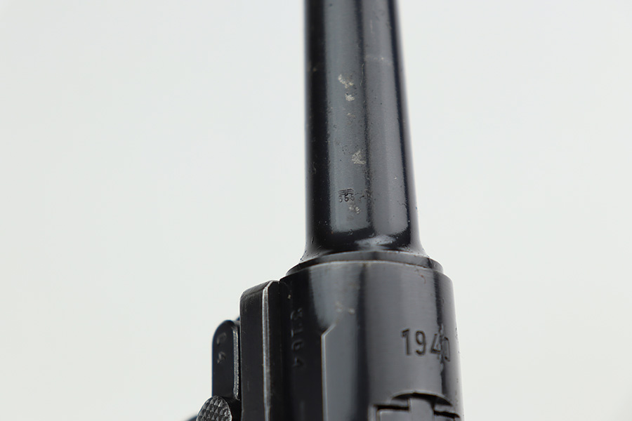 8/2/23 – This is a very nice example of a Mauser Luger issued to the Nazi military in 1940. All matching with the proper “Eagle 655” military acceptance proofs. It comes as a rig with a nice 1940-dated holster, a blank Luger tool, a mismatched “Eagle 655” marked magazine, and a mismatched “Eagle 63” marked magazine. The gun itself has retained somewhere between 85-90% of its original finish. There is minor thinning on the grip straps, minor spotty wear along the barrel, and areas of wear around the muzzle, on the side plate, and on the side rails. Fitted with excellent matching-numbered and “Eagle 655” proofed wood grips. The bore is shiny for the most part with strong rifling, but there is some very light freckling in the grooves.