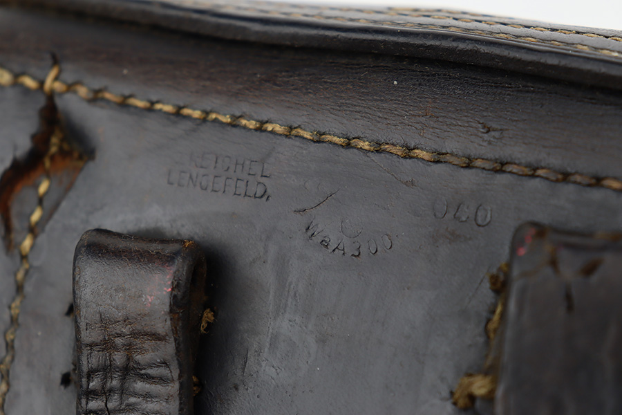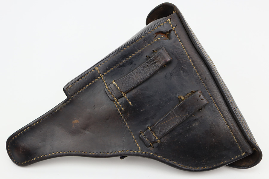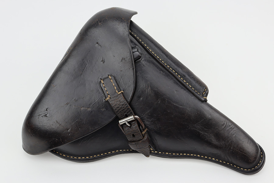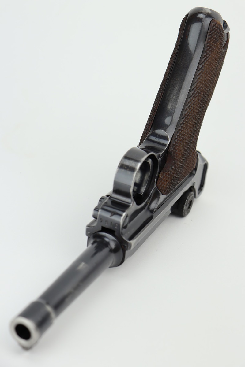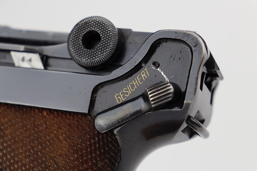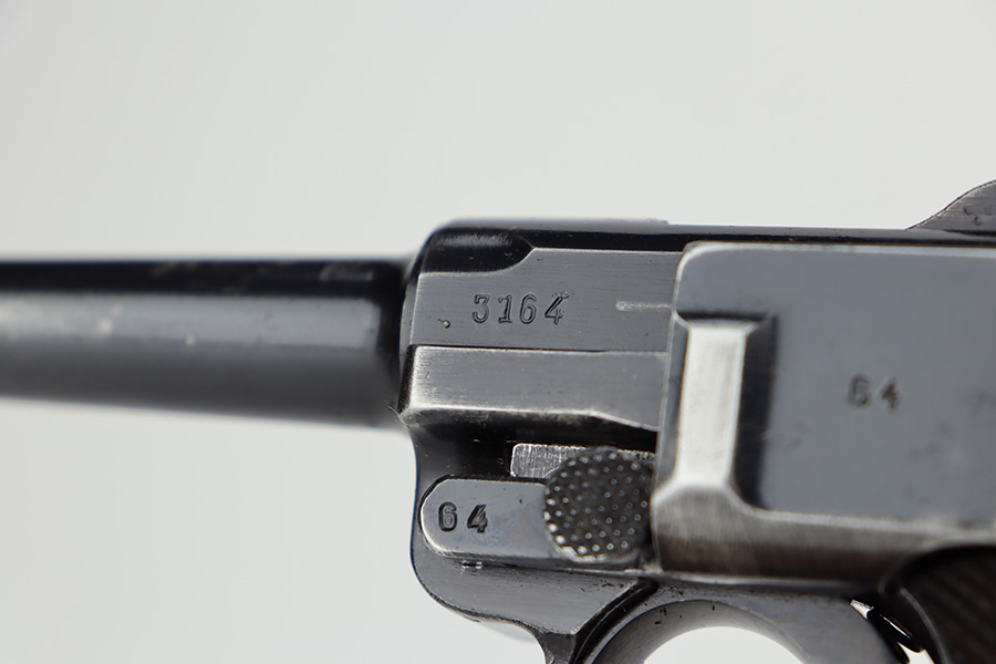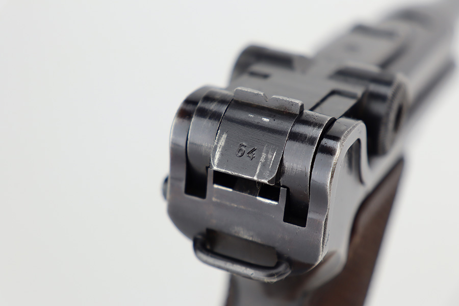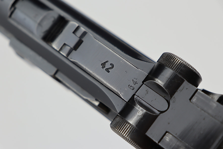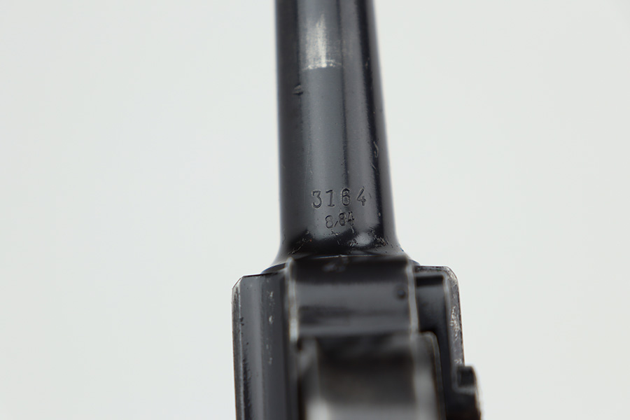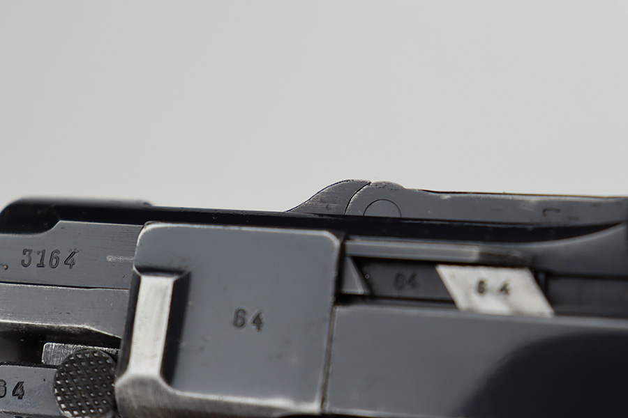 8/2/23 – This is a very nice example of a Mauser Luger issued to the Nazi military in 1940. All matching with the proper “Eagle 655” military acceptance proofs. It comes as a rig with a nice 1940-dated holster, a blank Luger tool, a mismatched “Eagle 655” marked magazine, and a mismatched “Eagle 63” marked magazine. The gun itself has retained somewhere between 85-90% of its original finish. There is minor thinning on the grip straps, minor spotty wear along the barrel, and areas of wear around the muzzle, on the side plate, and on the side rails. Fitted with excellent matching-numbered and “Eagle 655” proofed wood grips. The bore is shiny for the most part with strong rifling, but there is some very light freckling in the grooves.