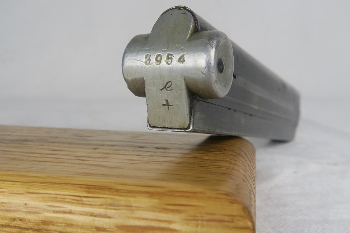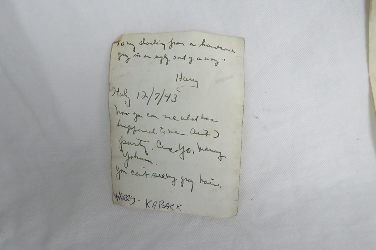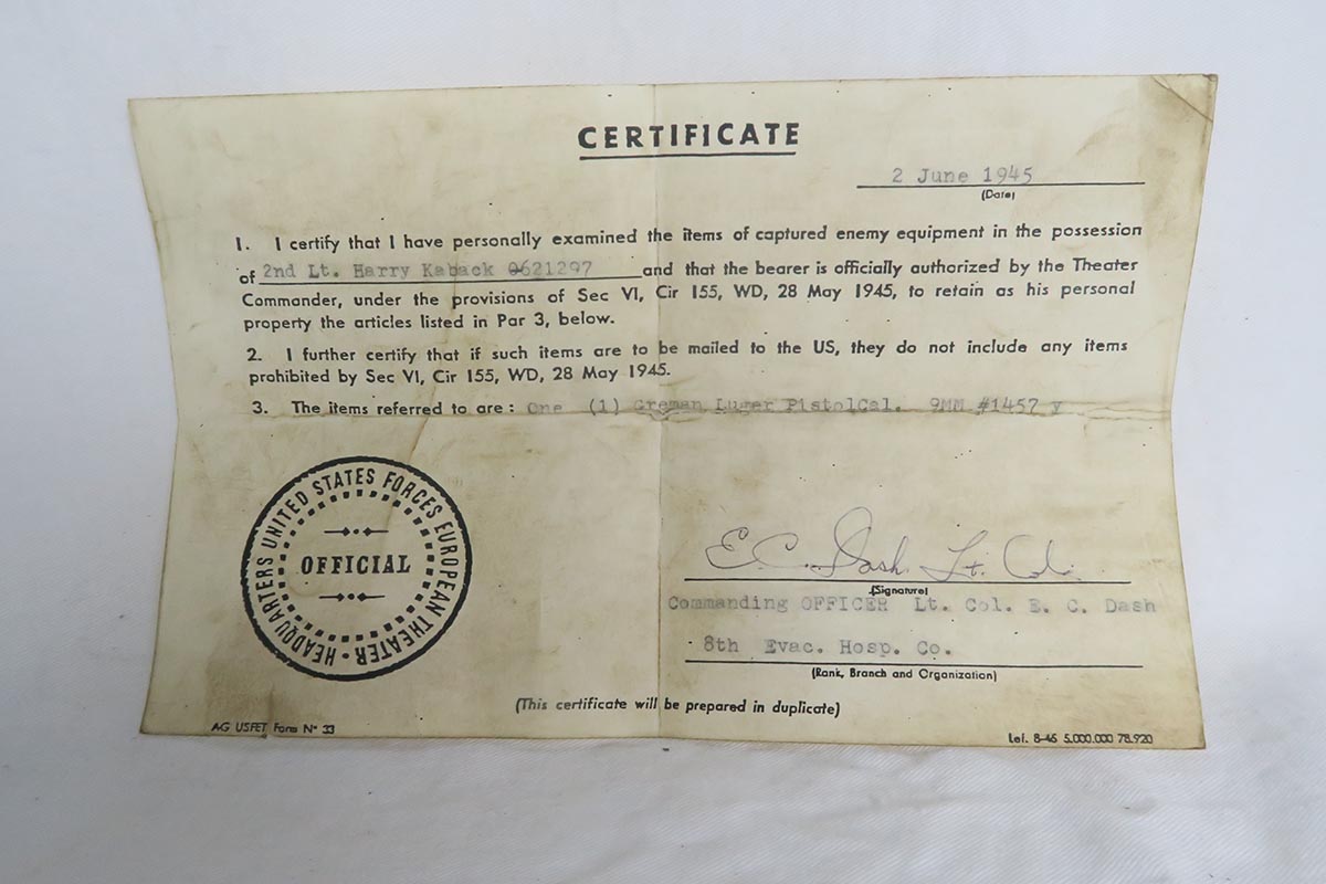 11/14/17 – This 1940 Luger was brought back to the US from Italy by 2nd Lt. Harry Kaback.  The gun is all original and has the rare, reddish Krieghoff grips on it.  The book on Mauser Lugers indicates that a very small set of 1940 lugers have these grips on them from the factory.  It is assumed that they experimented with the HK grips as an option before they started making their own black plastic grips.  Page 210 of the book indicates that these grips are found in the Y block of 1940/42 code lugers, same as this gun.  The guns original finish is about 85% and it is all matching except for the magazine.  Bore is frosted throughout but has nice rifling.  In addition, the gun comes with a capture document and a photo of the GI who brought it home.  You can see on his collar that he was an MD. The back of the photos states the following (not in this order) “Italy, 12/7/43. To my darling from a handsome guy in an ugly sort of way. Now you can see what has happened to me. Ain’t I purty. Cus yo. Manny Yokum. You can’t see my gray hair.”  Other research indicates that Harry served in the 5th Army from 1941 to 1945 in Africa and Italy, and served for the duration. Excellent piece of GI history.
