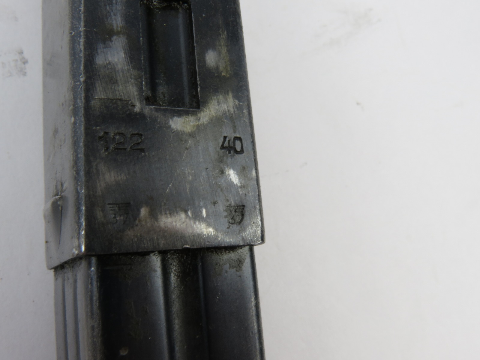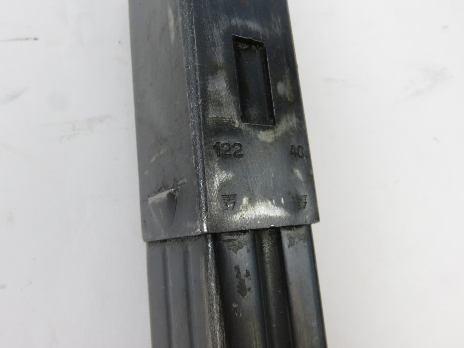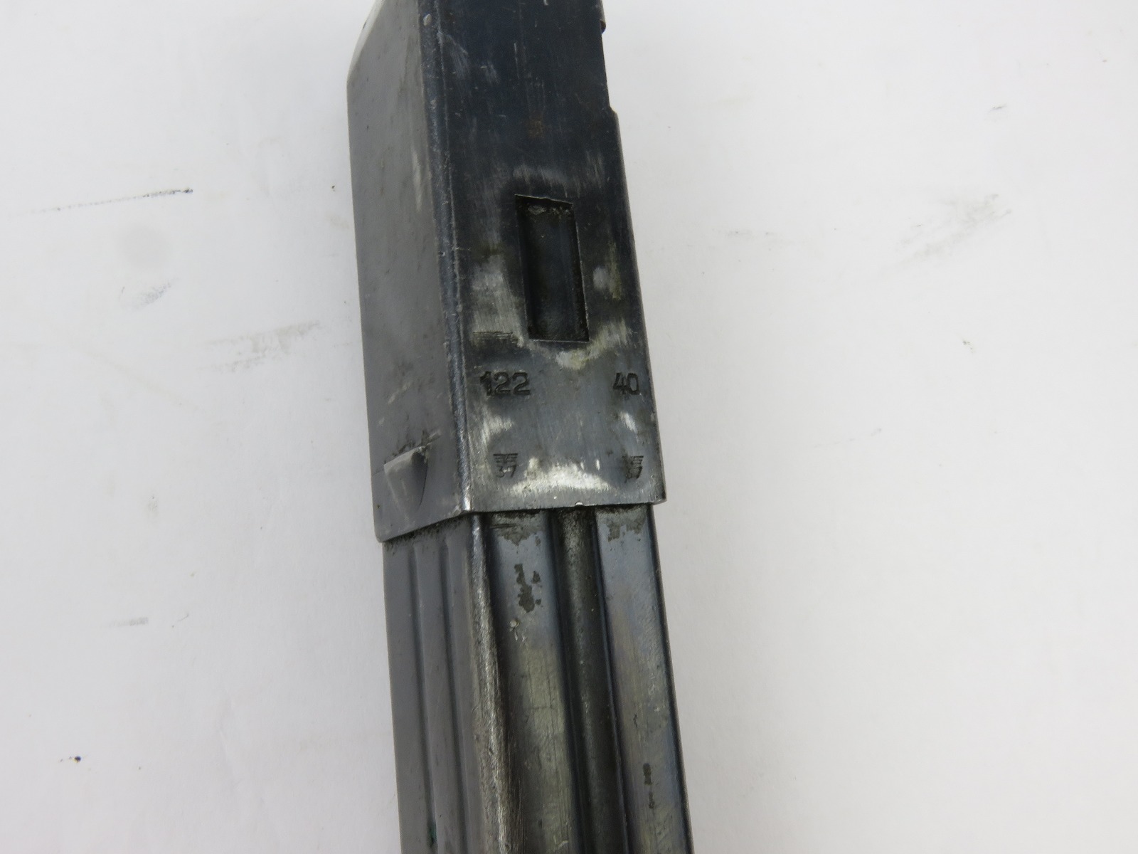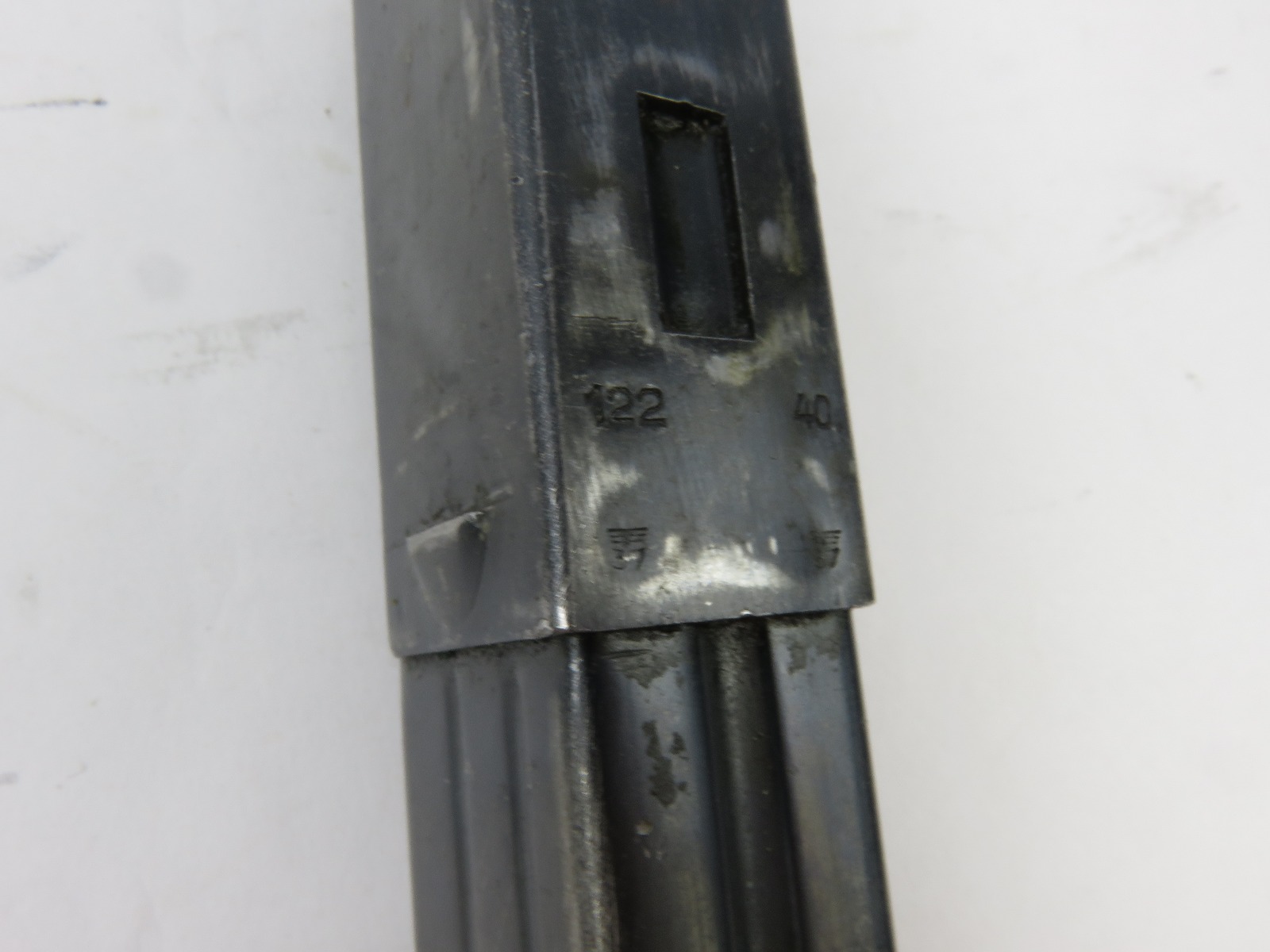 7/26/17 – This is an original MP40 sub machine gun magazine. The magazine is desirable due to the maker and year. The spine of the magazine is “40” dated. There is also a rare “122” code maker stamp (code for Mauser). There are also two eagle/37 proofs on the spine, and a WaA387 proof stamp. The left side of the magazine frame is stamped “M.P. 38u.40”. The magazine has some normal wear, mostly along the edges. There is no significant rust or pitting though, and the blued finish is generally in tact. The spring is strong and fully functional.