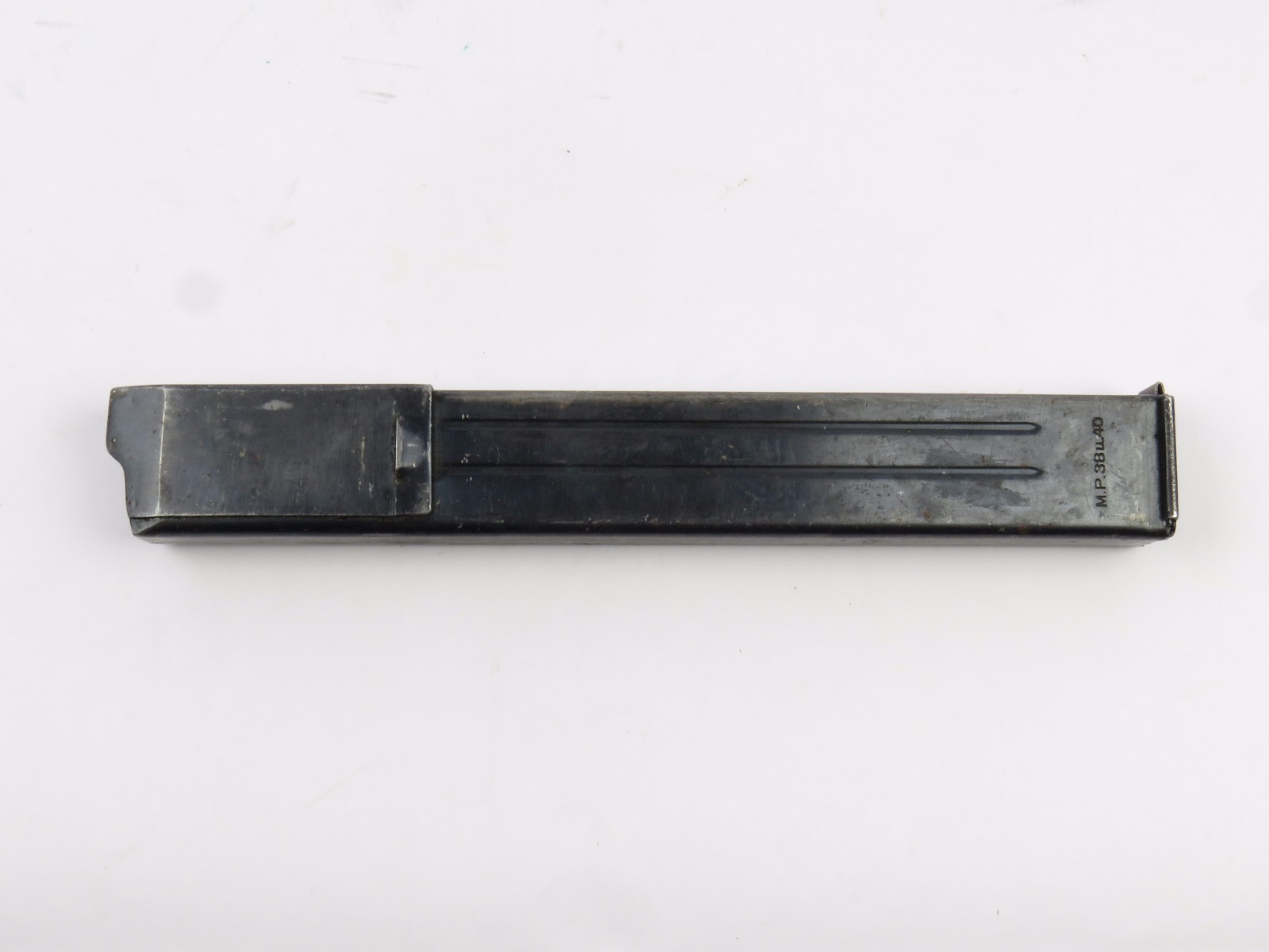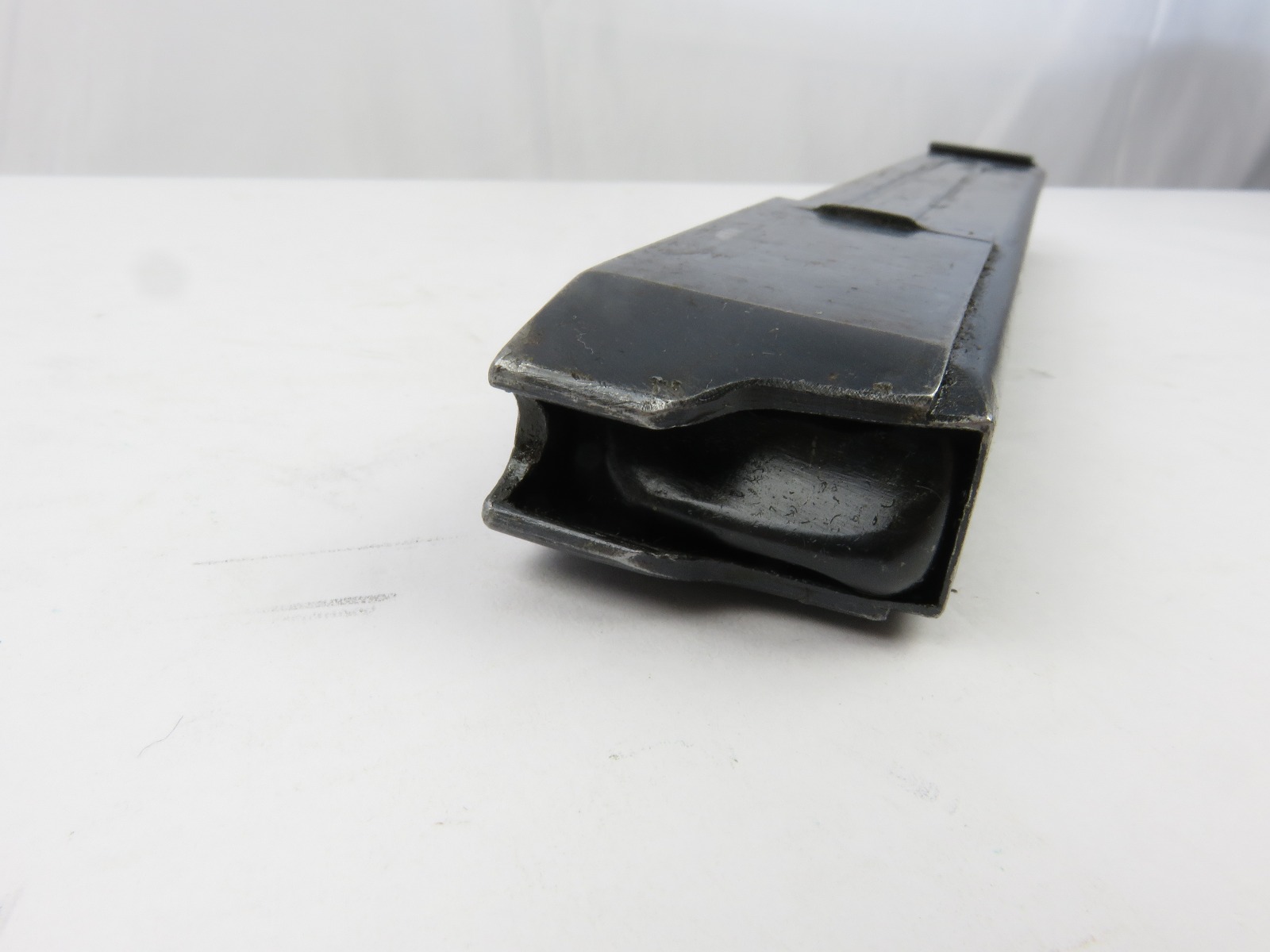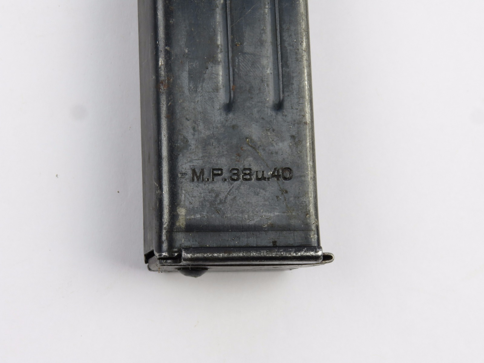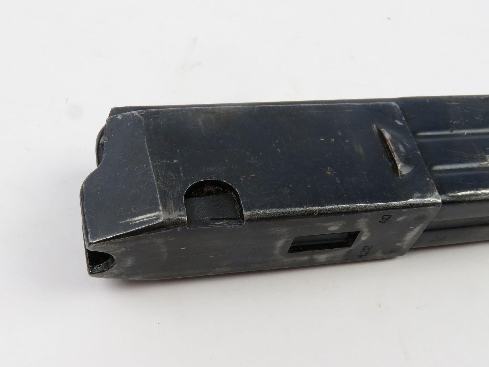 7/26/17 – This is an original MP40 sub machine gun magazine. The magazine is desirable due to the maker and year. The spine of the magazine is “40” dated. There is also a rare “122” code maker stamp (code for Mauser). There are also two eagle/37 proofs on the spine, and a WaA387 proof stamp. The left side of the magazine frame is stamped “M.P. 38u.40”. The magazine has some normal wear, mostly along the edges. There is no significant rust or pitting though, and the blued finish is generally in tact. The spring is strong and fully functional.