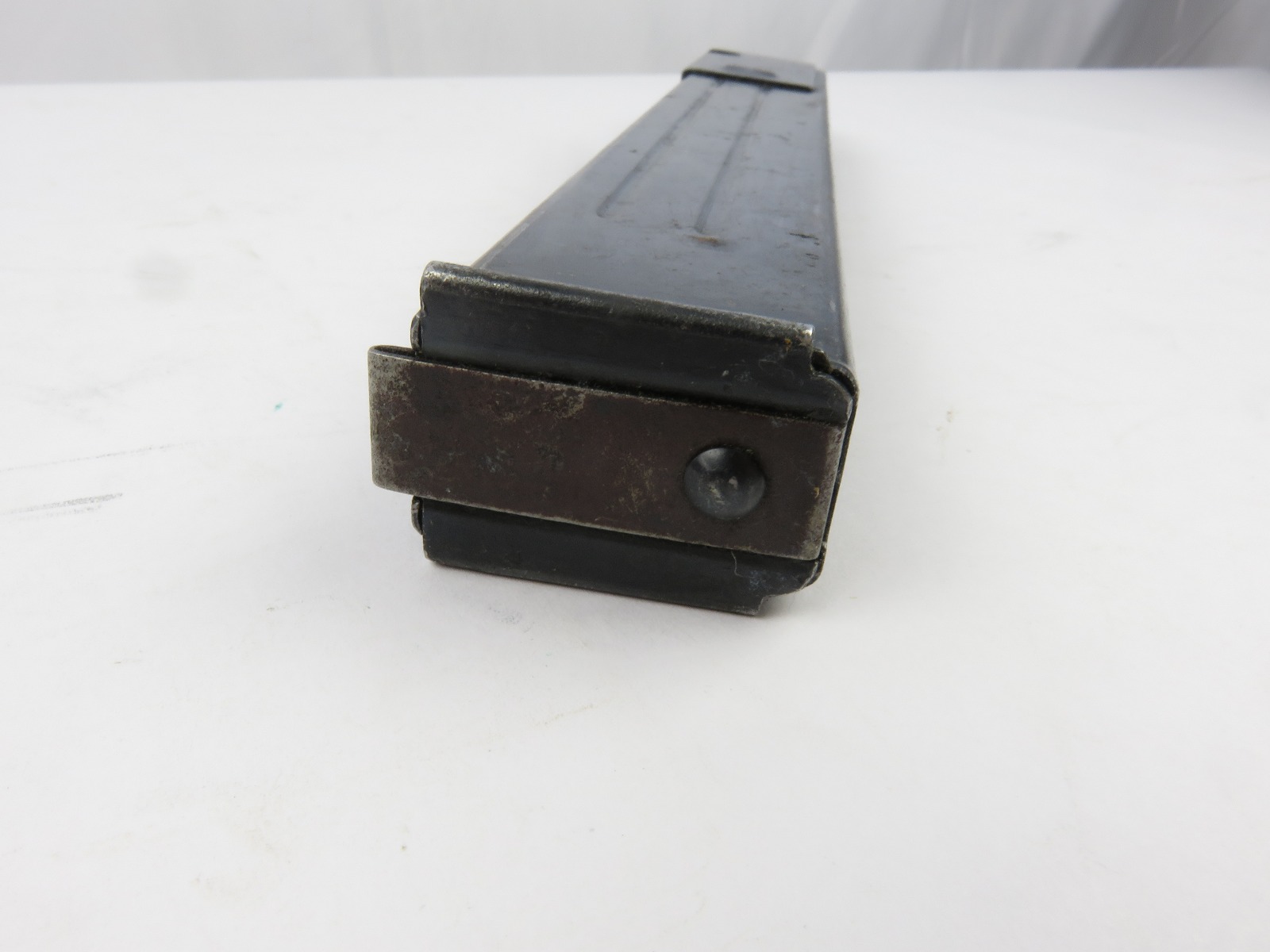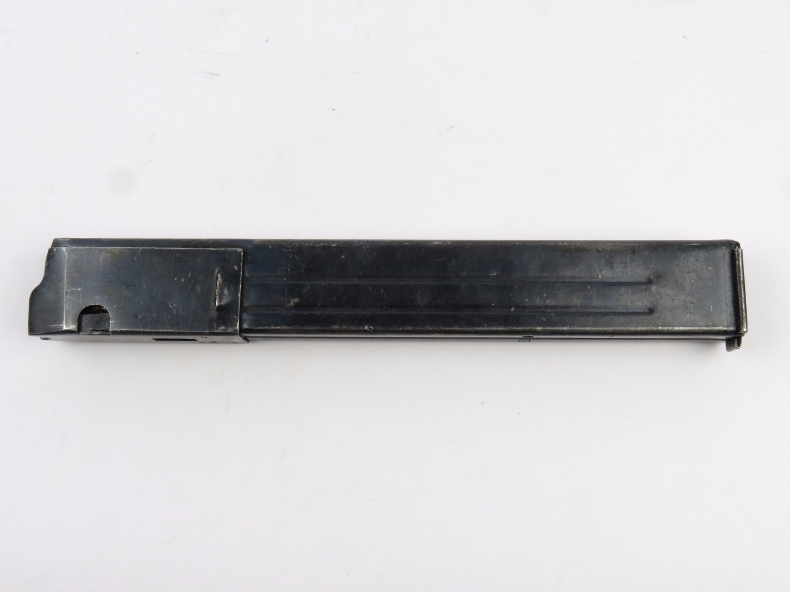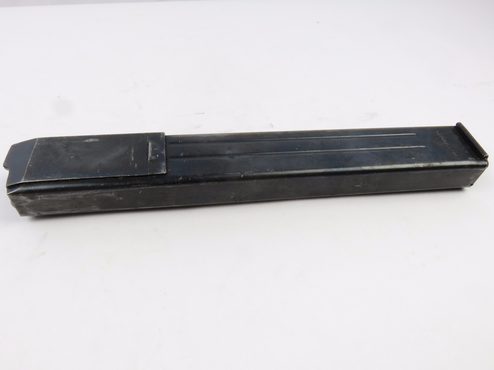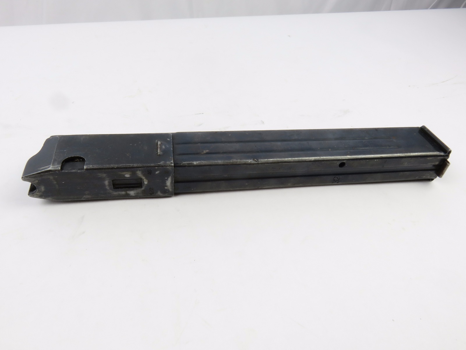 7/26/17 – This is an original MP40 sub machine gun magazine. The magazine is desirable due to the maker and year. The spine of the magazine is “40” dated. There is also a rare “122” code maker stamp (code for Mauser). There are also two eagle/37 proofs on the spine, and a WaA387 proof stamp. The left side of the magazine frame is stamped “M.P. 38u.40”. The magazine has some normal wear, mostly along the edges. There is no significant rust or pitting though, and the blued finish is generally in tact. The spring is strong and fully functional.
