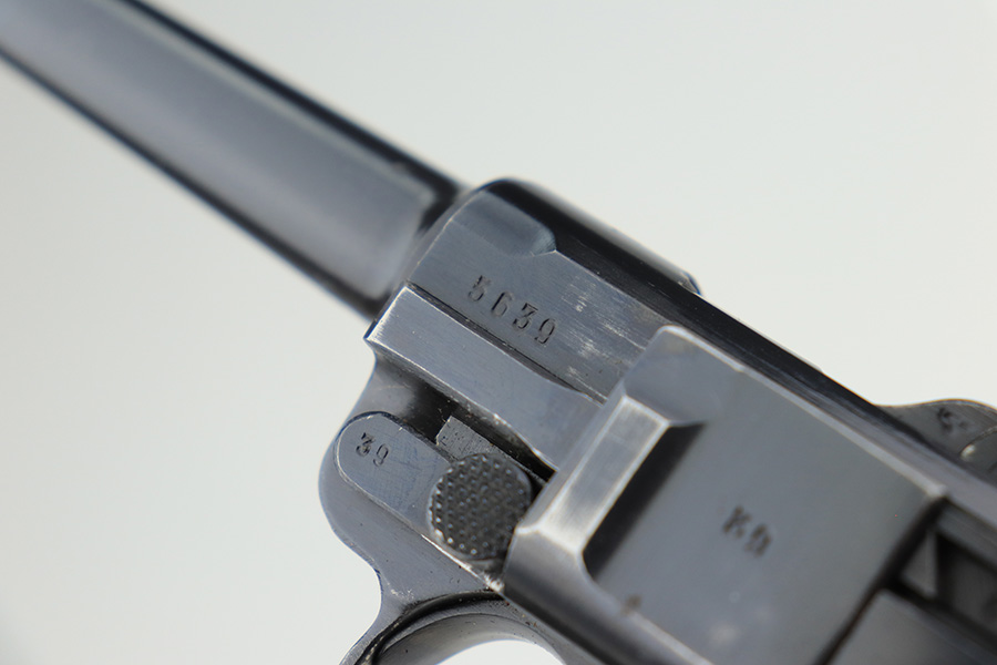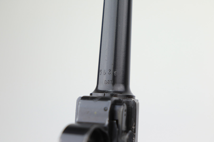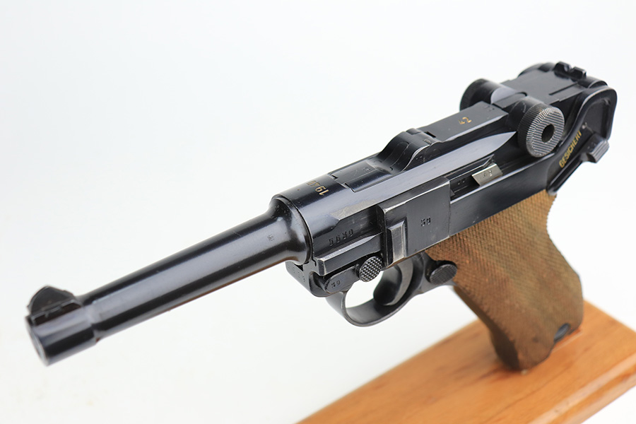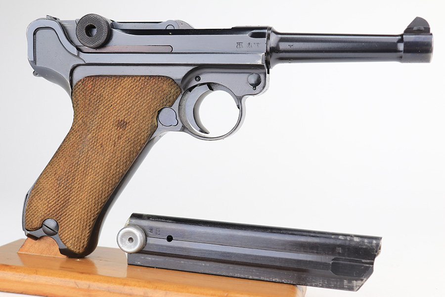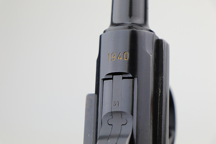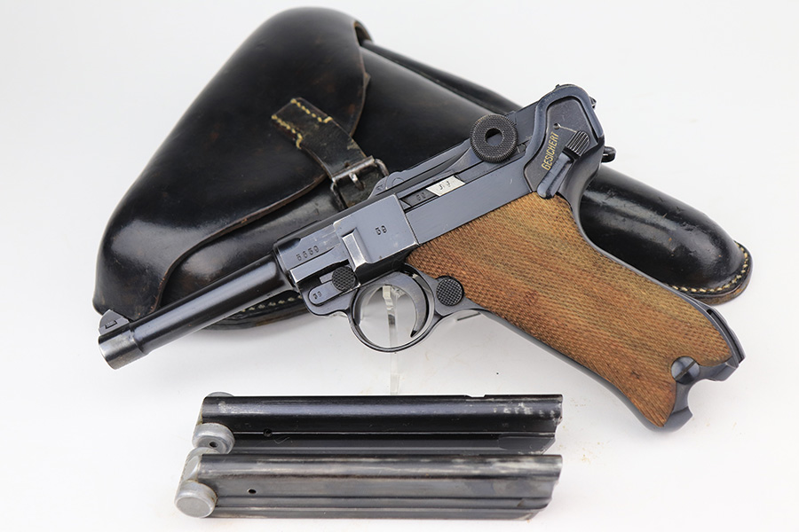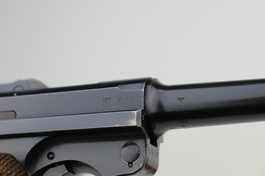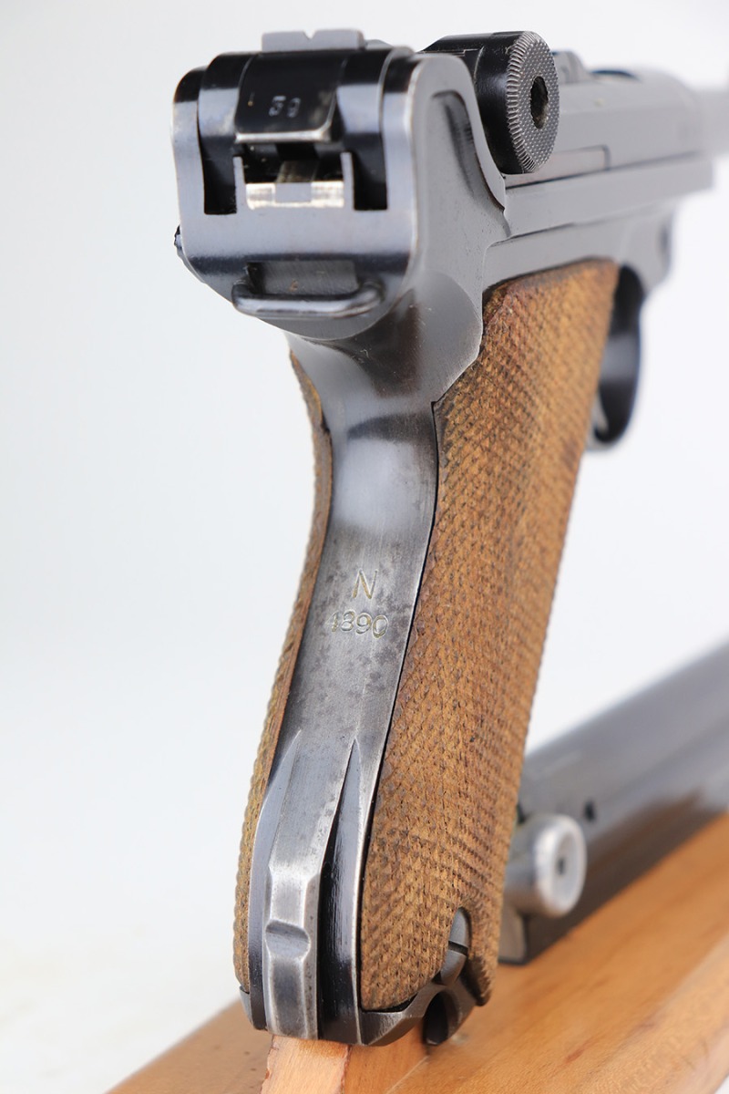 3/9/22 – This is an excellent example of a rare Mauser Luger issued to the Kriegsmarine in 1940. The gun is all matching and has a “N 4890” Navy property marking on the back strap. This variation is rare, as only about 6,000 were ever produced. This particular gun comes as a rig with an excellent and rare 1939-dated Navy-marked black leather holster, one original matching-numbered magazine (with matching Navy property number), and a spare period-correct Navy-marked magazine that does not match the gun. The gun itself has retained about 94-95% of its original finish. Almost all of the finish loss is on the grip straps, so the profile views of this gun are gorgeous. There are just hints of wear on some of the high edges and around the muzzle. There are a couple of very light scratches on the front strap and some light spotty oxidation on the back strap. Comes with minty un-numbered but waffen-proofed wood grips. There is a tiny chip in the top corner of the left grip. The bore is very shiny with strong rifling and some tiny freckling here and there.