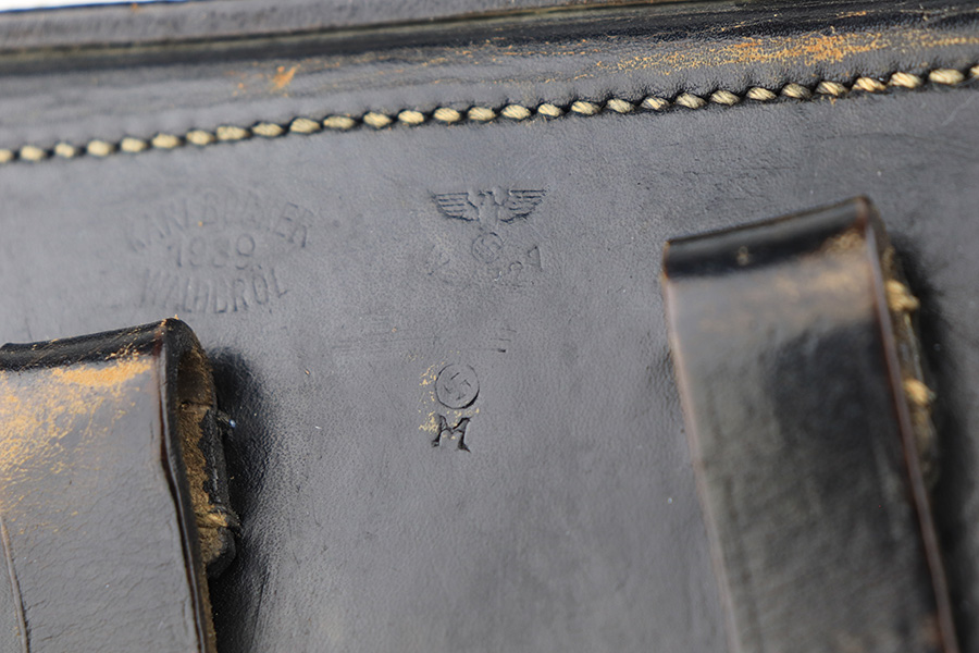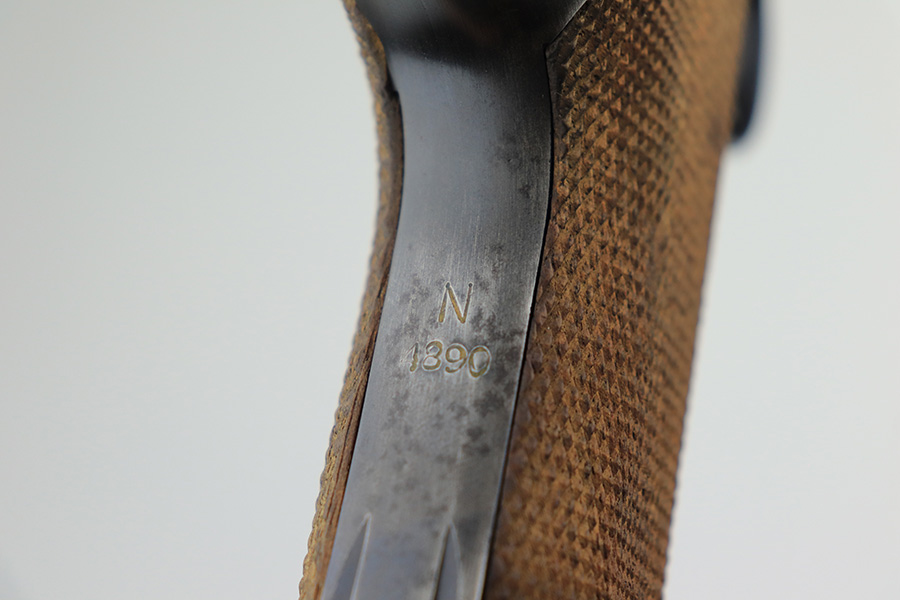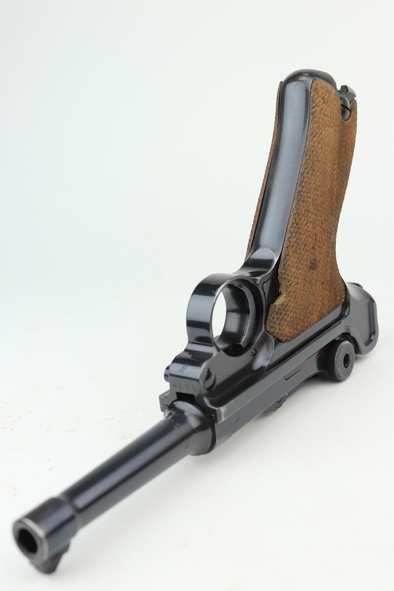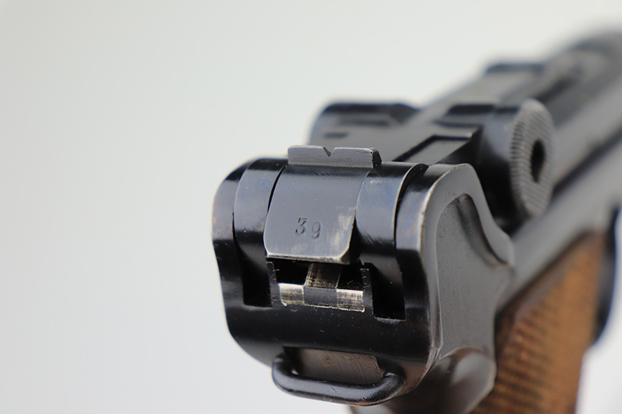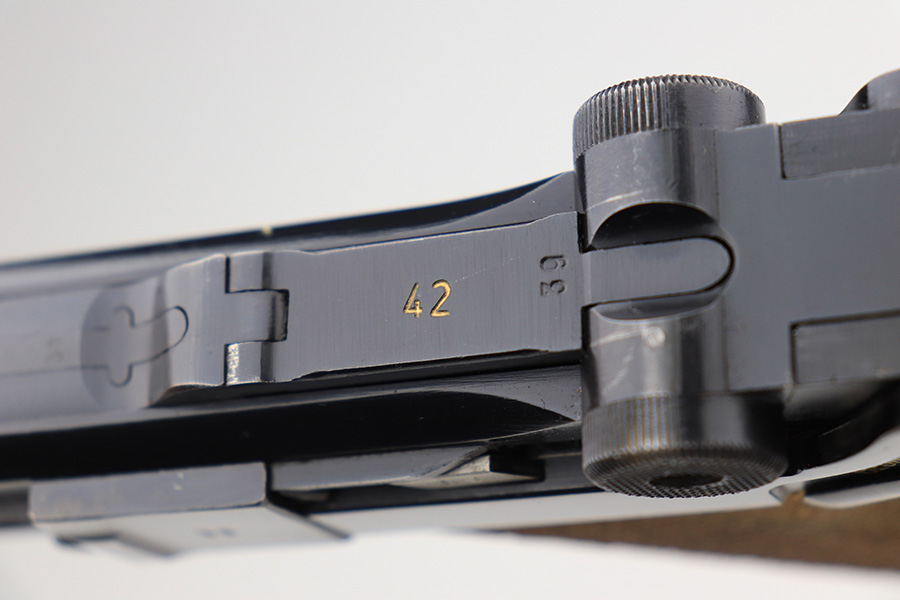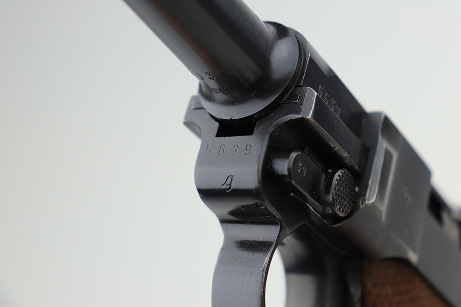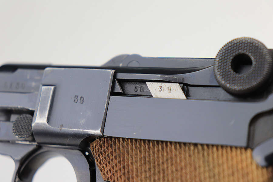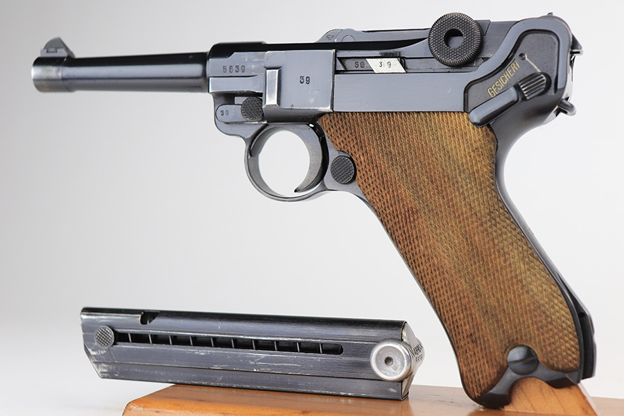 3/9/22 – This is an excellent example of a rare Mauser Luger issued to the Kriegsmarine in 1940. The gun is all matching and has a “N 4890” Navy property marking on the back strap. This variation is rare, as only about 6,000 were ever produced. This particular gun comes as a rig with an excellent and rare 1939-dated Navy-marked black leather holster, one original matching-numbered magazine (with matching Navy property number), and a spare period-correct Navy-marked magazine that does not match the gun. The gun itself has retained about 94-95% of its original finish. Almost all of the finish loss is on the grip straps, so the profile views of this gun are gorgeous. There are just hints of wear on some of the high edges and around the muzzle. There are a couple of very light scratches on the front strap and some light spotty oxidation on the back strap. Comes with minty un-numbered but waffen-proofed wood grips. There is a tiny chip in the top corner of the left grip. The bore is very shiny with strong rifling and some tiny freckling here and there.