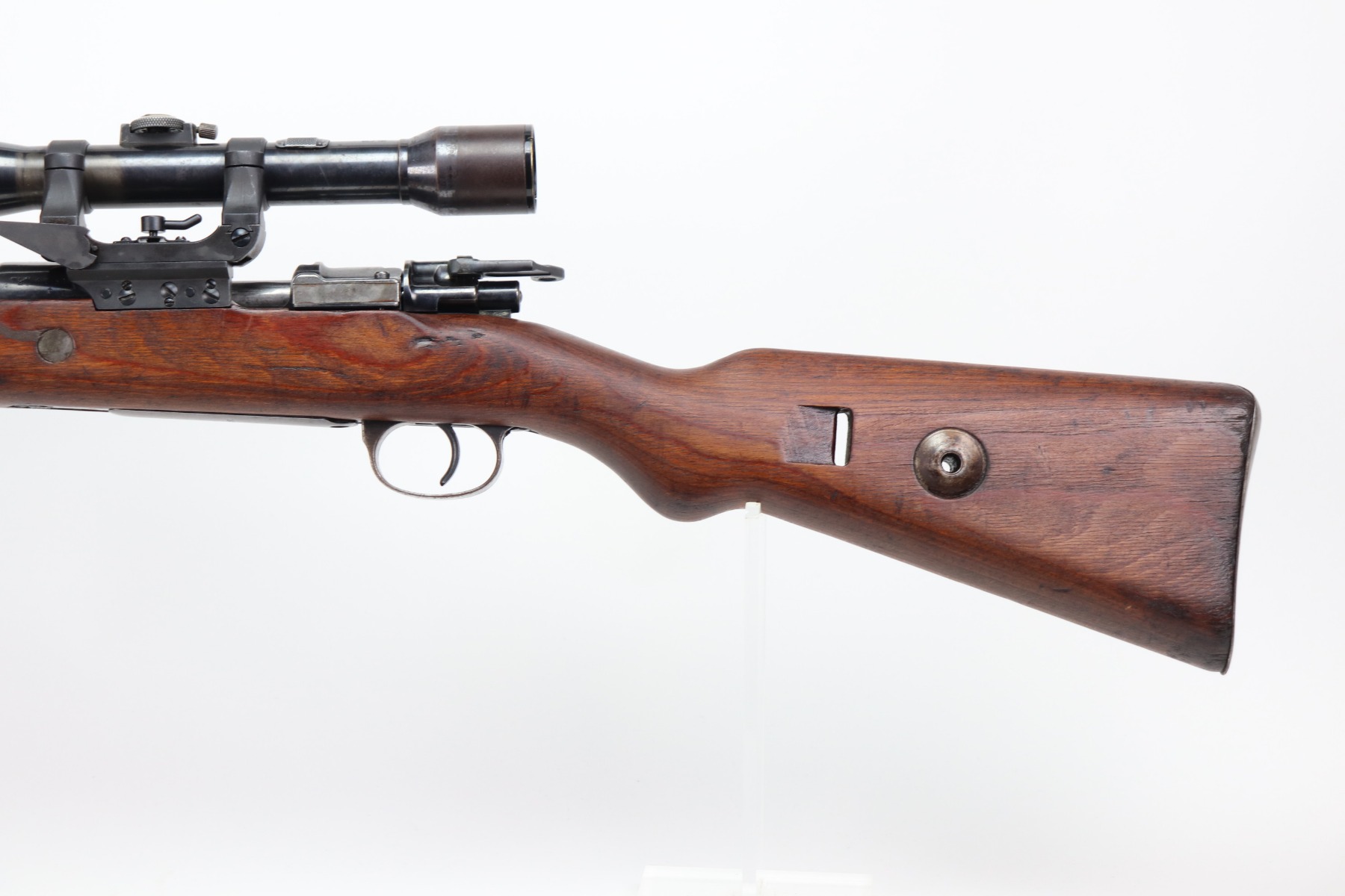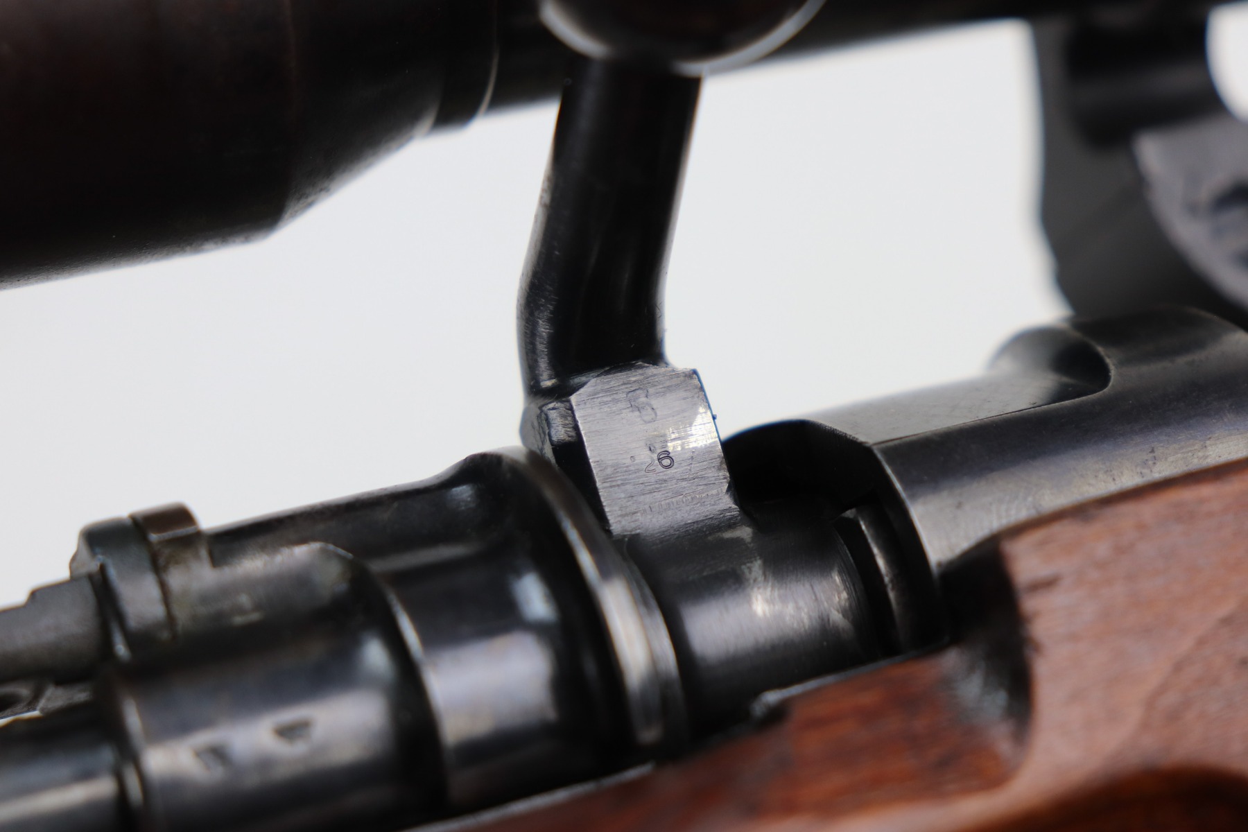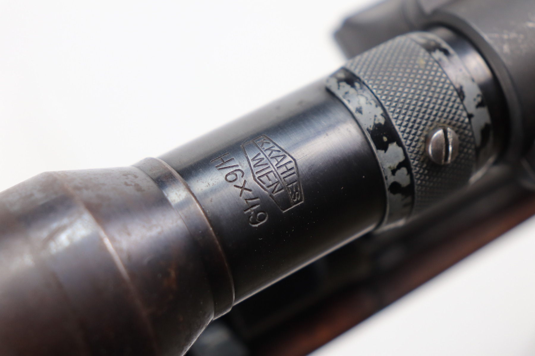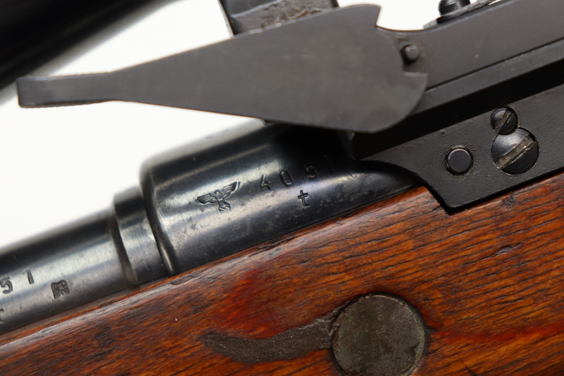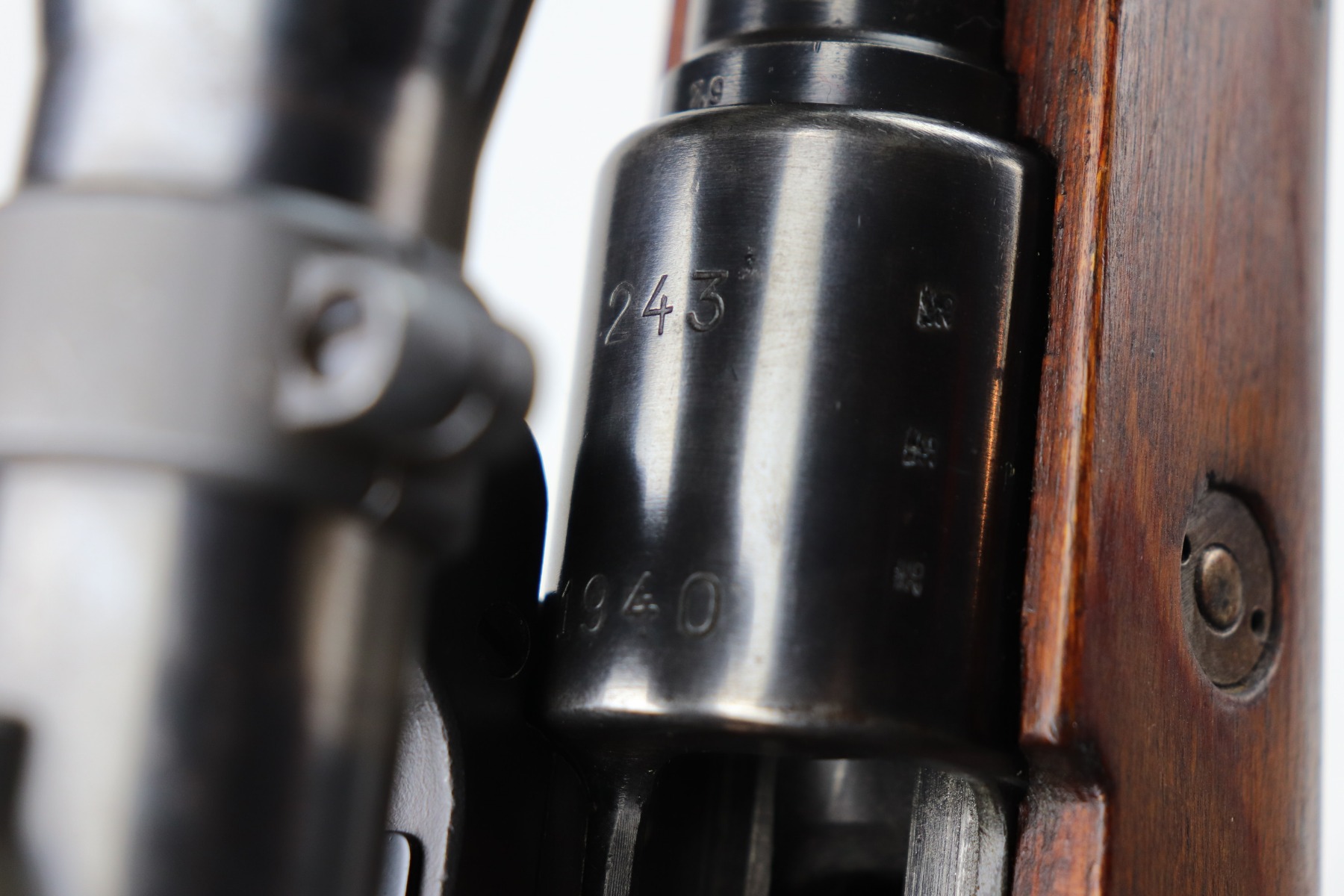 3/2/21 – This is an excellent example of a Mauser K98 issued to the Nazi military in 1940. This one is kitted out with a short side scope rail, scope mount, sniper-style safety lever, and a K. Kahles Wien H/6×49 sniper scope. The gun is all matching, including the stock. There are waffen proofs throughout including on the wrist and butt of the stock. Comes with original cleaning rod. The gun is fully functional and the action is smooth. The barrel bands have a parkerized finish, so may have been refinished. The stock looks like it was duffle-cut but has since been repaired. We believe the scope rail, mount, and safety lever are modern reproductions but work with the scope perfectly. The scope has very nice optics with just a hint of cloudiness. There is a piece of black tape near the front lens. The gun itself has retained the majority of its finish – just some minor handling marks and minor wear around the high edges of the receiver. Excellent stock with visible markings. The bore is excellent – shiny with strong rifling.