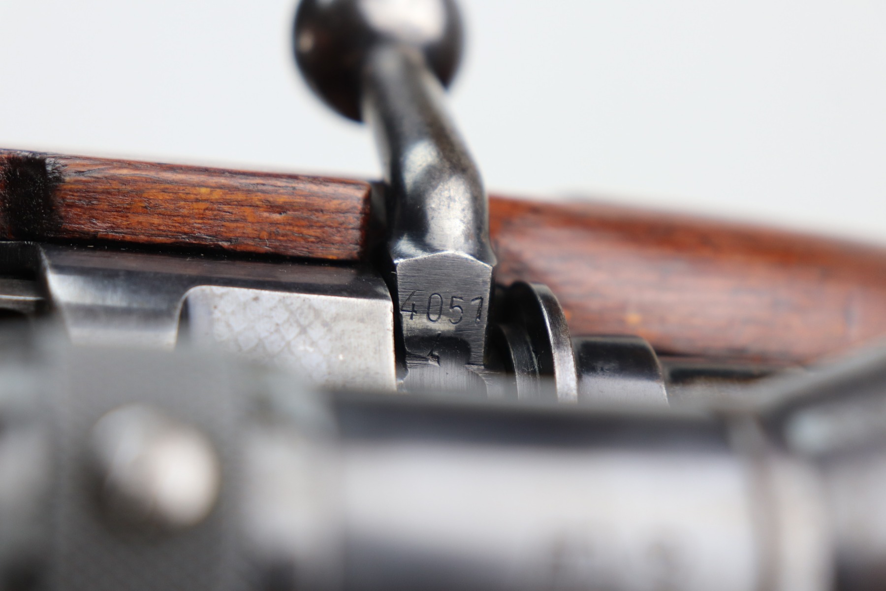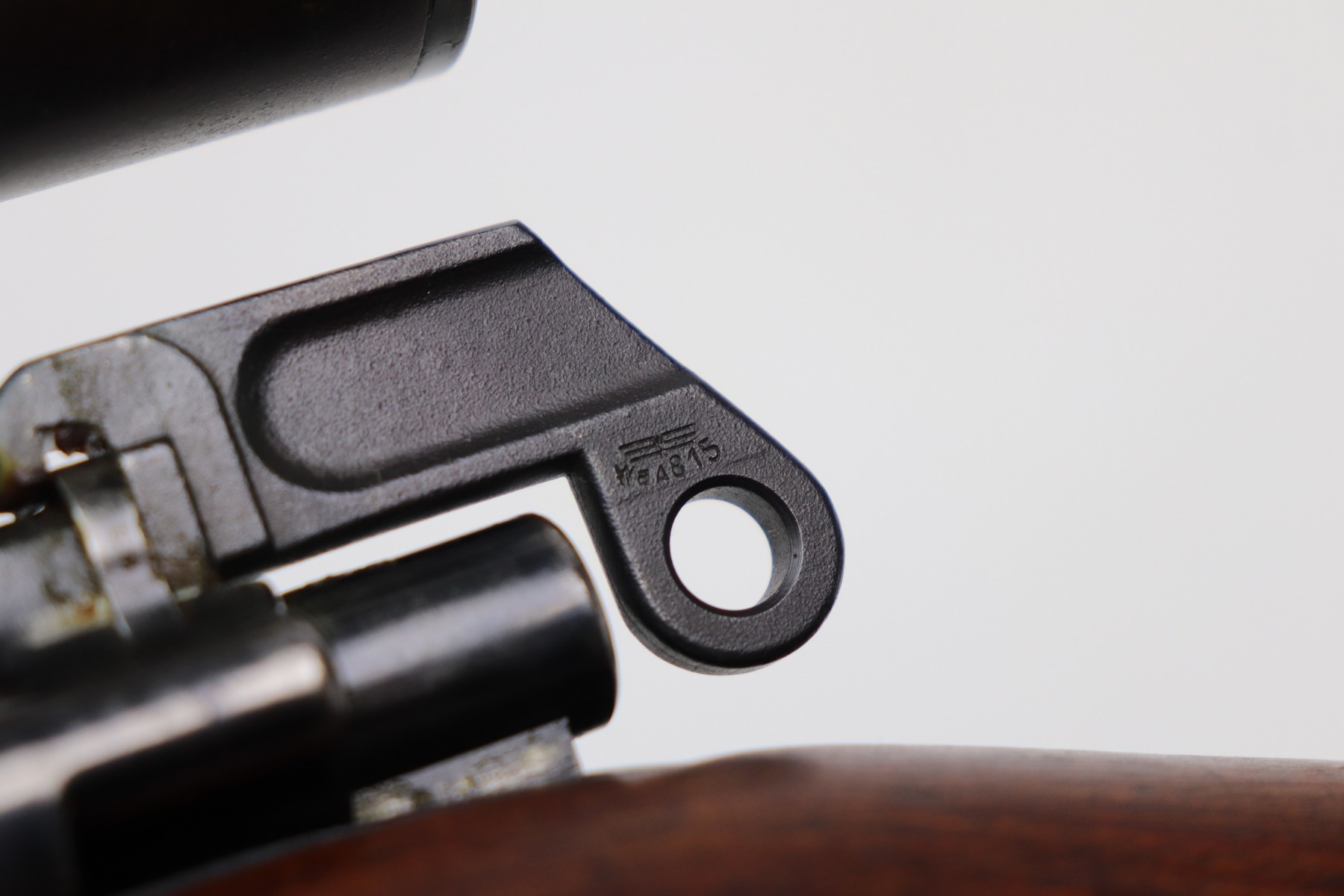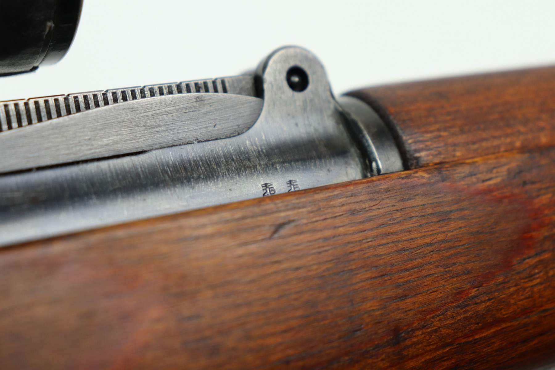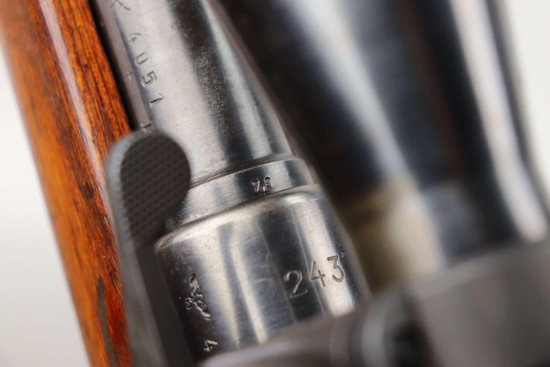 3/2/21 – This is an excellent example of a Mauser K98 issued to the Nazi military in 1940. This one is kitted out with a short side scope rail, scope mount, sniper-style safety lever, and a K. Kahles Wien H/6×49 sniper scope. The gun is all matching, including the stock. There are waffen proofs throughout including on the wrist and butt of the stock. Comes with original cleaning rod. The gun is fully functional and the action is smooth. The barrel bands have a parkerized finish, so may have been refinished. The stock looks like it was duffle-cut but has since been repaired. We believe the scope rail, mount, and safety lever are modern reproductions but work with the scope perfectly. The scope has very nice optics with just a hint of cloudiness. There is a piece of black tape near the front lens. The gun itself has retained the majority of its finish – just some minor handling marks and minor wear around the high edges of the receiver. Excellent stock with visible markings. The bore is excellent – shiny with strong rifling.
