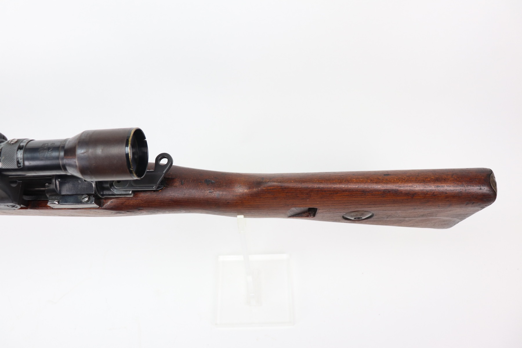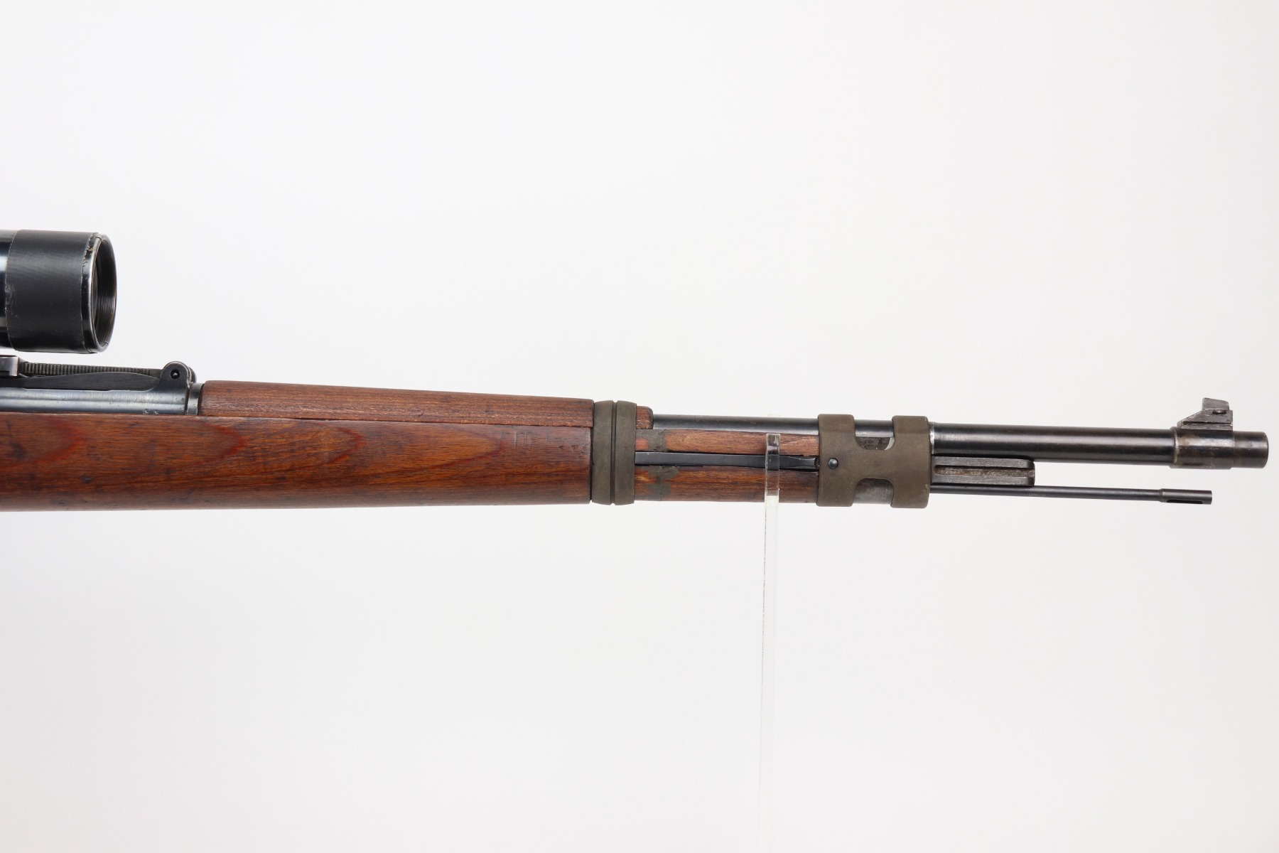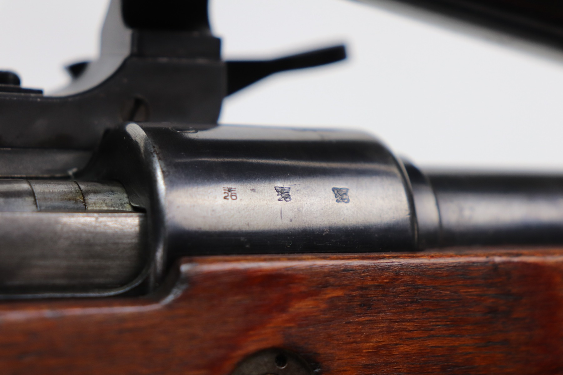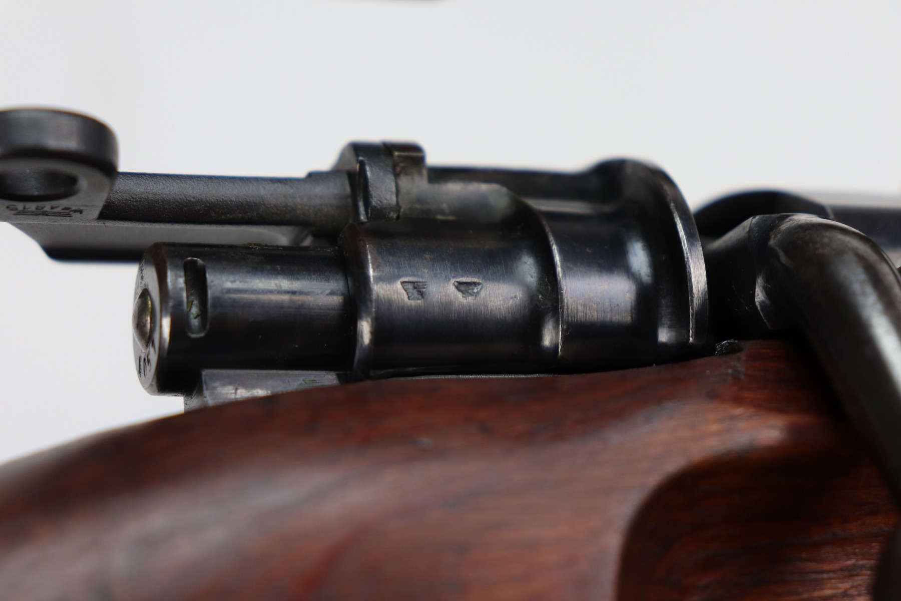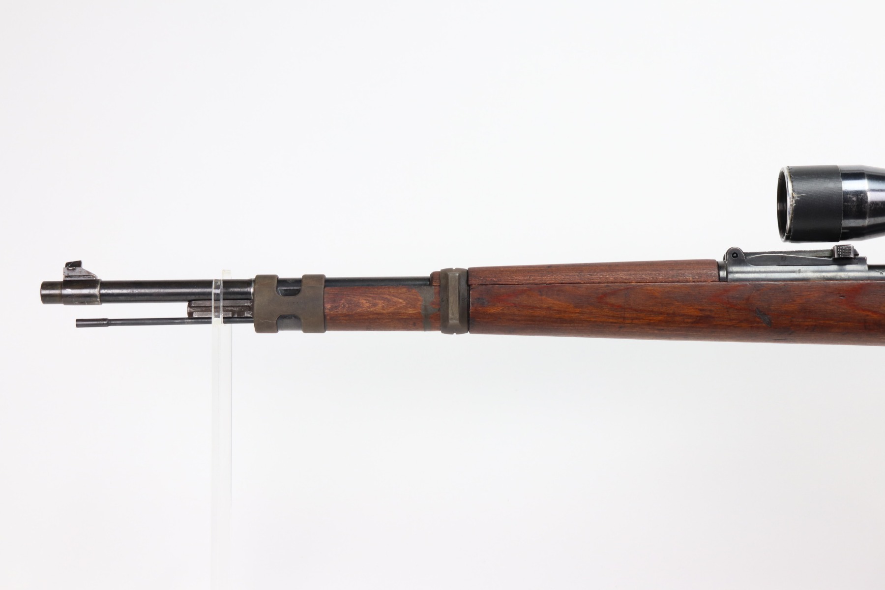 3/2/21 – This is an excellent example of a Mauser K98 issued to the Nazi military in 1940. This one is kitted out with a short side scope rail, scope mount, sniper-style safety lever, and a K. Kahles Wien H/6×49 sniper scope. The gun is all matching, including the stock. There are waffen proofs throughout including on the wrist and butt of the stock. Comes with original cleaning rod. The gun is fully functional and the action is smooth. The barrel bands have a parkerized finish, so may have been refinished. The stock looks like it was duffle-cut but has since been repaired. We believe the scope rail, mount, and safety lever are modern reproductions but work with the scope perfectly. The scope has very nice optics with just a hint of cloudiness. There is a piece of black tape near the front lens. The gun itself has retained the majority of its finish – just some minor handling marks and minor wear around the high edges of the receiver. Excellent stock with visible markings. The bore is excellent – shiny with strong rifling.