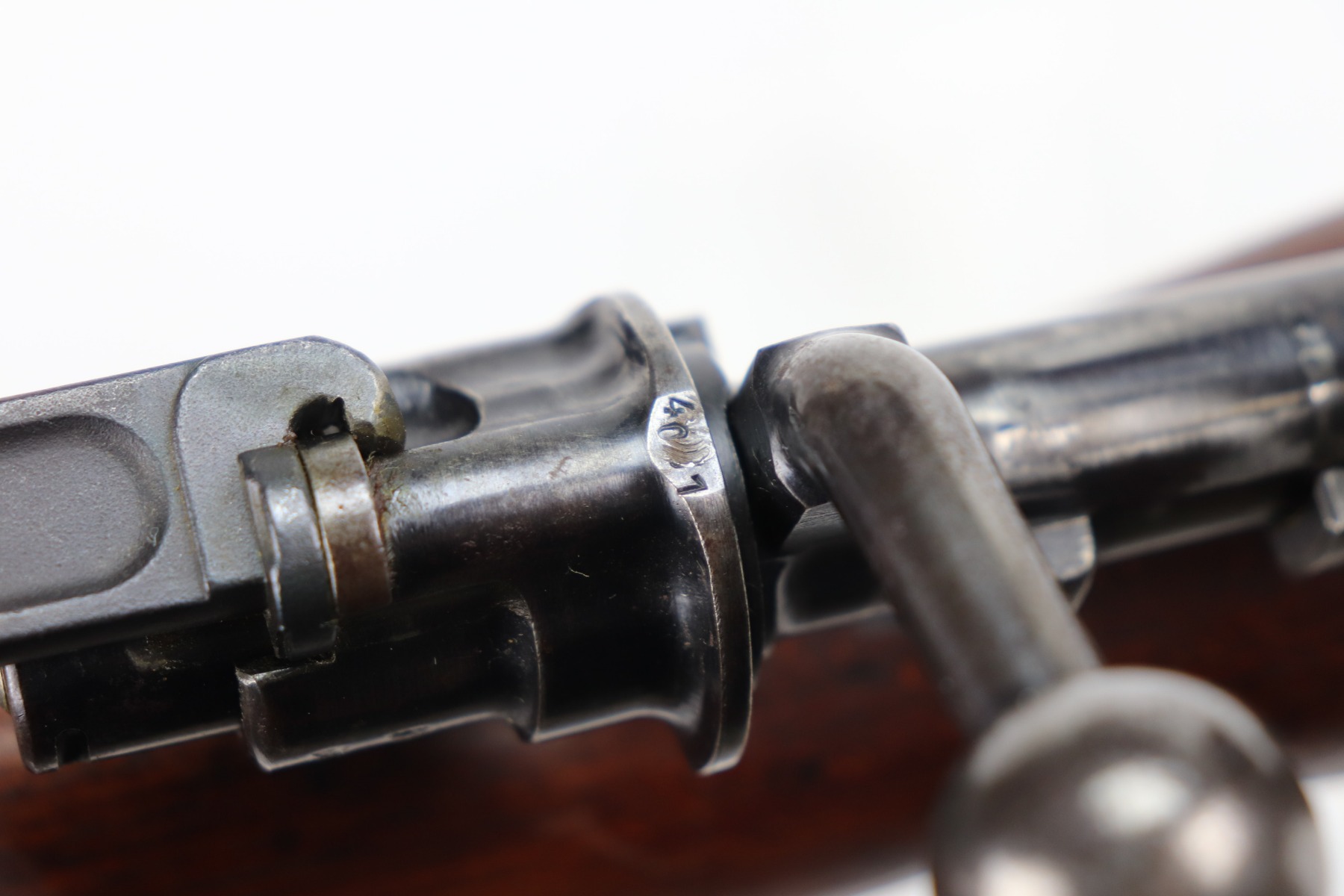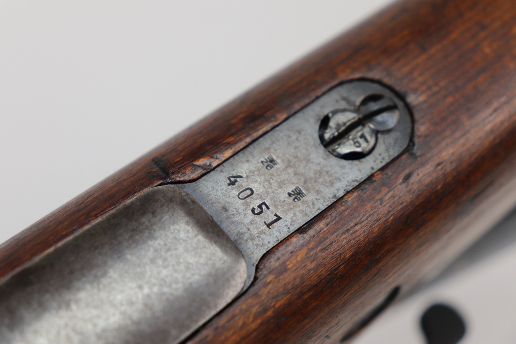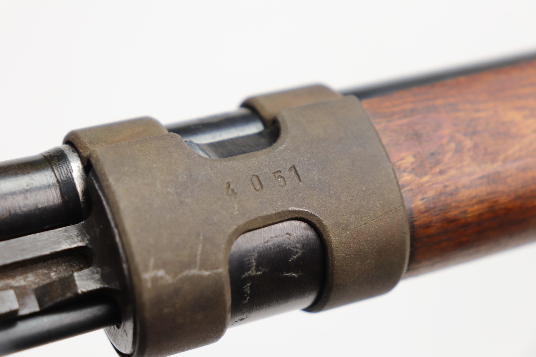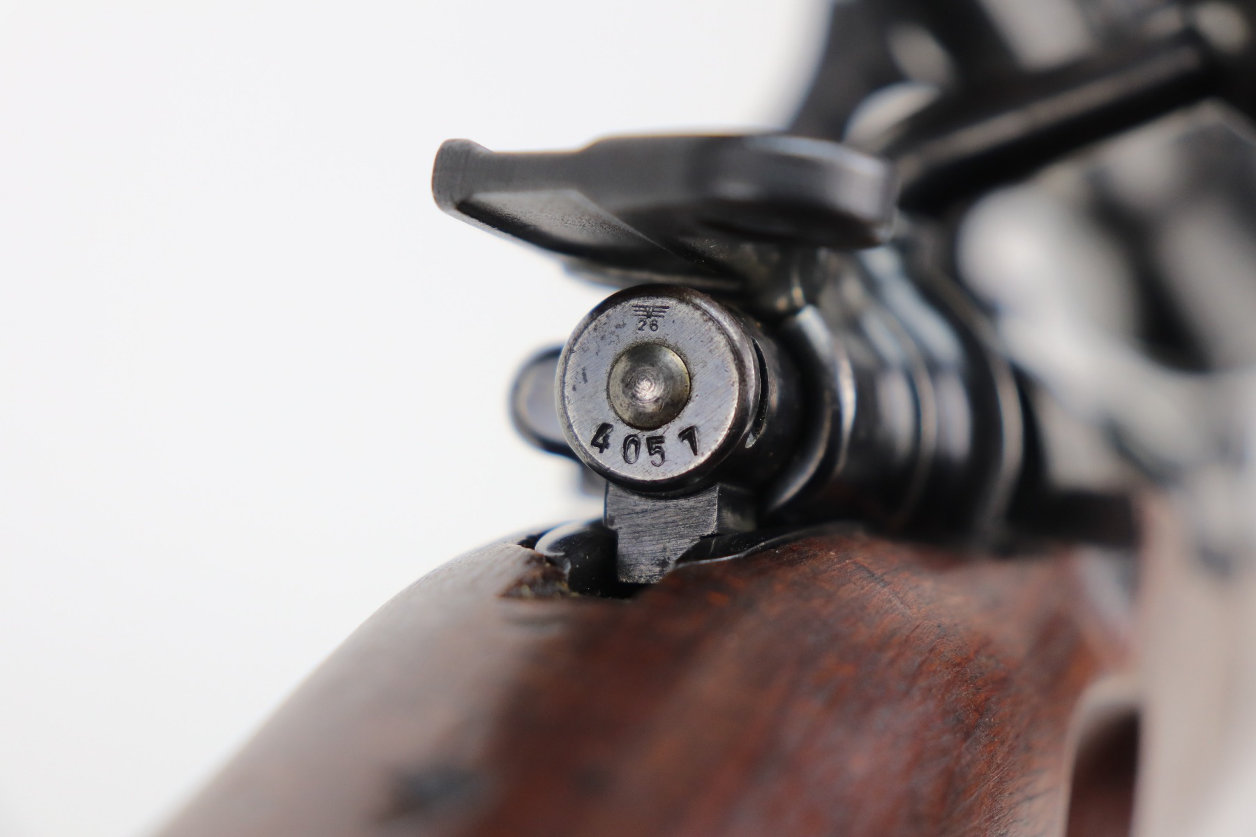 3/2/21 – This is an excellent example of a Mauser K98 issued to the Nazi military in 1940. This one is kitted out with a short side scope rail, scope mount, sniper-style safety lever, and a K. Kahles Wien H/6×49 sniper scope. The gun is all matching, including the stock. There are waffen proofs throughout including on the wrist and butt of the stock. Comes with original cleaning rod. The gun is fully functional and the action is smooth. The barrel bands have a parkerized finish, so may have been refinished. The stock looks like it was duffle-cut but has since been repaired. We believe the scope rail, mount, and safety lever are modern reproductions but work with the scope perfectly. The scope has very nice optics with just a hint of cloudiness. There is a piece of black tape near the front lens. The gun itself has retained the majority of its finish – just some minor handling marks and minor wear around the high edges of the receiver. Excellent stock with visible markings. The bore is excellent – shiny with strong rifling.