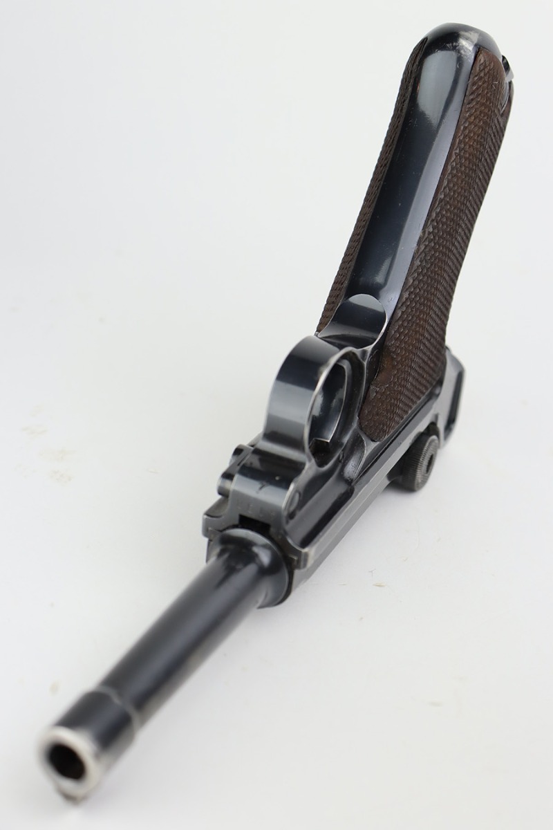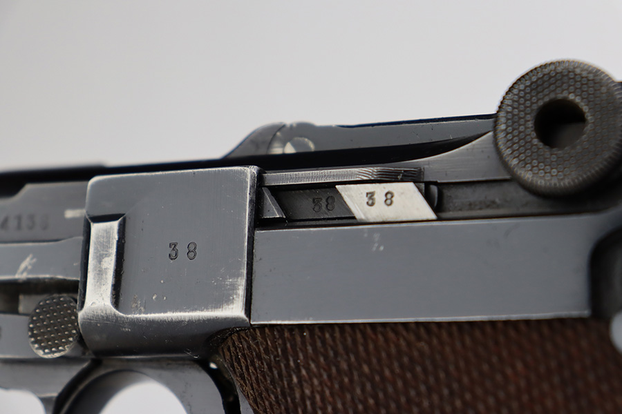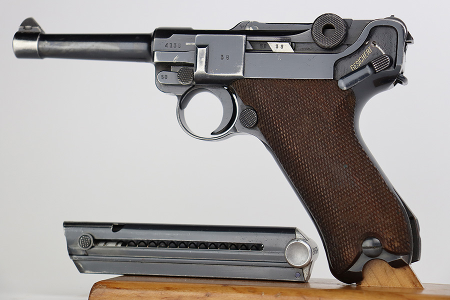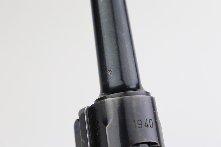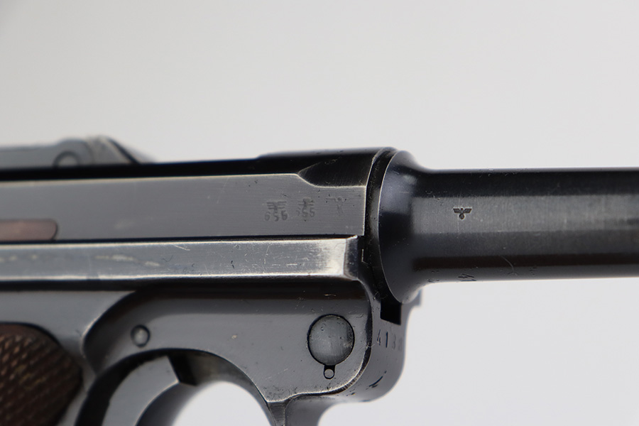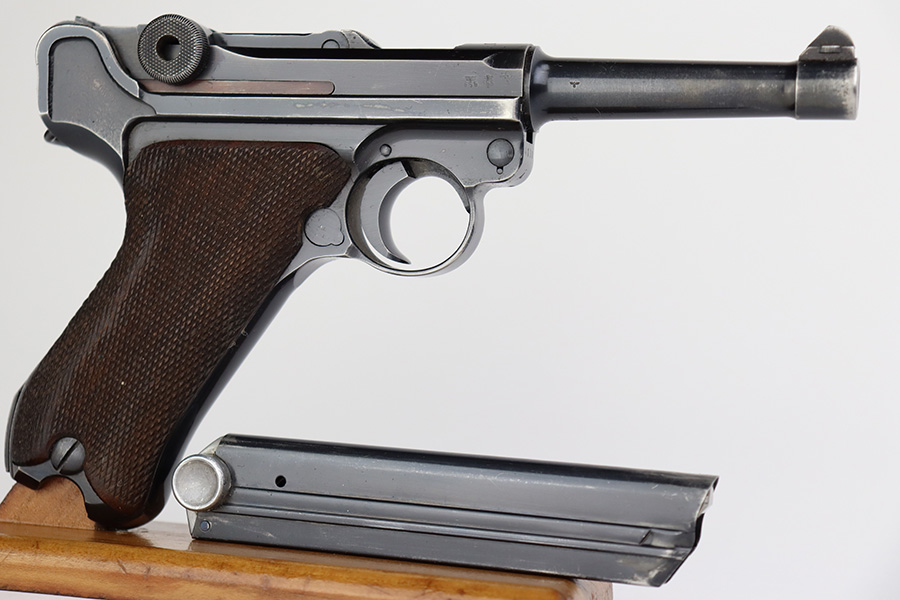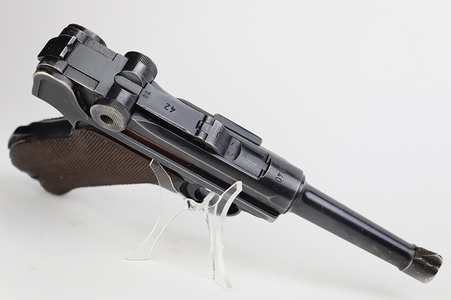 6/22/23 – This is a very nice example of a Mauser Luger issued to the Nazi military in 1940. All matching with the proper “Eagle 655” military acceptance proofs. It has retained about 90-92% of its original finish with areas of wear around the muzzle, on the side plate, on the front edges of the side rails, and one small area at the base of the front strap. A few tiny scratches on the left side of the frame. Fitted with excellent un-numbered but “Eagle 655” proofed wood grips. Comes with a mismatched “S/42” marked armorers replacement magazine. The bore has great rifling with minor freckling throughout.