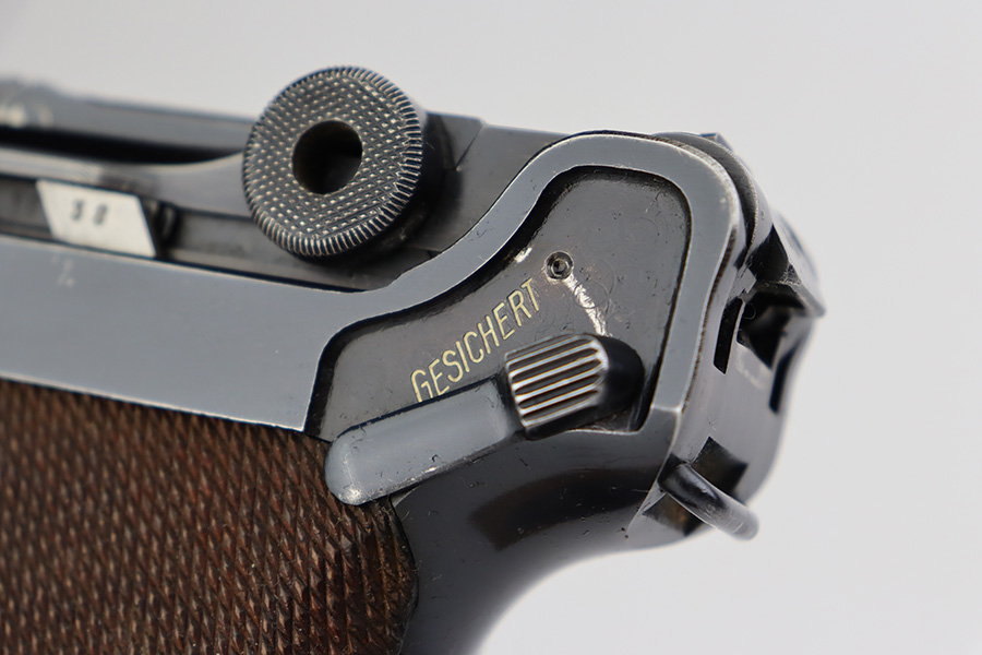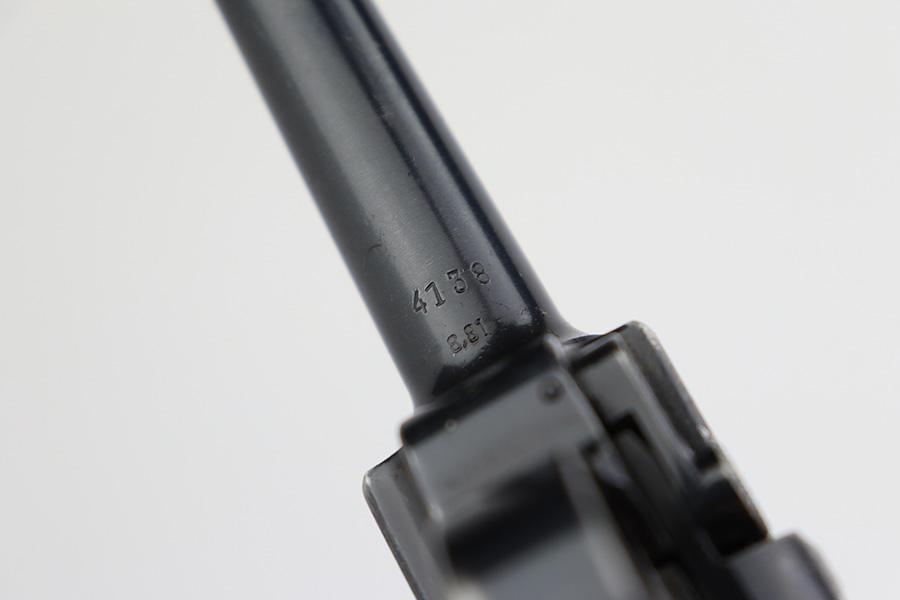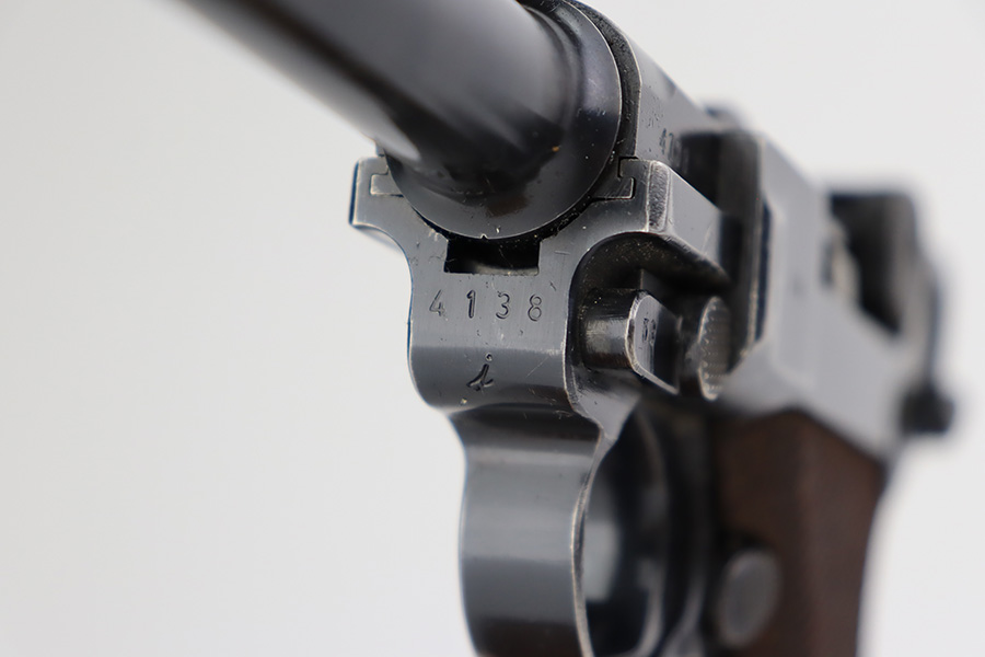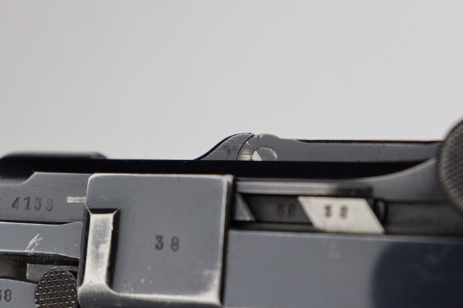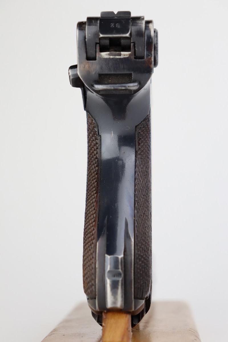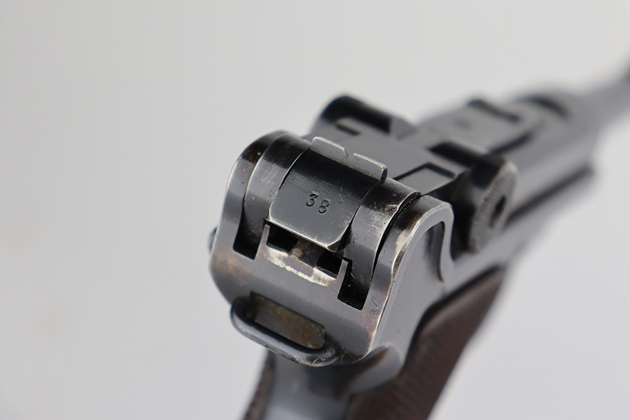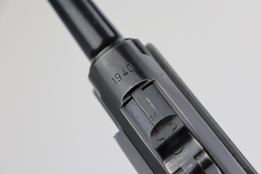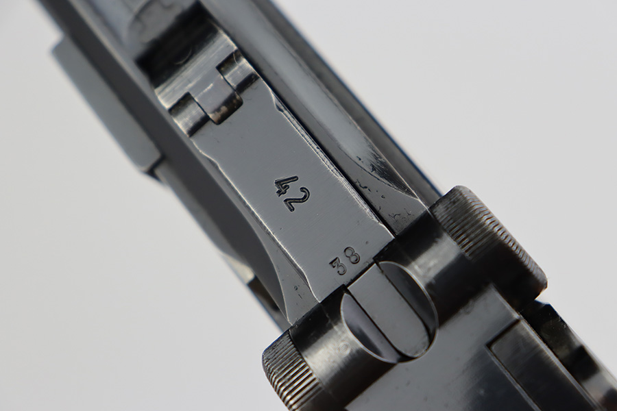 6/22/23 – This is a very nice example of a Mauser Luger issued to the Nazi military in 1940. All matching with the proper “Eagle 655” military acceptance proofs. It has retained about 90-92% of its original finish with areas of wear around the muzzle, on the side plate, on the front edges of the side rails, and one small area at the base of the front strap. A few tiny scratches on the left side of the frame. Fitted with excellent un-numbered but “Eagle 655” proofed wood grips. Comes with a mismatched “S/42” marked armorers replacement magazine. The bore has great rifling with minor freckling throughout.