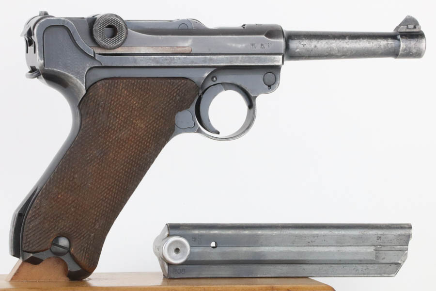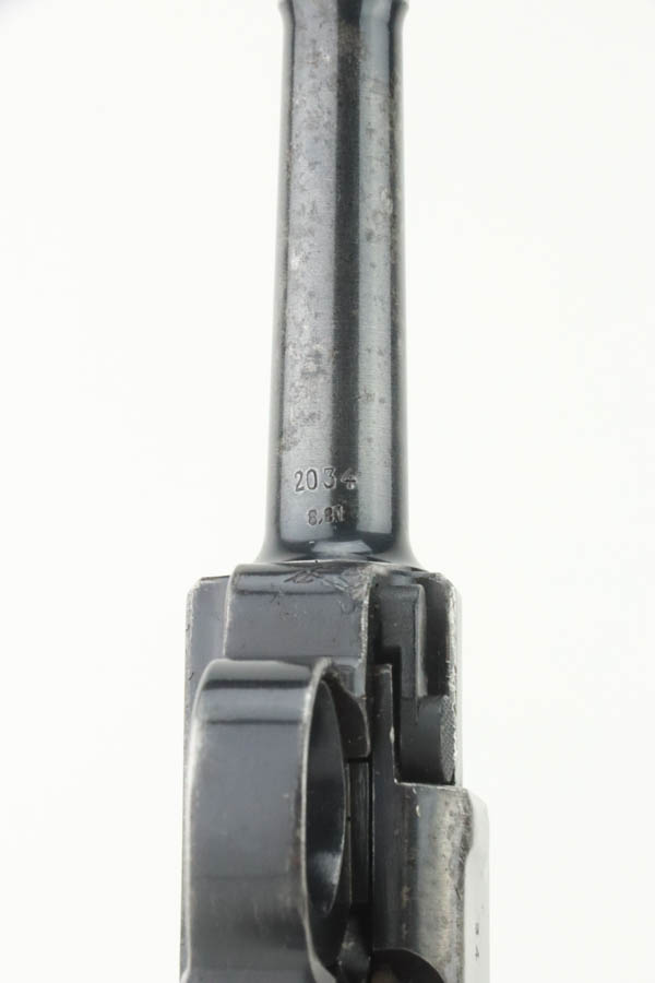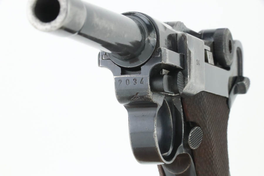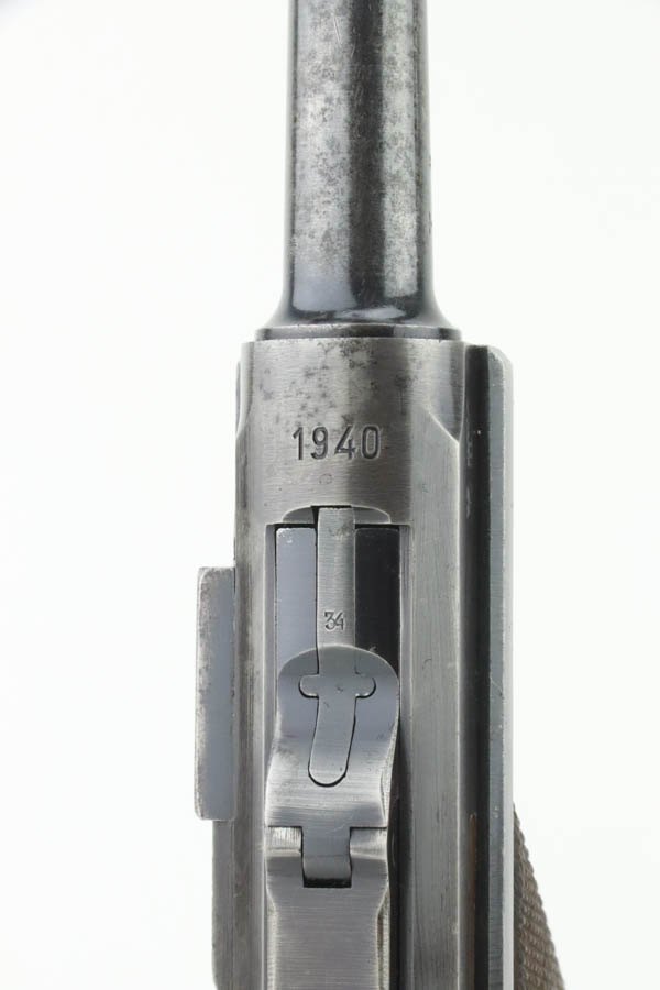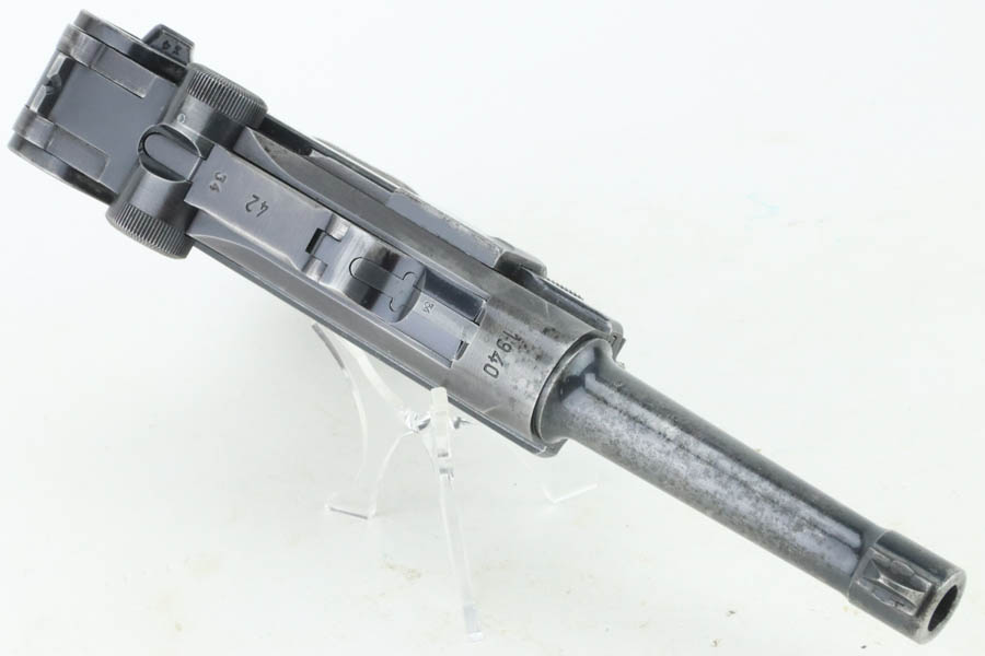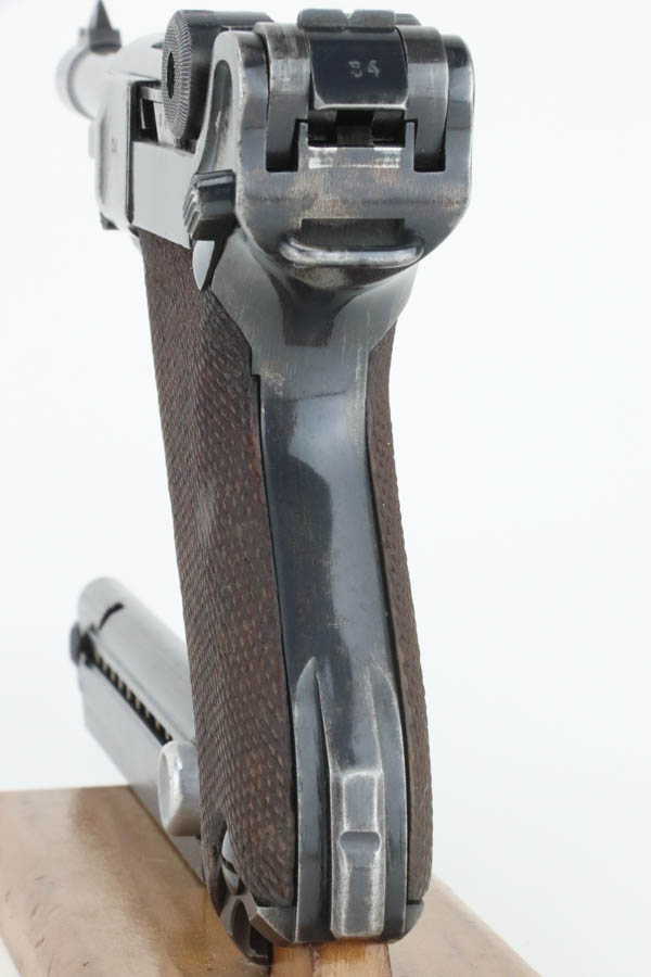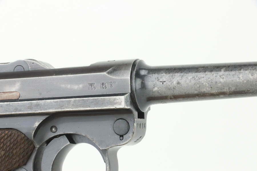 8/16/24 – This is a Mauser Luger issued to the Nazi military in 1940. The takedown lever is replaced, but the rest of the gun is matching. It has the proper “Eagle 655” military acceptance proofs. The gun’s original finish rates roughly 65-70% of its original finish with splotchy discoloration and pin-pricking on much of the gun. Some scratches on the front strap. Fitted with “Eagle 655” proofed wood grips and comes with a period-correct but mismatched magazine. The bore has pretty good rifling, but there is obvious pin-pricking throughout.