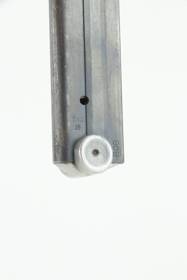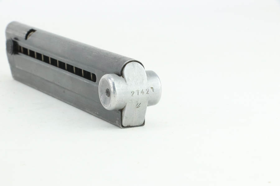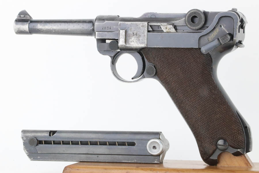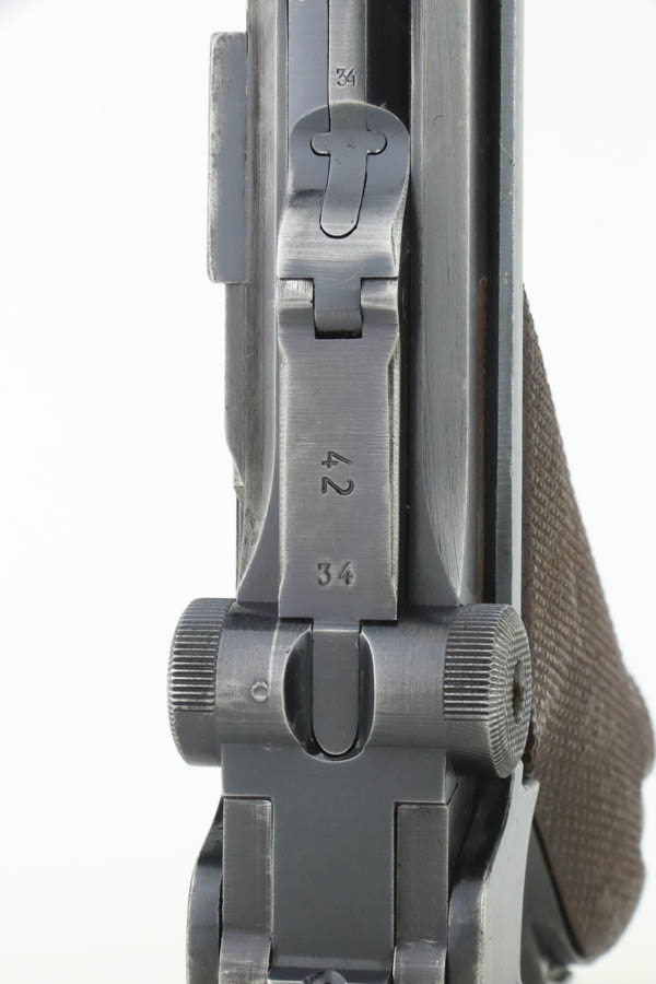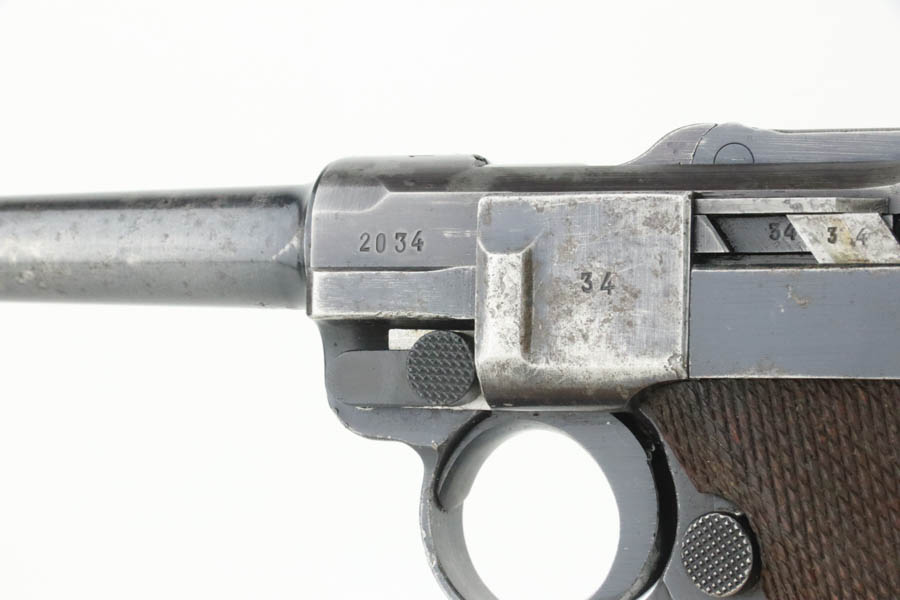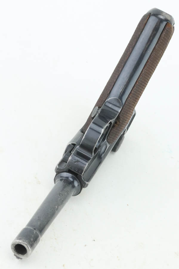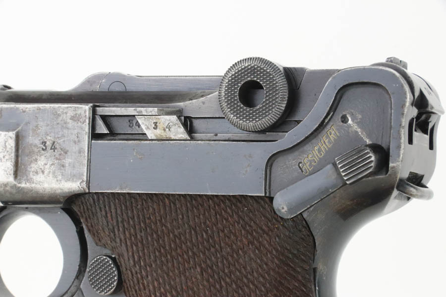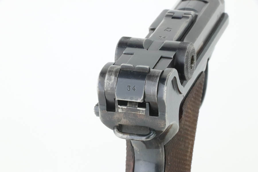 8/16/24 – This is a Mauser Luger issued to the Nazi military in 1940. The takedown lever is replaced, but the rest of the gun is matching. It has the proper “Eagle 655” military acceptance proofs. The gun’s original finish rates roughly 65-70% of its original finish with splotchy discoloration and pin-pricking on much of the gun. Some scratches on the front strap. Fitted with “Eagle 655” proofed wood grips and comes with a period-correct but mismatched magazine. The bore has pretty good rifling, but there is obvious pin-pricking throughout.