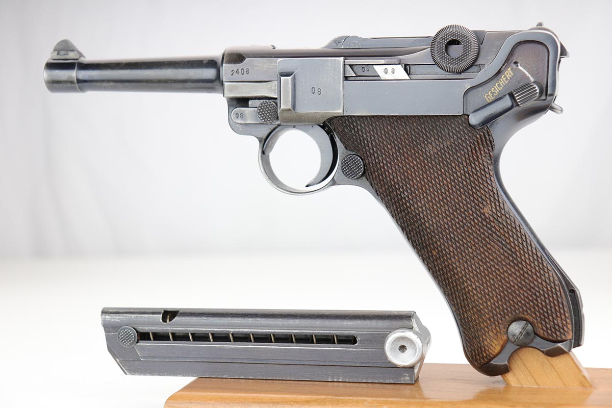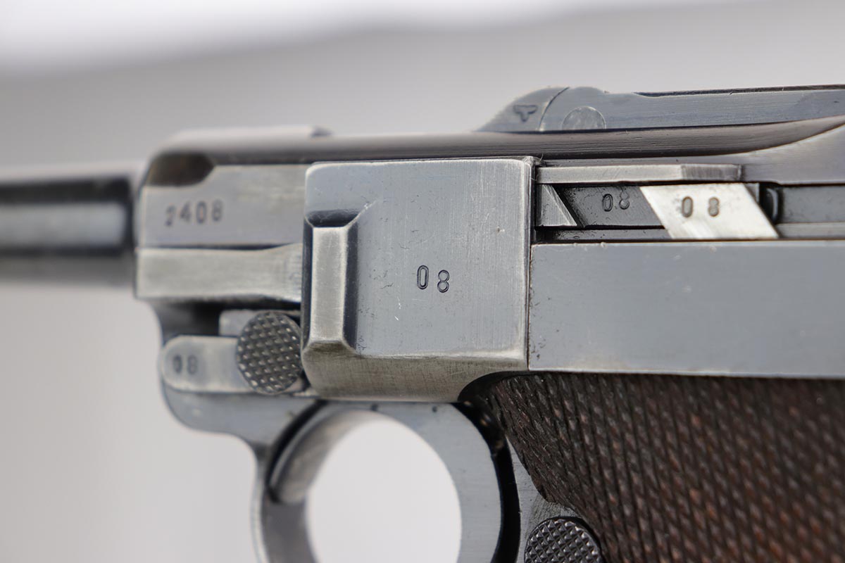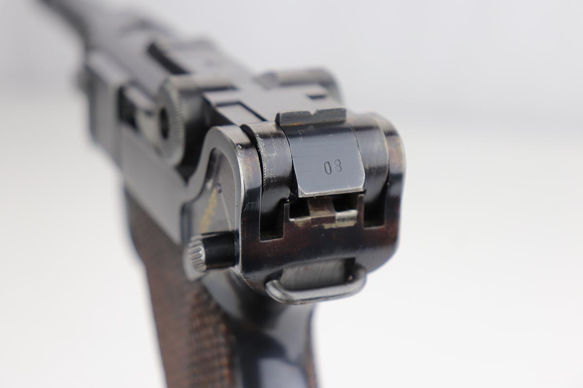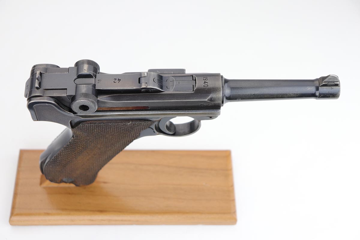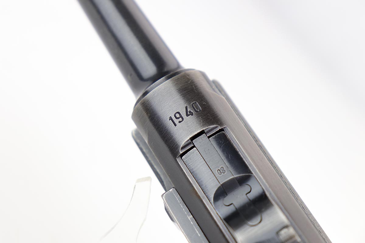 12/27/19 – This is an all matching and original Mauser Luger from 1940. The blue rates at maybe 90%, with some finish loss on the sides of the barrel, side plate and straps. There are also a few areas of patination. Grips are E/655 proofed but not numbered. Magazine is period original but mismatched. Excellent bore.