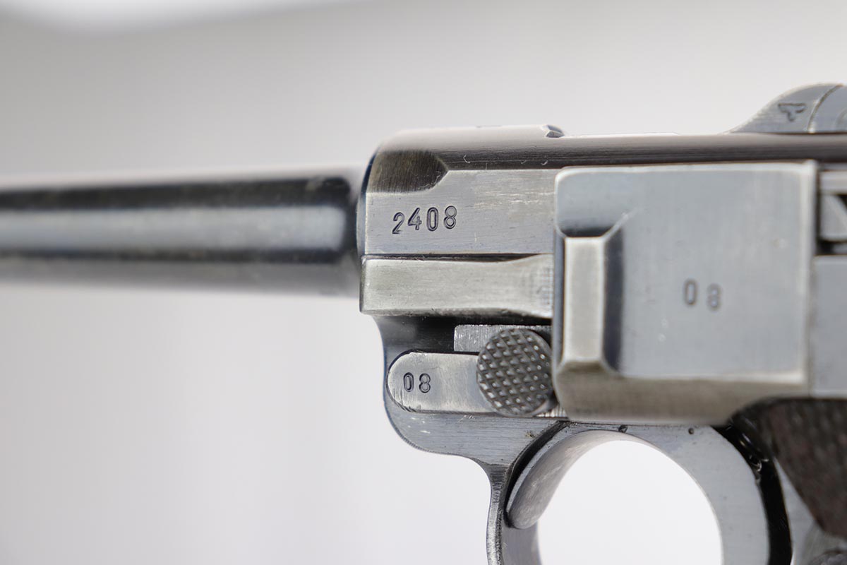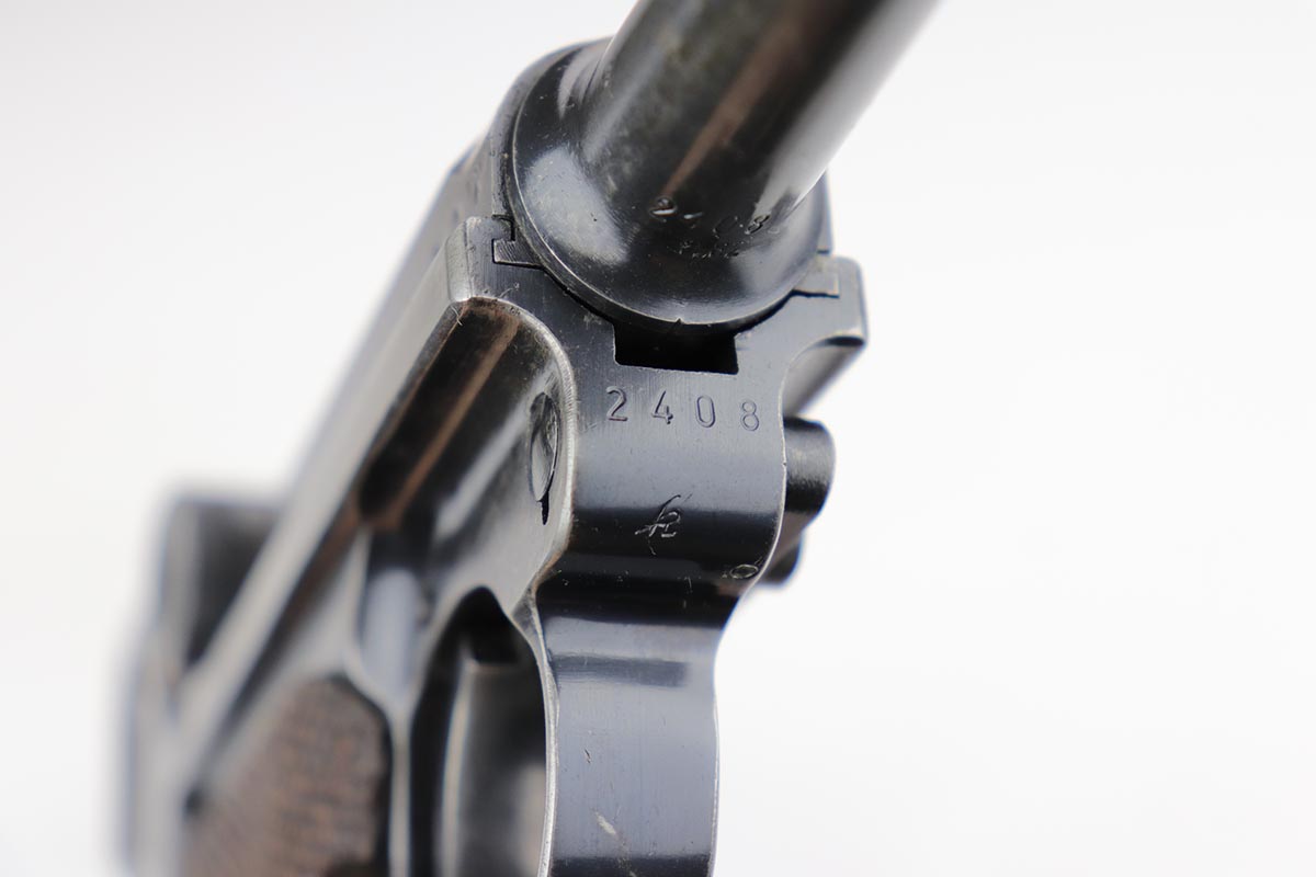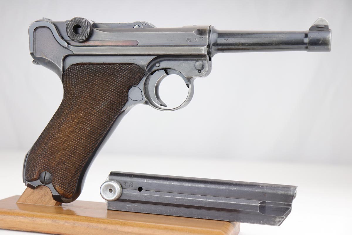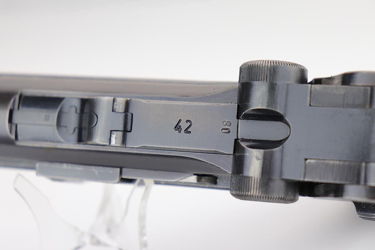 12/27/19 – This is an all matching and original Mauser Luger from 1940. The blue rates at maybe 90%, with some finish loss on the sides of the barrel, side plate and straps. There are also a few areas of patination. Grips are E/655 proofed but not numbered. Magazine is period original but mismatched. Excellent bore.