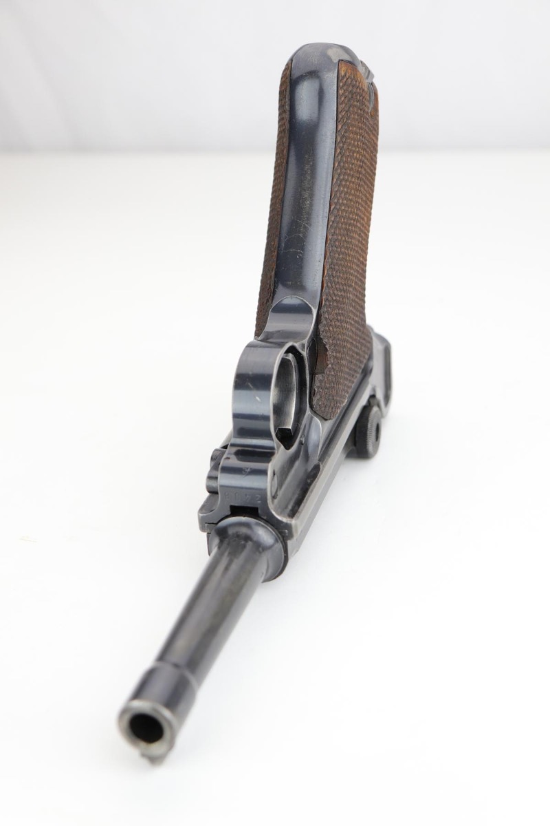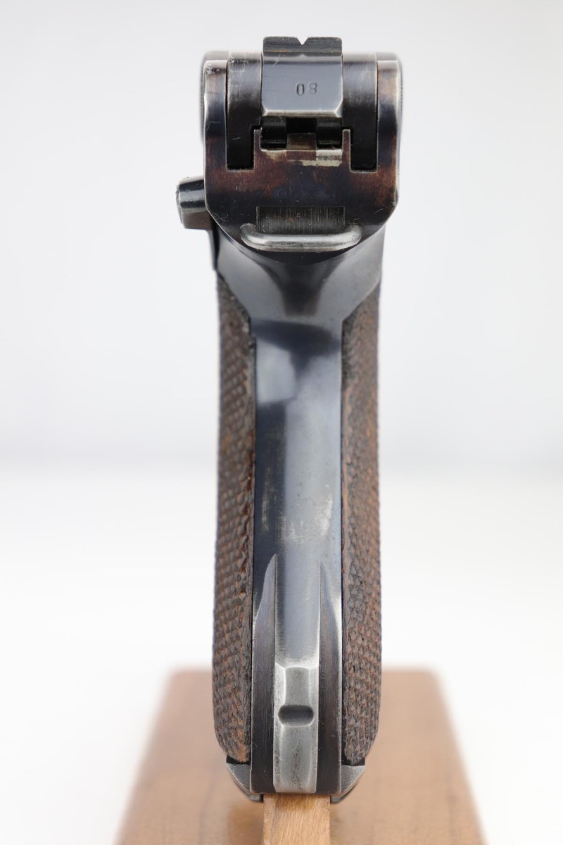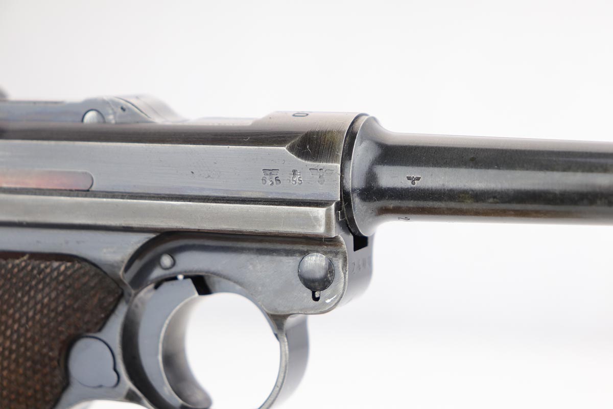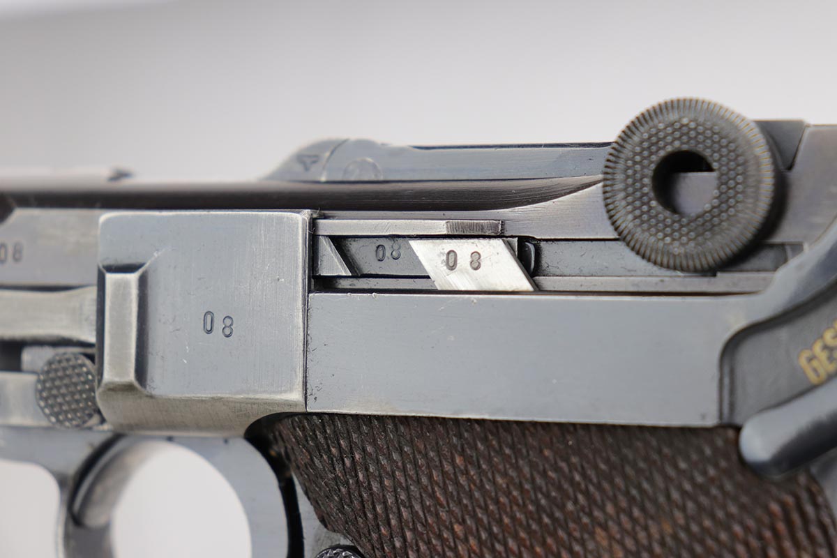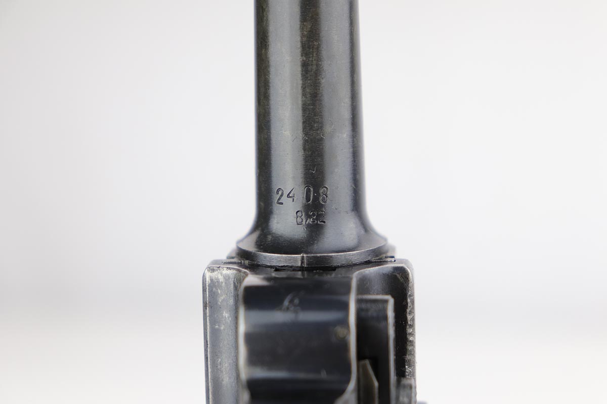 12/27/19 – This is an all matching and original Mauser Luger from 1940. The blue rates at maybe 90%, with some finish loss on the sides of the barrel, side plate and straps. There are also a few areas of patination. Grips are E/655 proofed but not numbered. Magazine is period original but mismatched. Excellent bore.