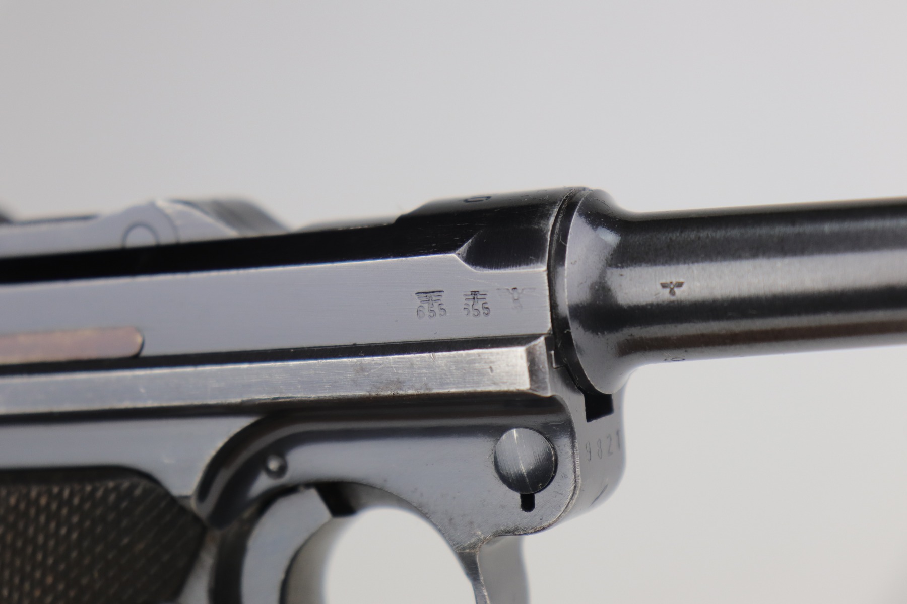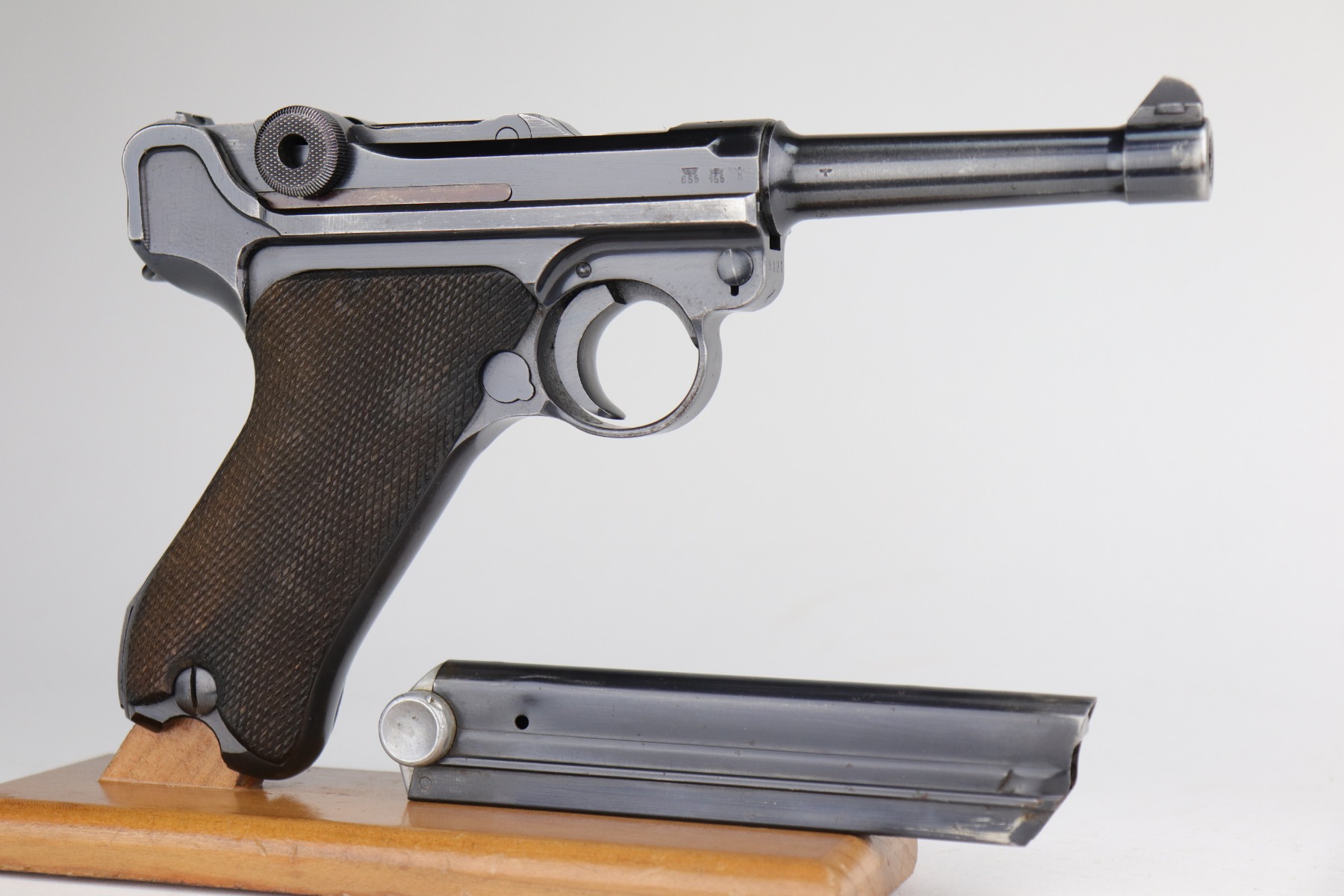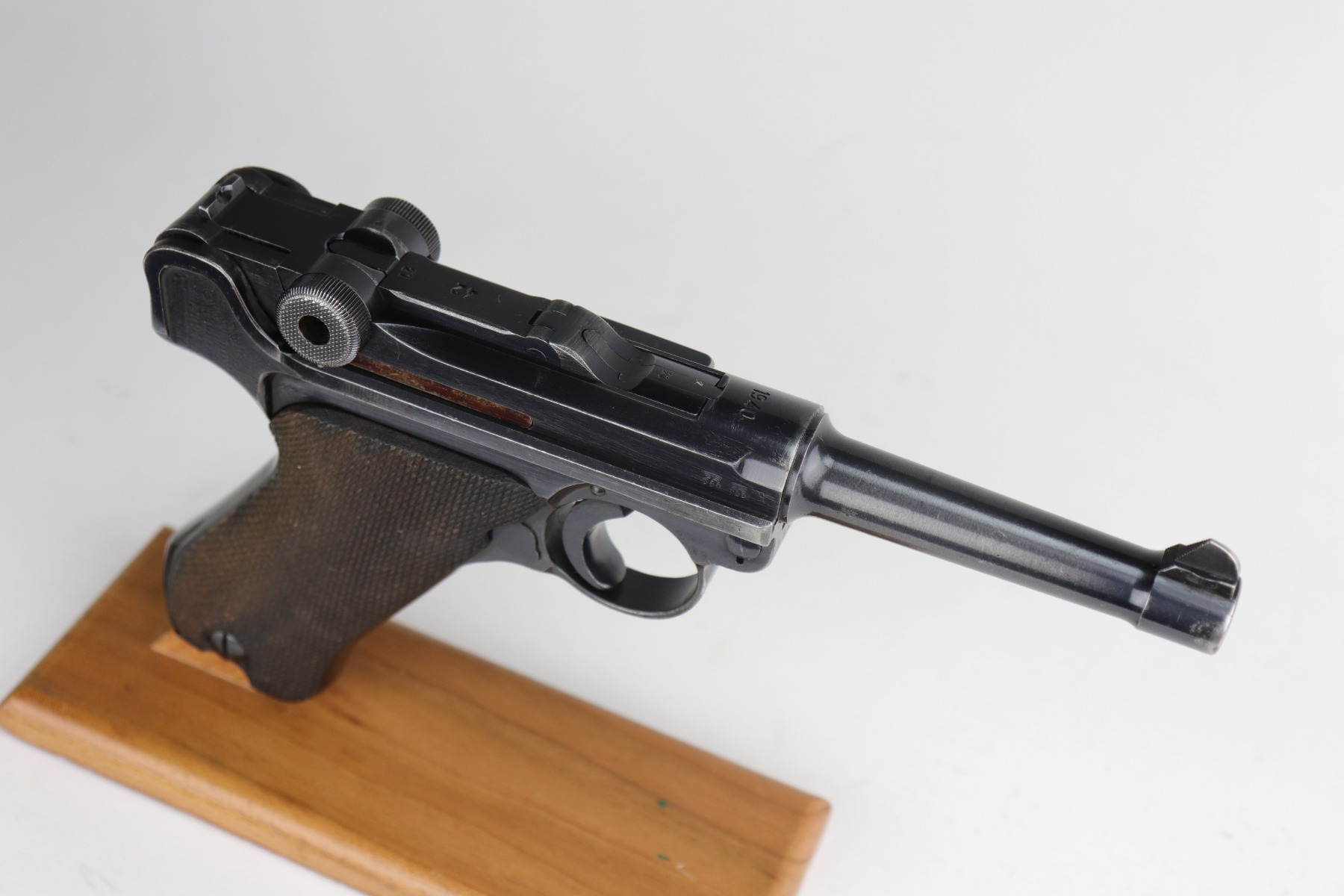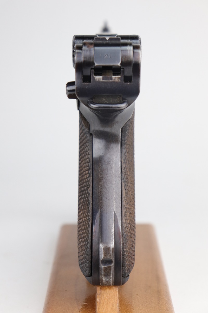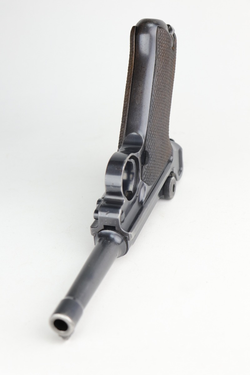12/29/20 – This is a very nice example of a Mauser Luger issued to the Nazi military in 1940. It has the proper “Eagle 655” Nazi military acceptance proofs. It is all matching except the side plate. It has retained somewhere between 85-90% of its original bluing. There is minor thinning on the straps and barrel. Minor wear around the muzzle, side plate, and high edges of the frame. There is spotty oxidation on the straps and one area on the left side of the frame. Comes with nice un-numbered grips – small chip in the left panel. Also comes with a mismatched period-correct magazine. The bore is near-mint.