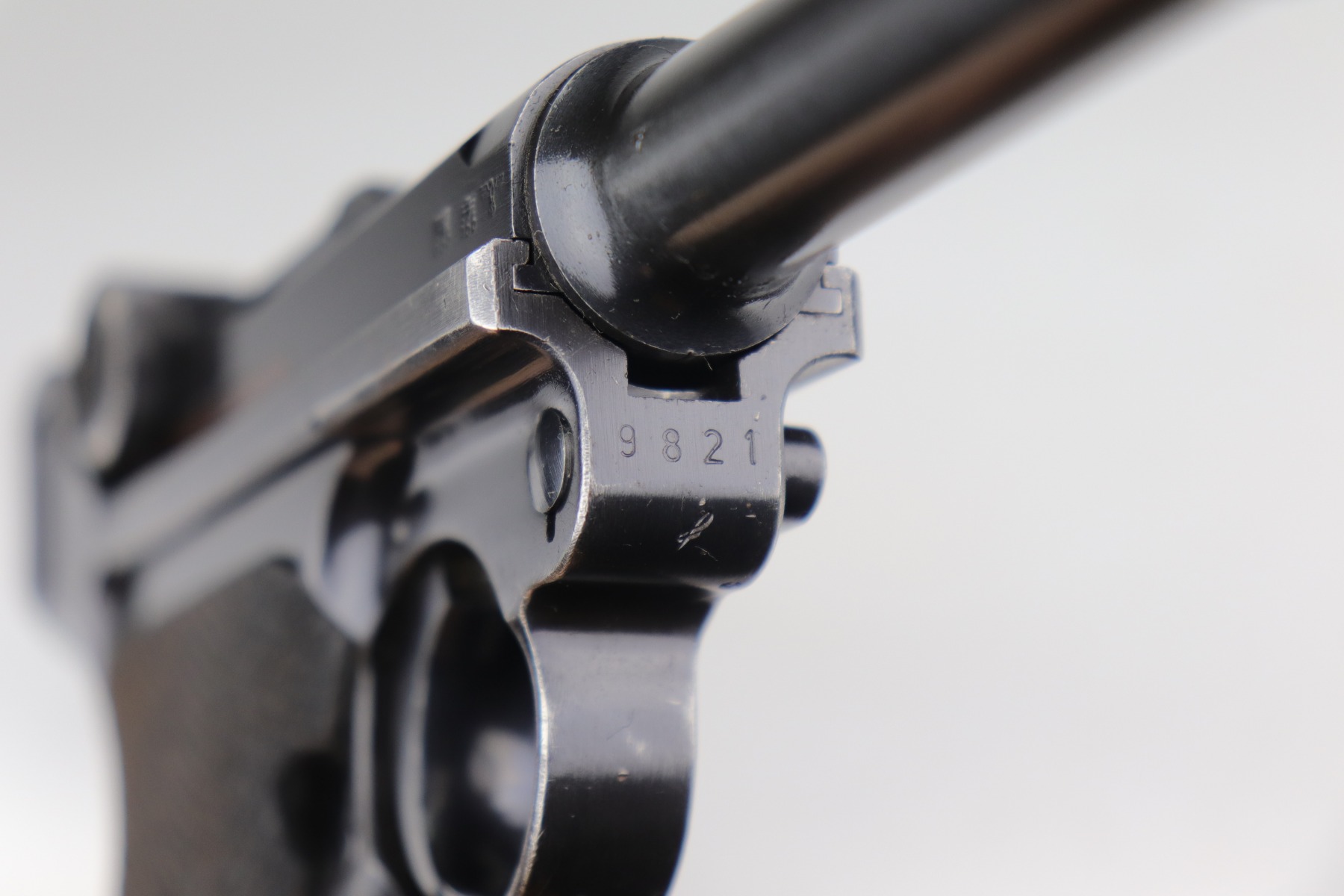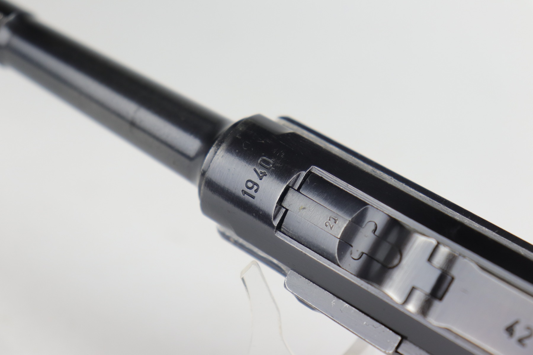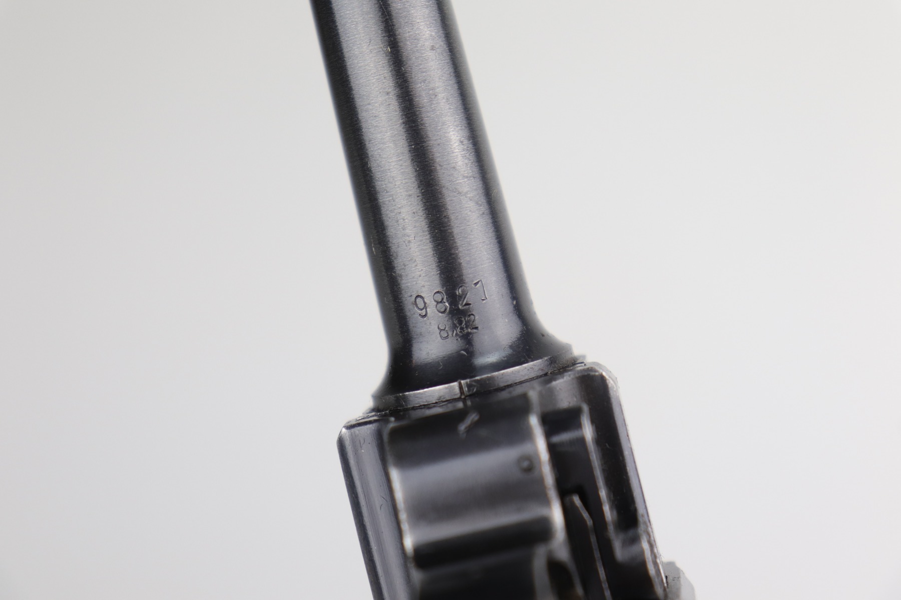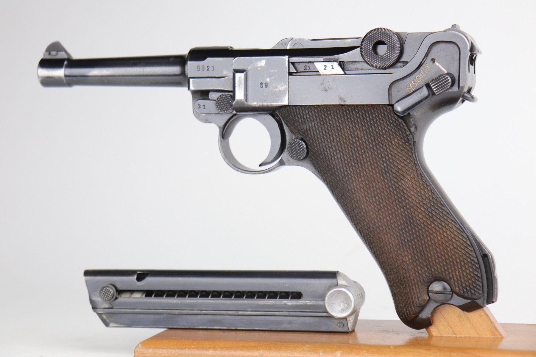 12/29/20 – This is a very nice example of a Mauser Luger issued to the Nazi military in 1940. It has the proper “Eagle 655” Nazi military acceptance proofs. It is all matching except the side plate. It has retained somewhere between 85-90% of its original bluing. There is minor thinning on the straps and barrel. Minor wear around the muzzle, side plate, and high edges of the frame. There is spotty oxidation on the straps and one area on the left side of the frame. Comes with nice un-numbered grips – small chip in the left panel. Also comes with a mismatched period-correct magazine. The bore is near-mint.