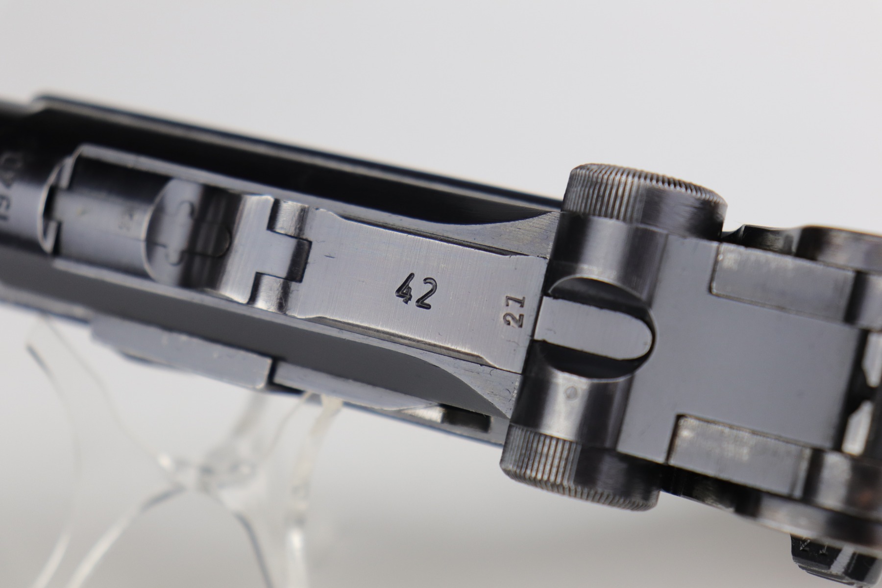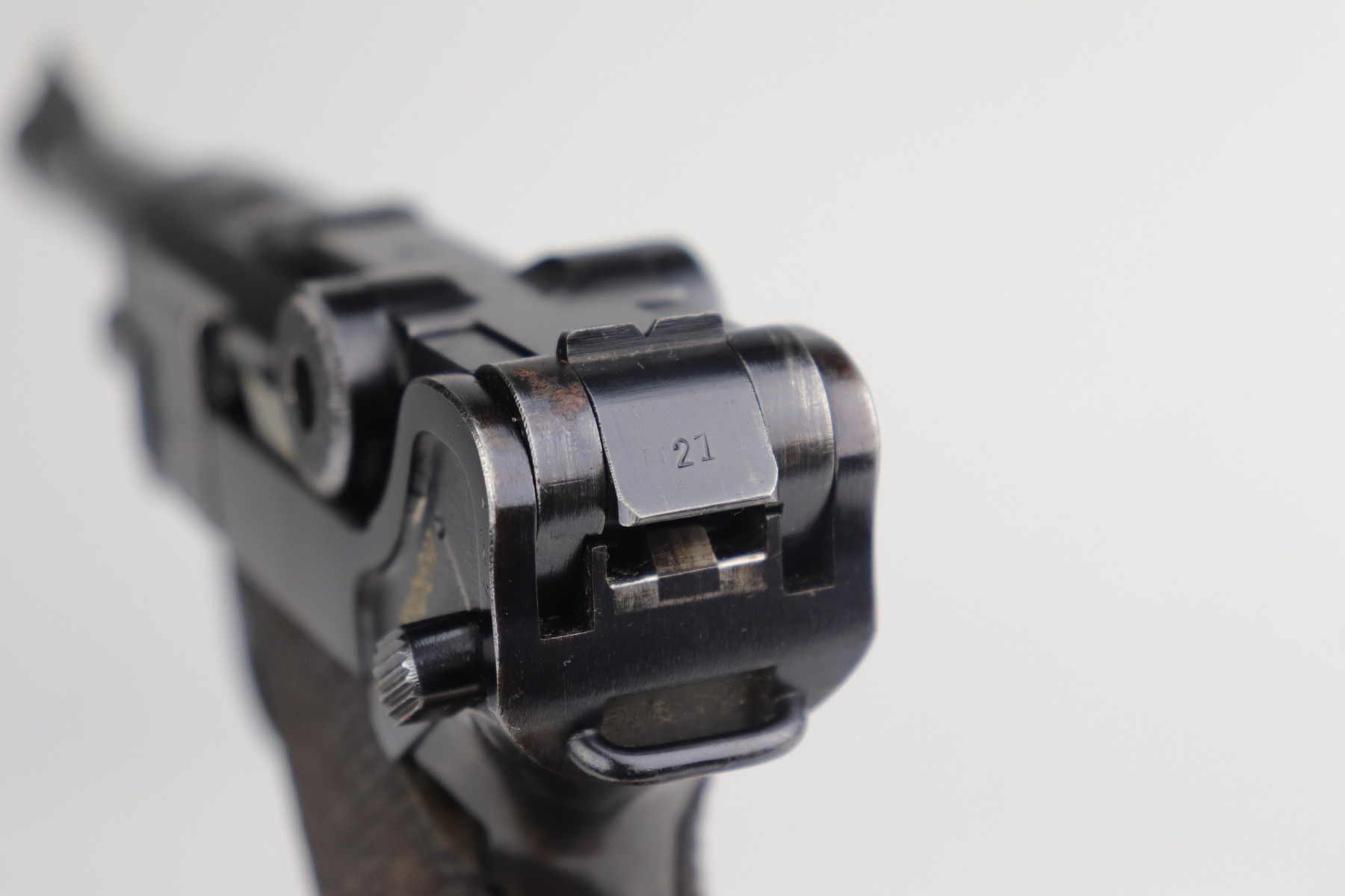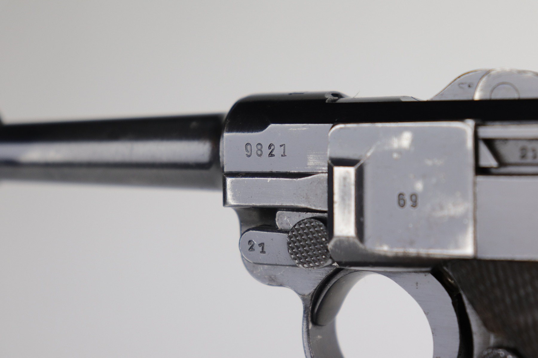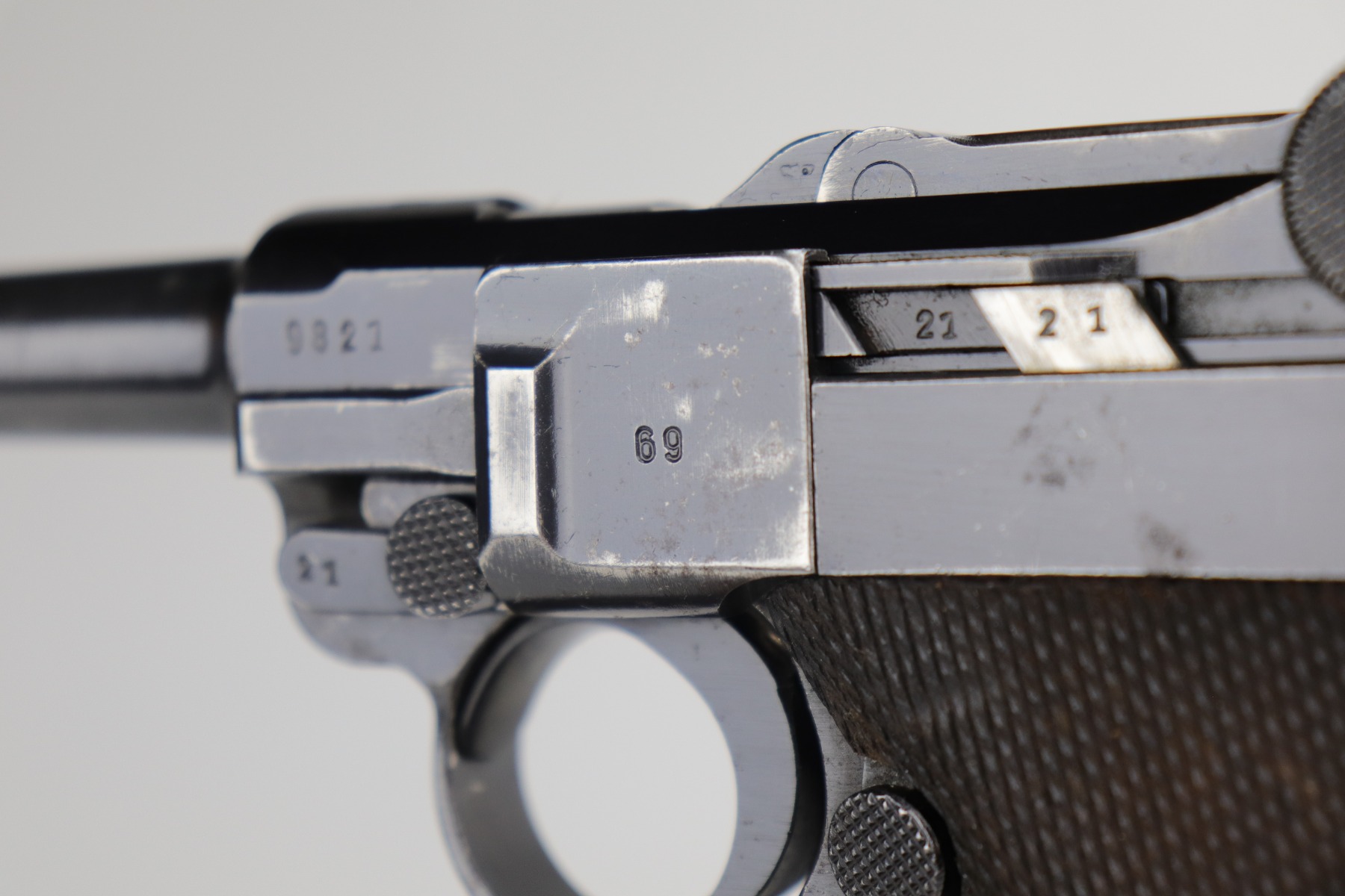 12/29/20 – This is a very nice example of a Mauser Luger issued to the Nazi military in 1940. It has the proper “Eagle 655” Nazi military acceptance proofs. It is all matching except the side plate. It has retained somewhere between 85-90% of its original bluing. There is minor thinning on the straps and barrel. Minor wear around the muzzle, side plate, and high edges of the frame. There is spotty oxidation on the straps and one area on the left side of the frame. Comes with nice un-numbered grips – small chip in the left panel. Also comes with a mismatched period-correct magazine. The bore is near-mint.