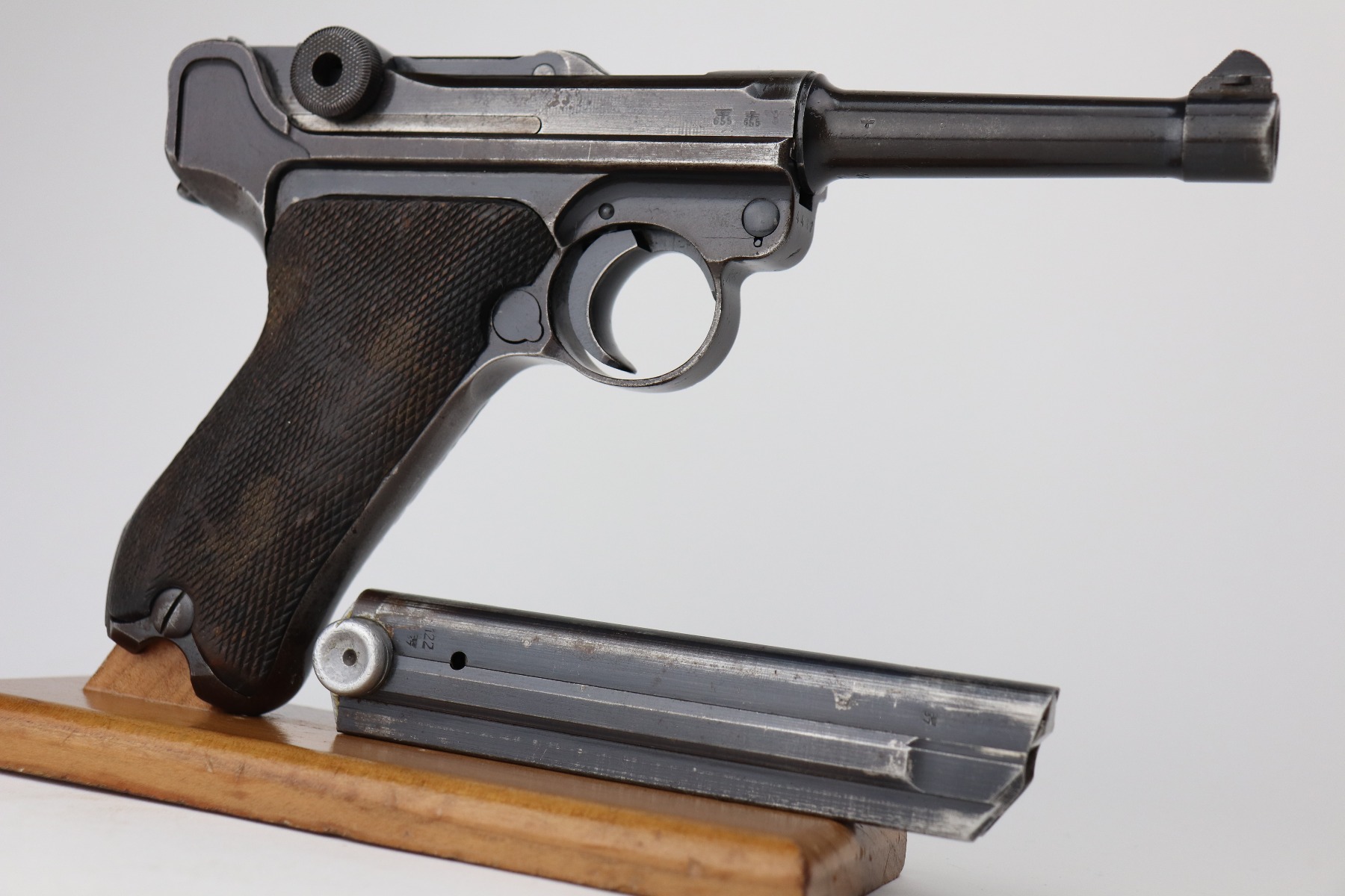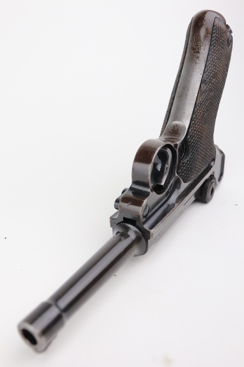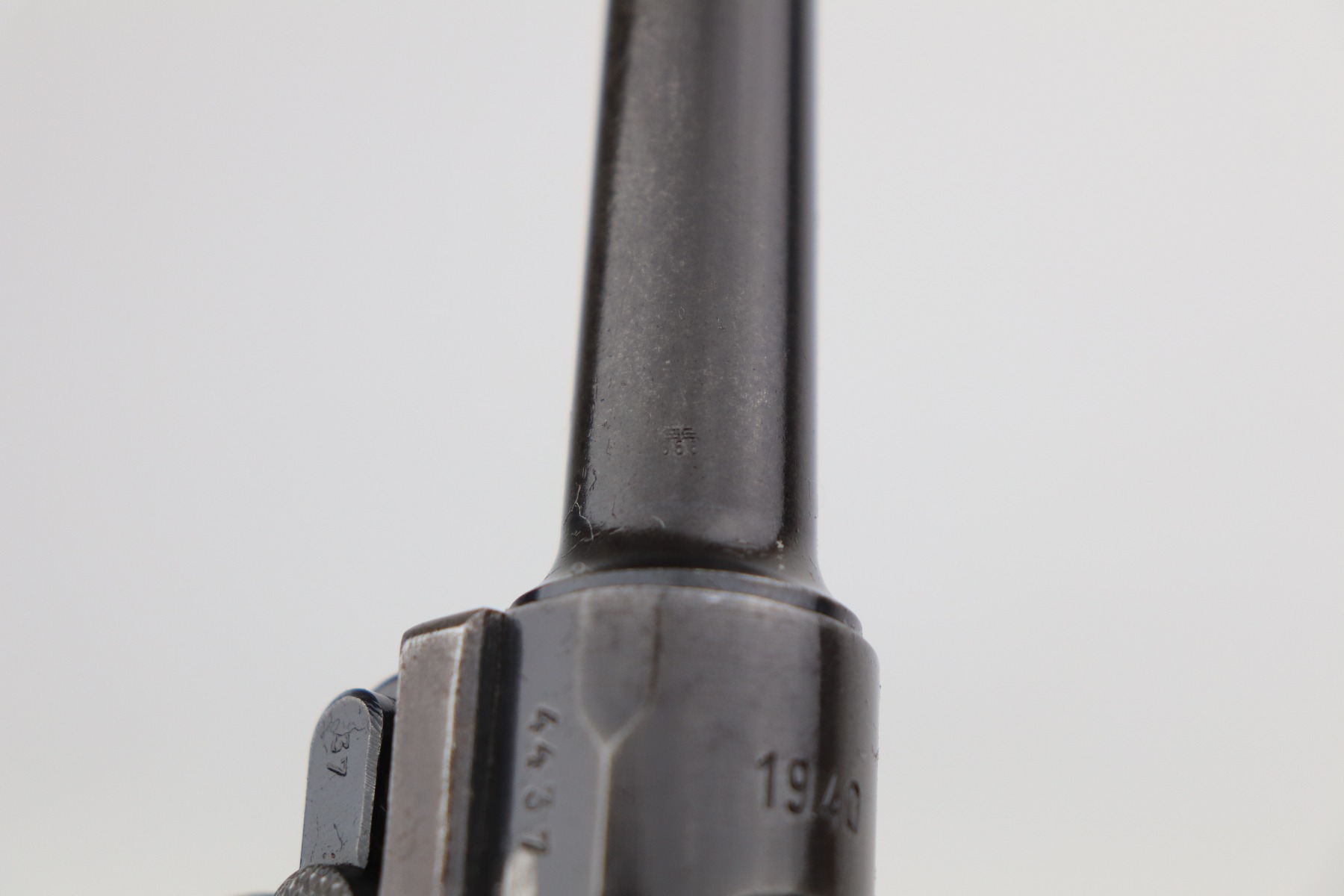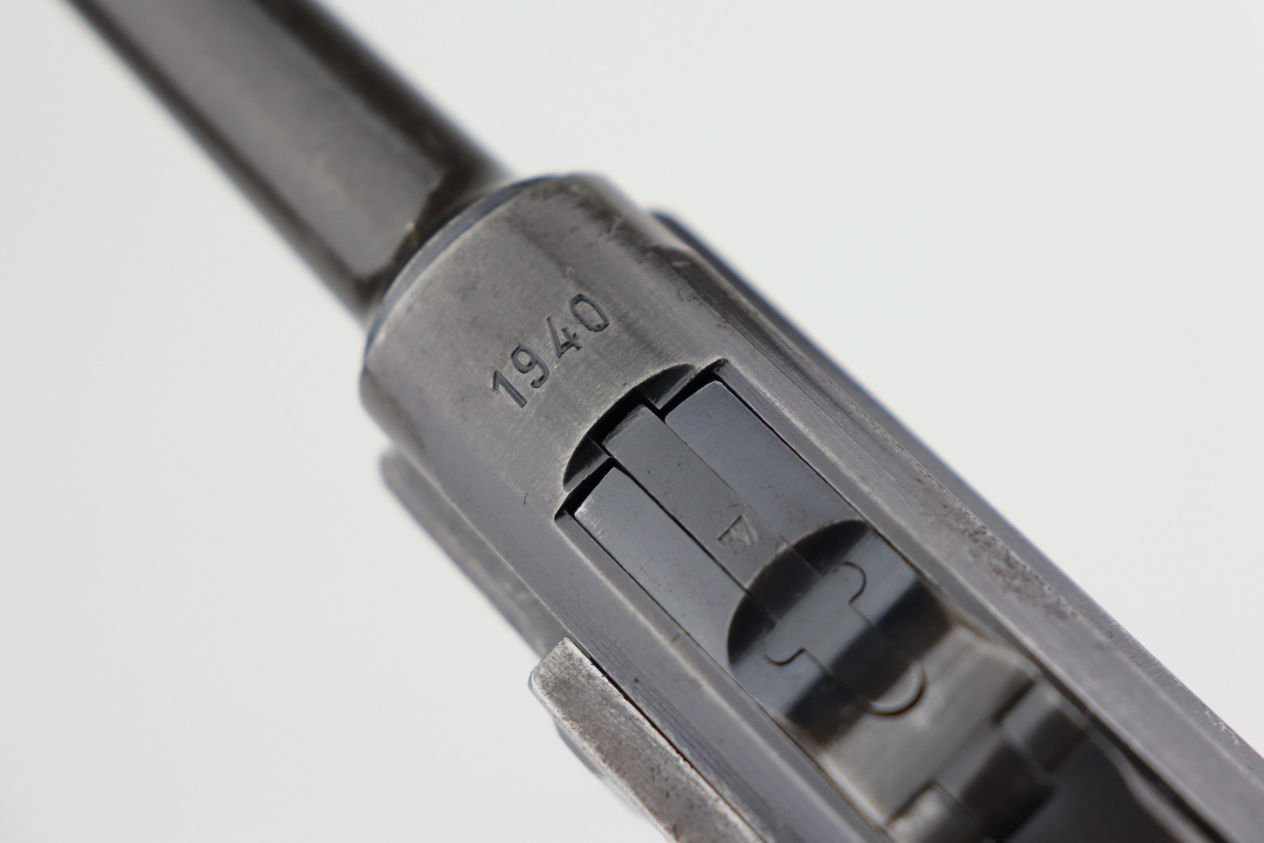 3/23/21 – This is an example of a Mauser Luger issued to the Nazi military in 1940. It is all matching and has the proper “Eagle 655” proofs. It comes with a matching magazine that we believe is factory-original but can’t say for sure. The gun has retained roughly 60% of its original finish. There is almost no finish left on the straps. Wear around the high edges and muzzle. Minor thinning on the slide and barrel. There is heavy spotty oxidation and patina throughout. There are one or two areas of pitting here and there. It comes with decent grips with a chip in the left panel. The bore is very nice – shiny with good rifling.