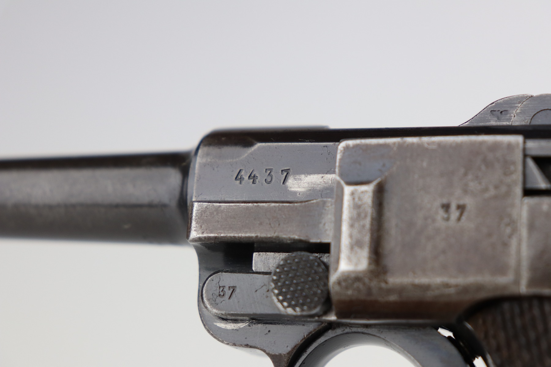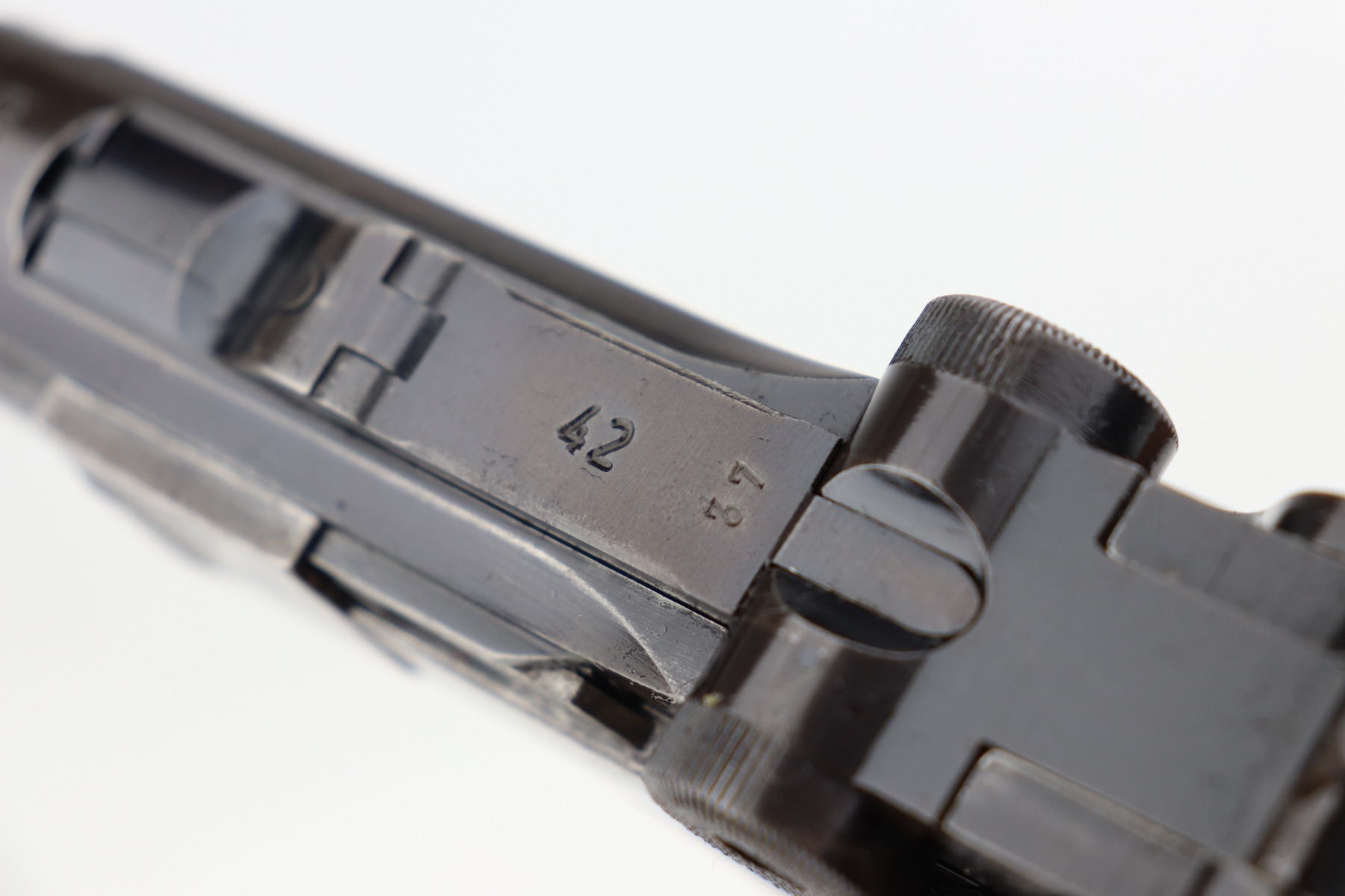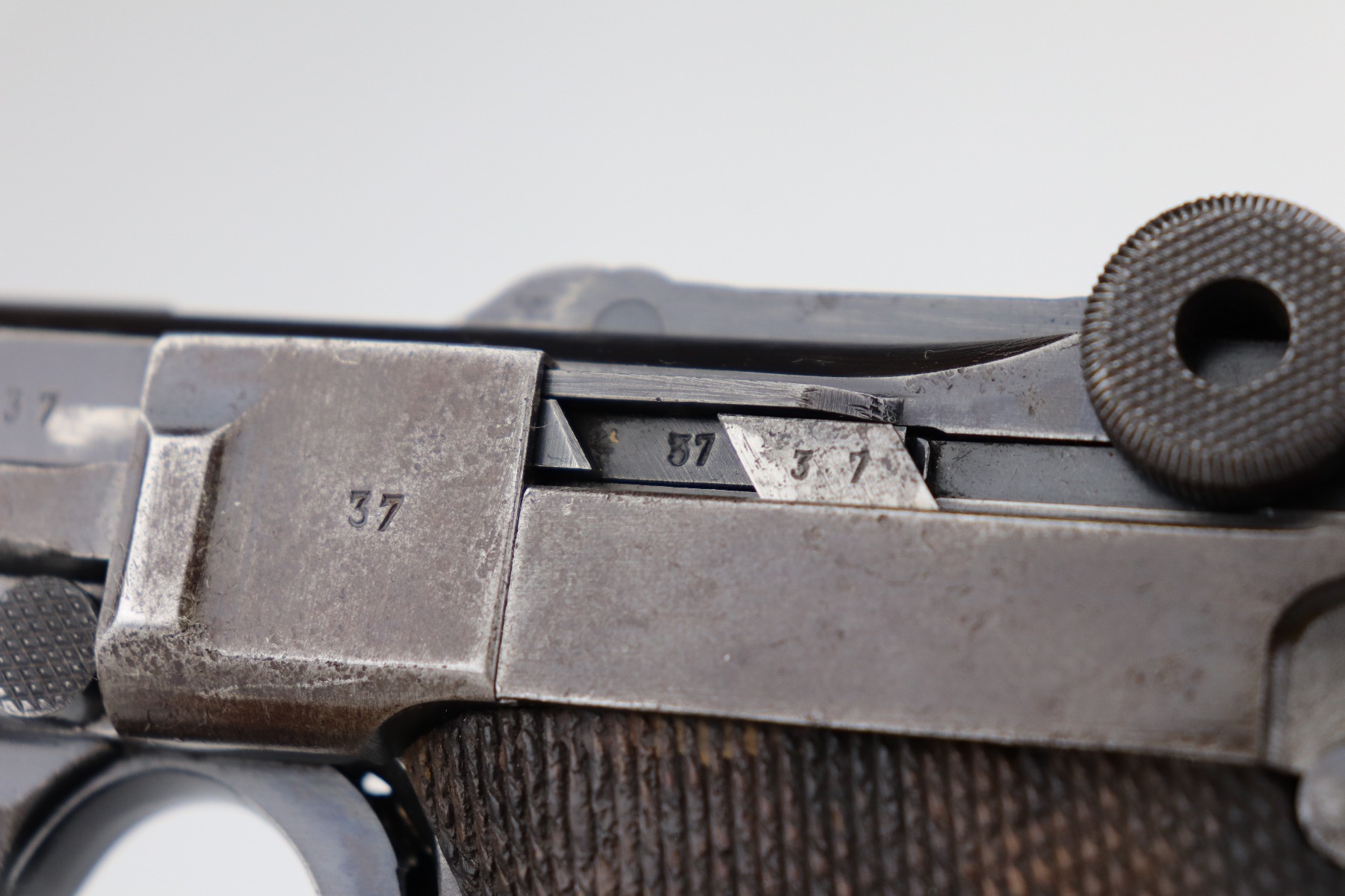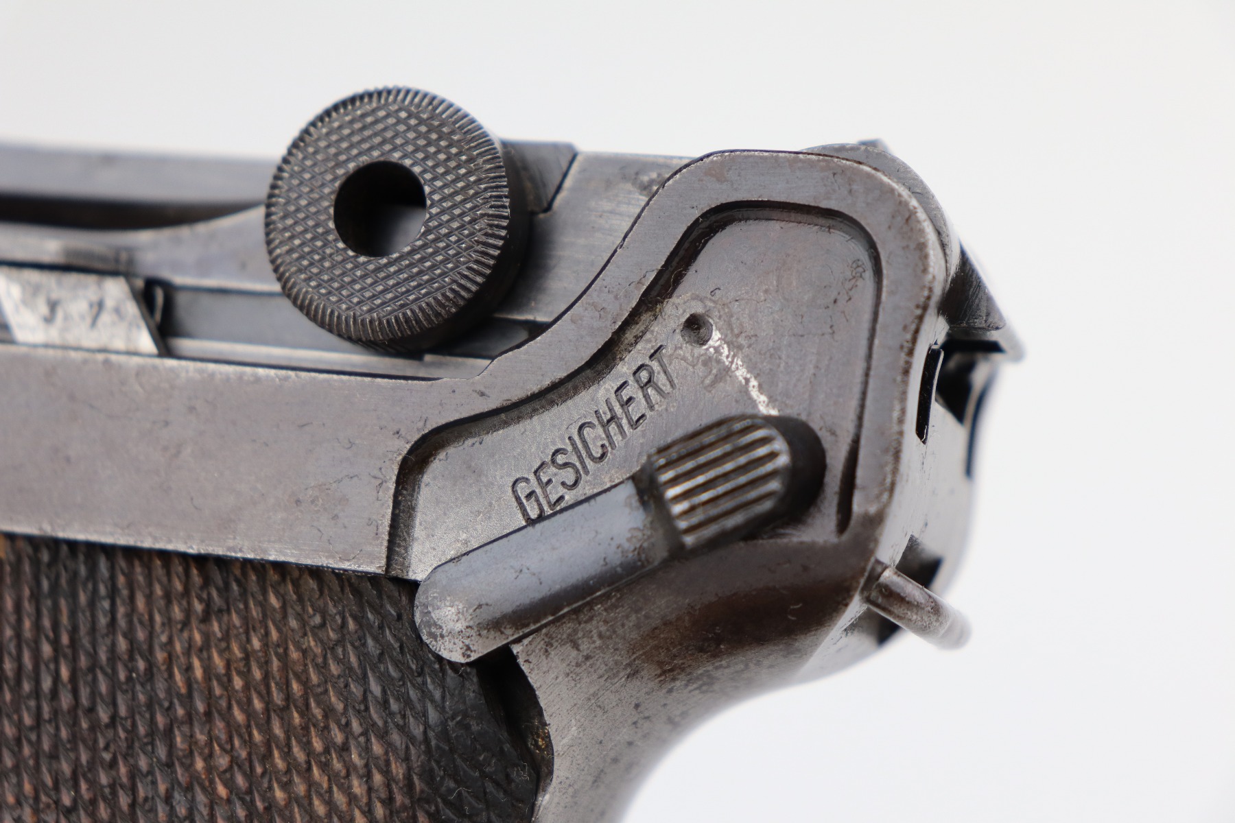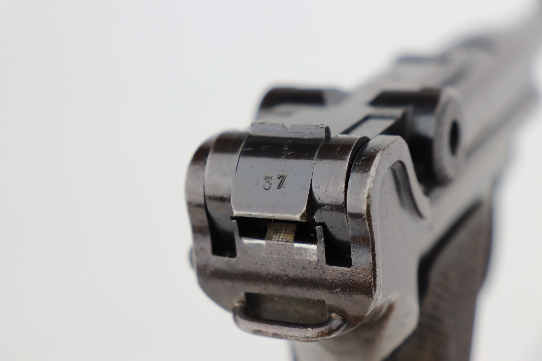 3/23/21 – This is an example of a Mauser Luger issued to the Nazi military in 1940. It is all matching and has the proper “Eagle 655” proofs. It comes with a matching magazine that we believe is factory-original but can’t say for sure. The gun has retained roughly 60% of its original finish. There is almost no finish left on the straps. Wear around the high edges and muzzle. Minor thinning on the slide and barrel. There is heavy spotty oxidation and patina throughout. There are one or two areas of pitting here and there. It comes with decent grips with a chip in the left panel. The bore is very nice – shiny with good rifling.