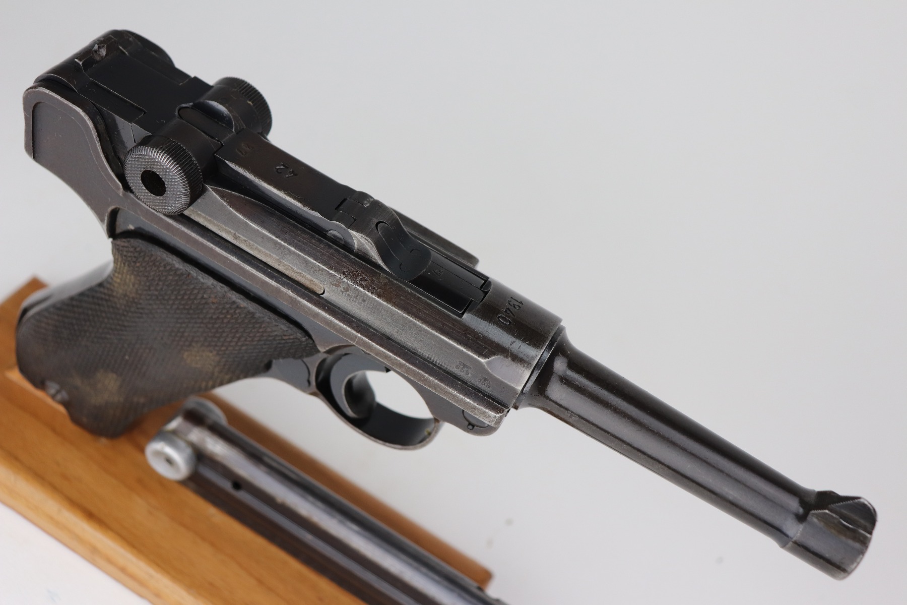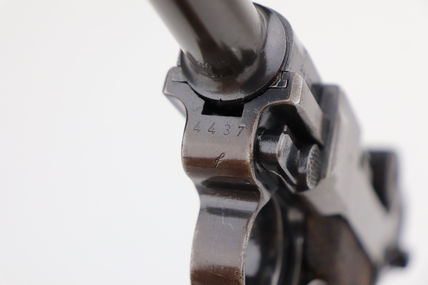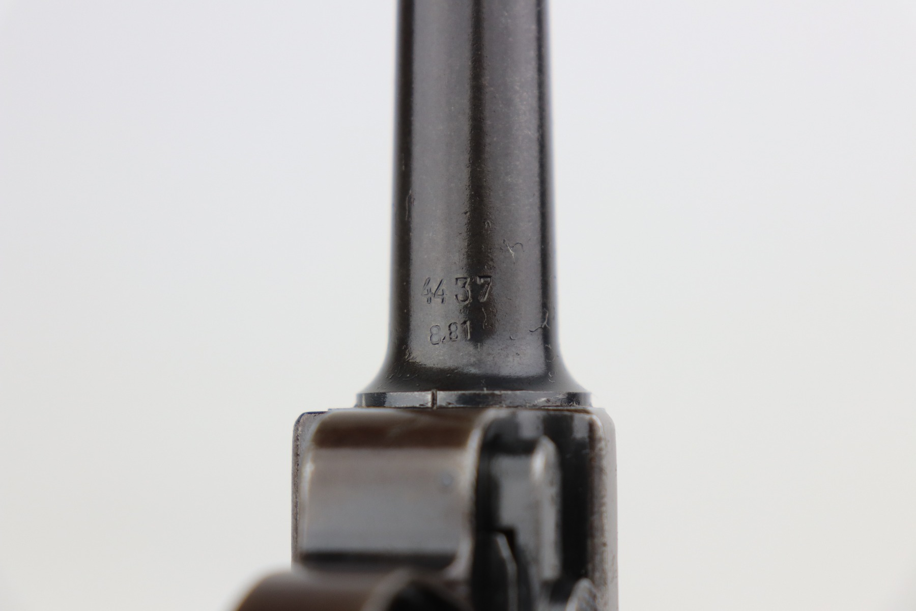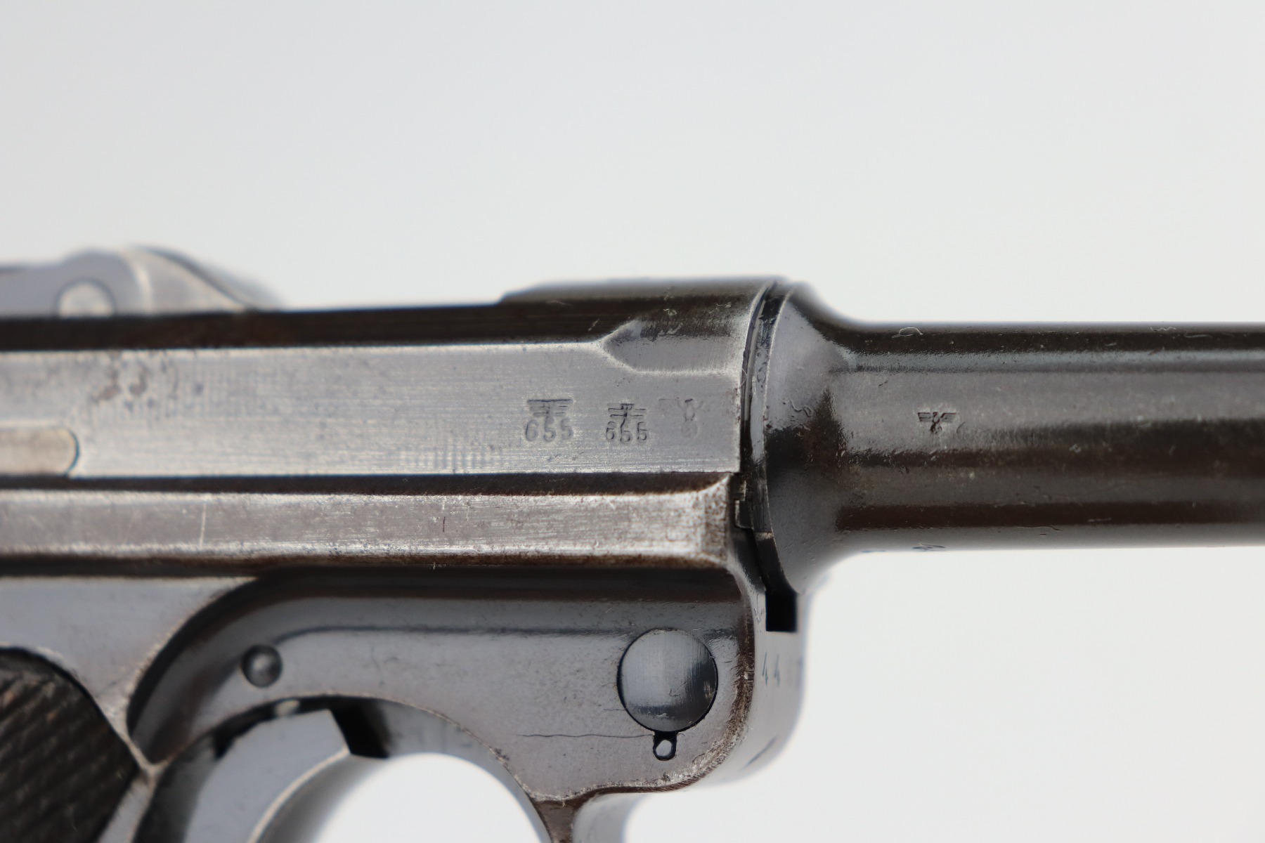 3/23/21 – This is an example of a Mauser Luger issued to the Nazi military in 1940. It is all matching and has the proper “Eagle 655” proofs. It comes with a matching magazine that we believe is factory-original but can’t say for sure. The gun has retained roughly 60% of its original finish. There is almost no finish left on the straps. Wear around the high edges and muzzle. Minor thinning on the slide and barrel. There is heavy spotty oxidation and patina throughout. There are one or two areas of pitting here and there. It comes with decent grips with a chip in the left panel. The bore is very nice – shiny with good rifling.
