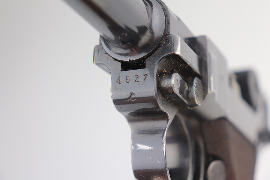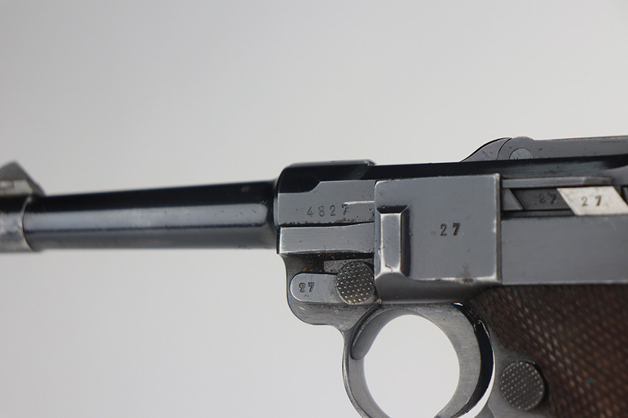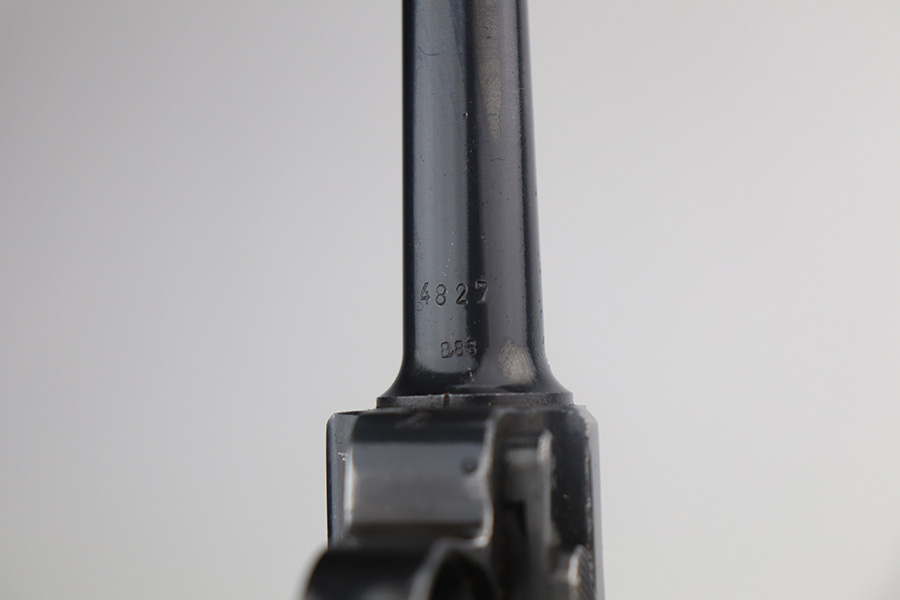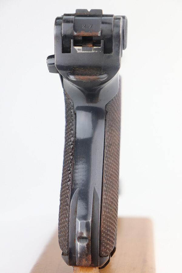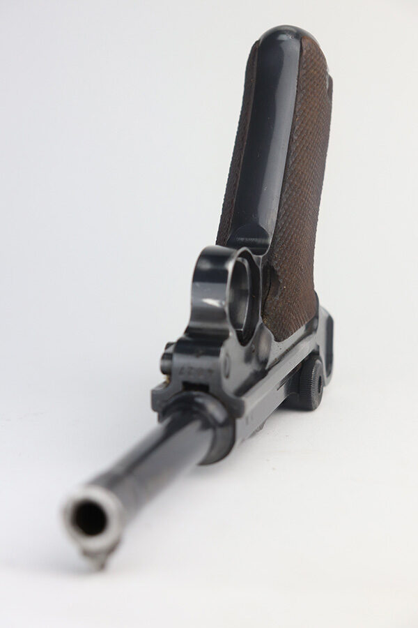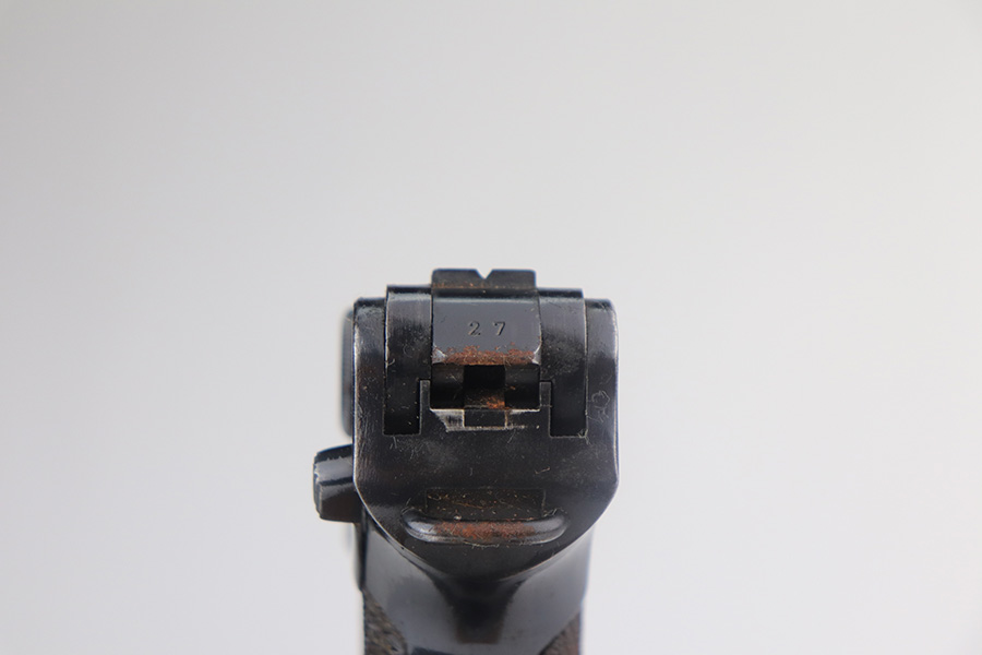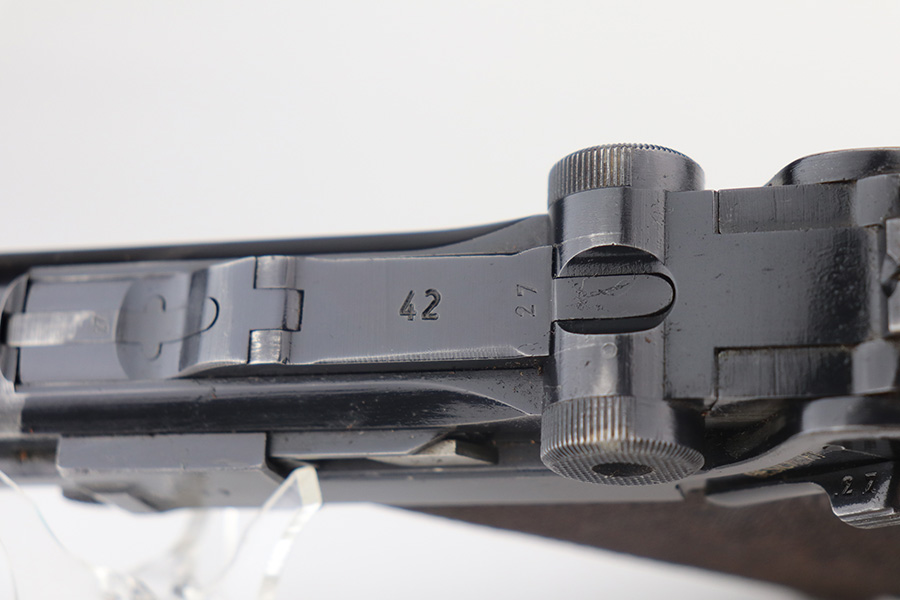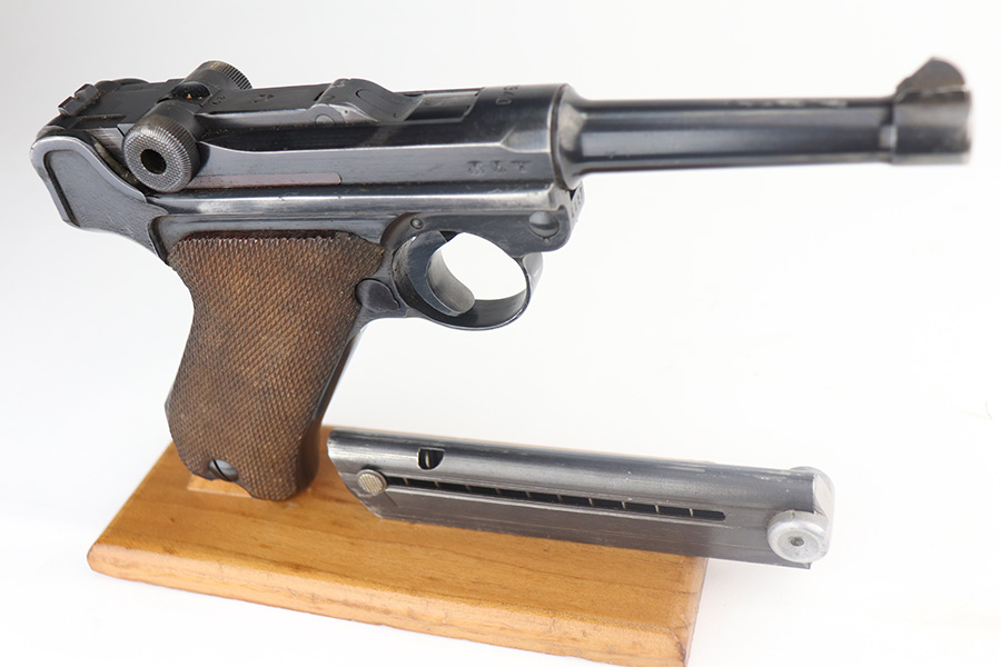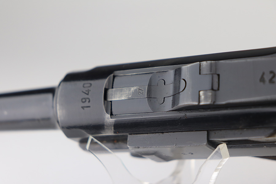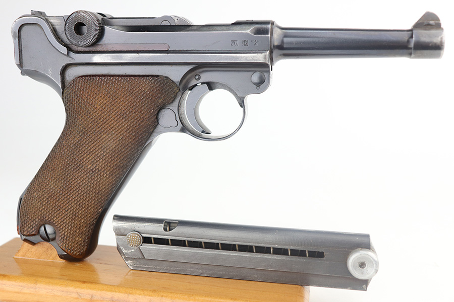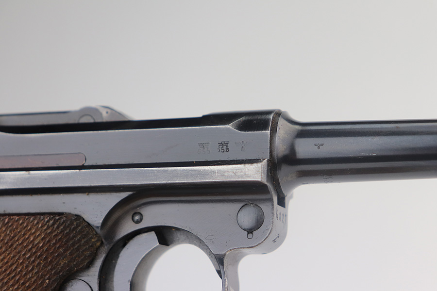 5/20/21 – This is a very nice example of a Mauser Luger P.08 issued to the Nazi military in 1940. The gun is all matching and has the proper “Eagle 655” military proofs. It has retained about 92-94% of its original bluing. There are areas of minor wear at the base of the straps, side plate, side rails, top of the barrel, and around the muzzle. Minor oxidation around the muzzle and a small spot of light rust on the stock lug. Comes with excellent matching grips and one original matching magazine. The bore is shiny with strong rifling and very minor freckling here and there.