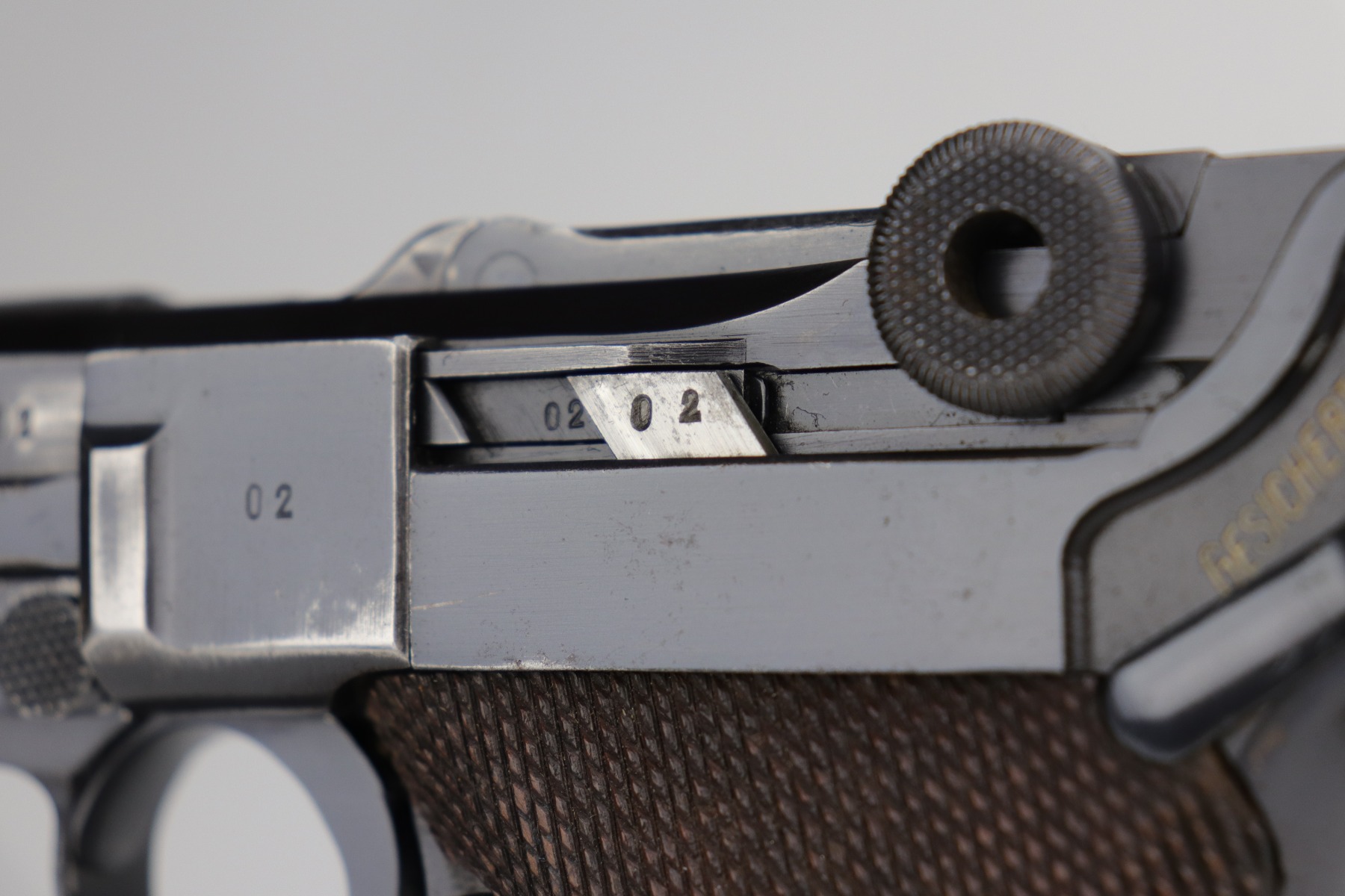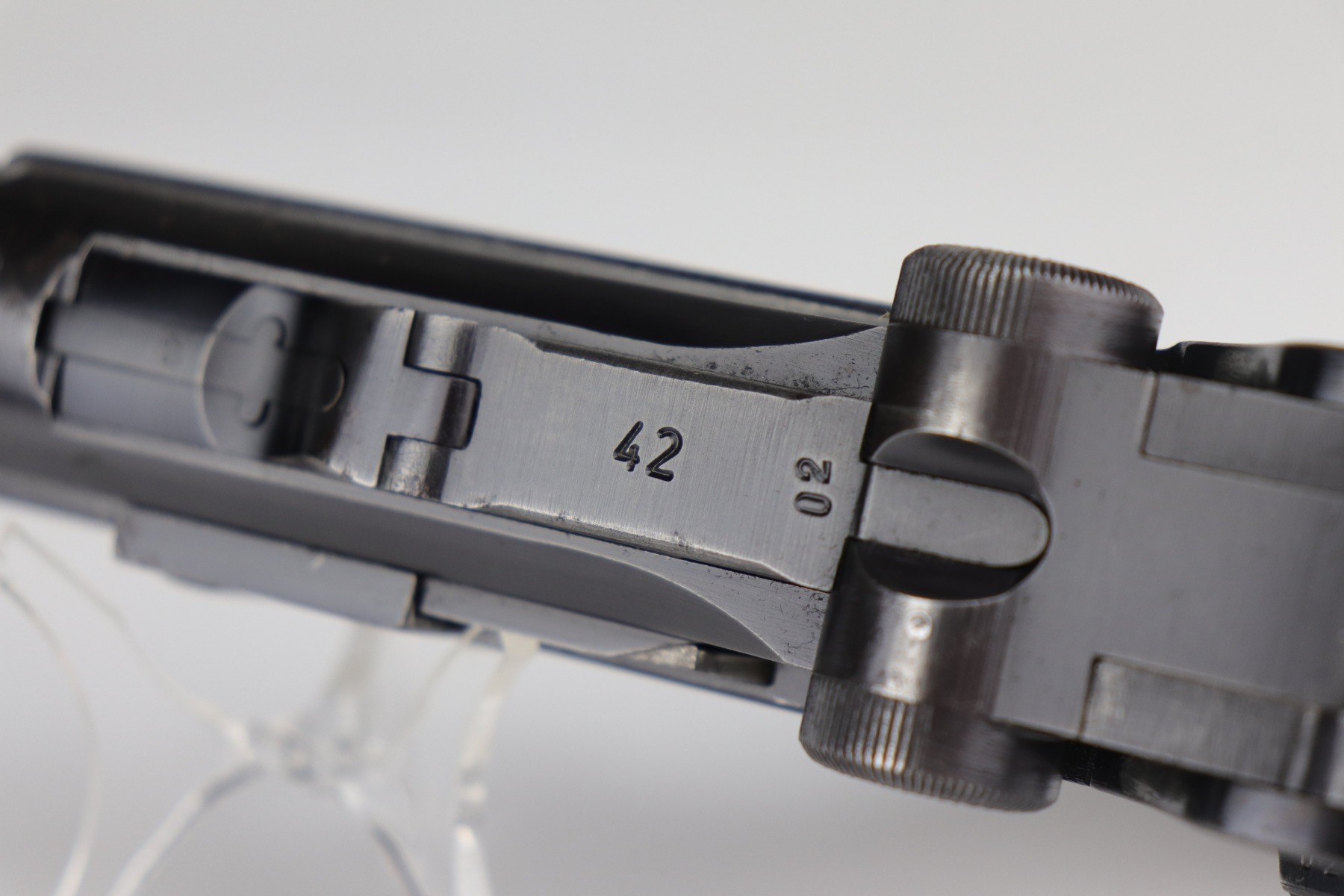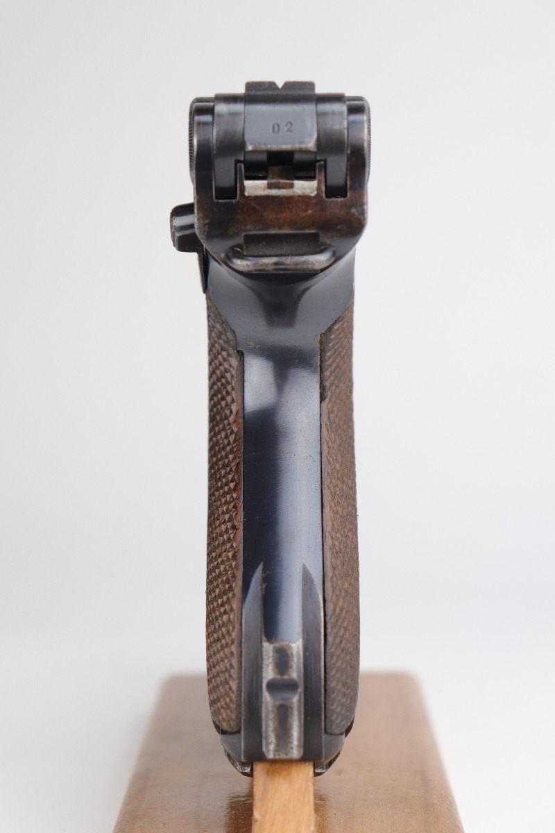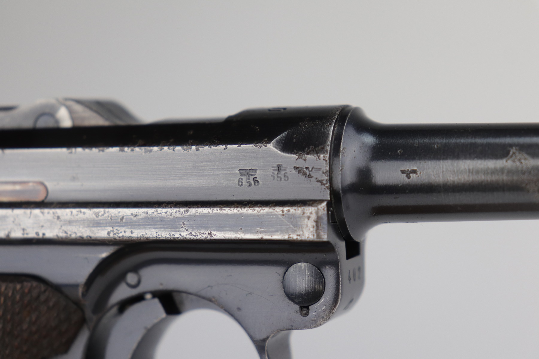 9/9/20 – This is a Mauser Luger rig issued to the Nazi military in 1940. The chamber is dated 1940 and the toggle is marked with the “42” Mauser factory code. The right side of the slide has the proper “Eagle 655” Nazi military acceptance proofs. The rig comes with a nice, waffenamt, 1939-dated luger holster and an “Eagle 63” luger tool. This gun has retained roughly 80% of its original bluing. The most noticeable wear is pitting on the right side of the barrel, frame, and slide. There is muzzle wear, wear on the side plate, and wear along the high edges of the frame. There are areas of wear at the base of the straps, a few light scratches on the front strap, and pitting on the stock lug. There is also a spot of wear on the underside of the trigger guard. The bore has decent rifling, but there is minor pin-pricking throughout. Excellent, period-correct grips that are “Eagle 655”-proofed. It comes with chipped wood-bottom magazine. With this magazine in the gun, the slide does not stay back when racked. We tried this with a different magazine and it works perfectly. So the problem is with the magazine only. Otherwise, it functions well.