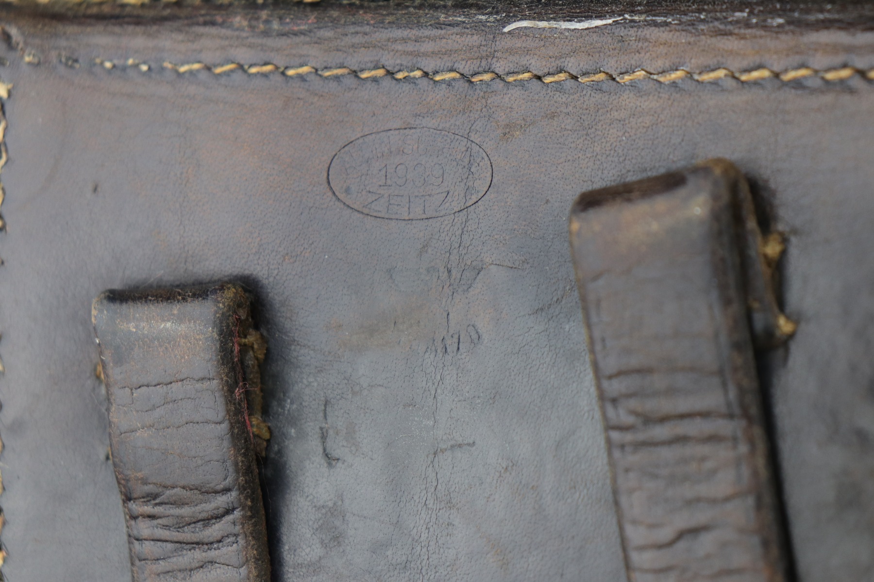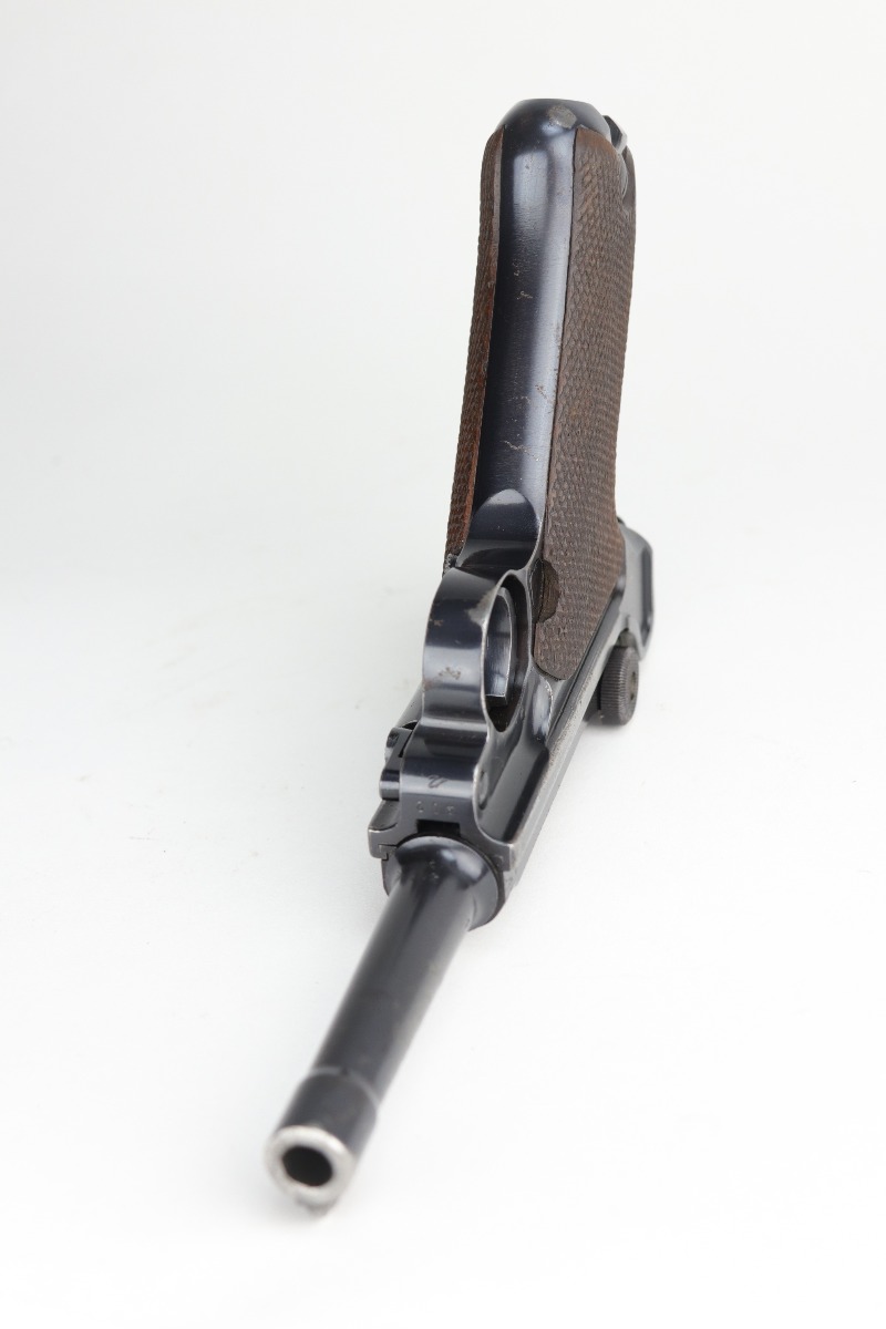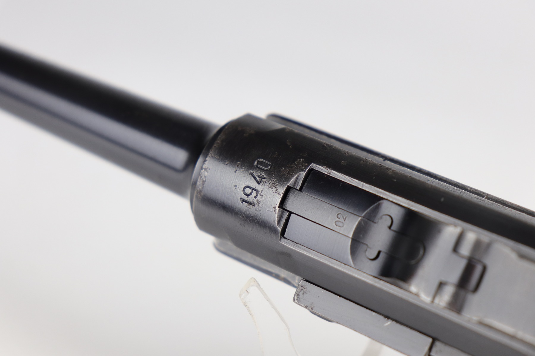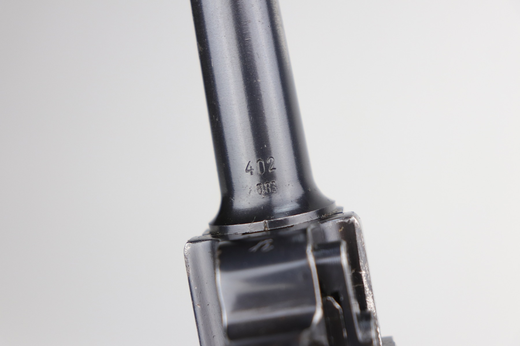 9/9/20 – This is a Mauser Luger rig issued to the Nazi military in 1940. The chamber is dated 1940 and the toggle is marked with the “42” Mauser factory code. The right side of the slide has the proper “Eagle 655” Nazi military acceptance proofs. The rig comes with a nice, waffenamt, 1939-dated luger holster and an “Eagle 63” luger tool. This gun has retained roughly 80% of its original bluing. The most noticeable wear is pitting on the right side of the barrel, frame, and slide. There is muzzle wear, wear on the side plate, and wear along the high edges of the frame. There are areas of wear at the base of the straps, a few light scratches on the front strap, and pitting on the stock lug. There is also a spot of wear on the underside of the trigger guard. The bore has decent rifling, but there is minor pin-pricking throughout. Excellent, period-correct grips that are “Eagle 655”-proofed. It comes with chipped wood-bottom magazine. With this magazine in the gun, the slide does not stay back when racked. We tried this with a different magazine and it works perfectly. So the problem is with the magazine only. Otherwise, it functions well.