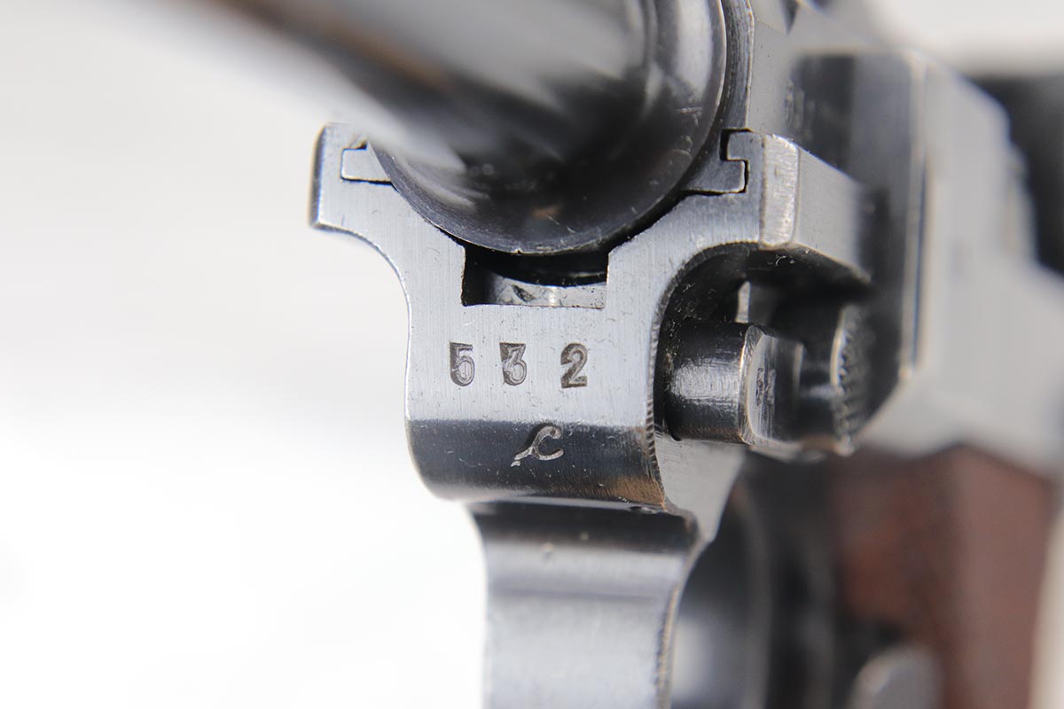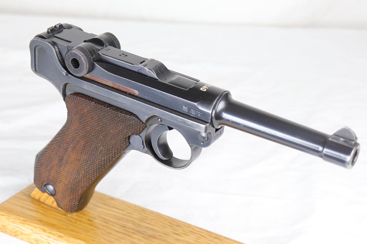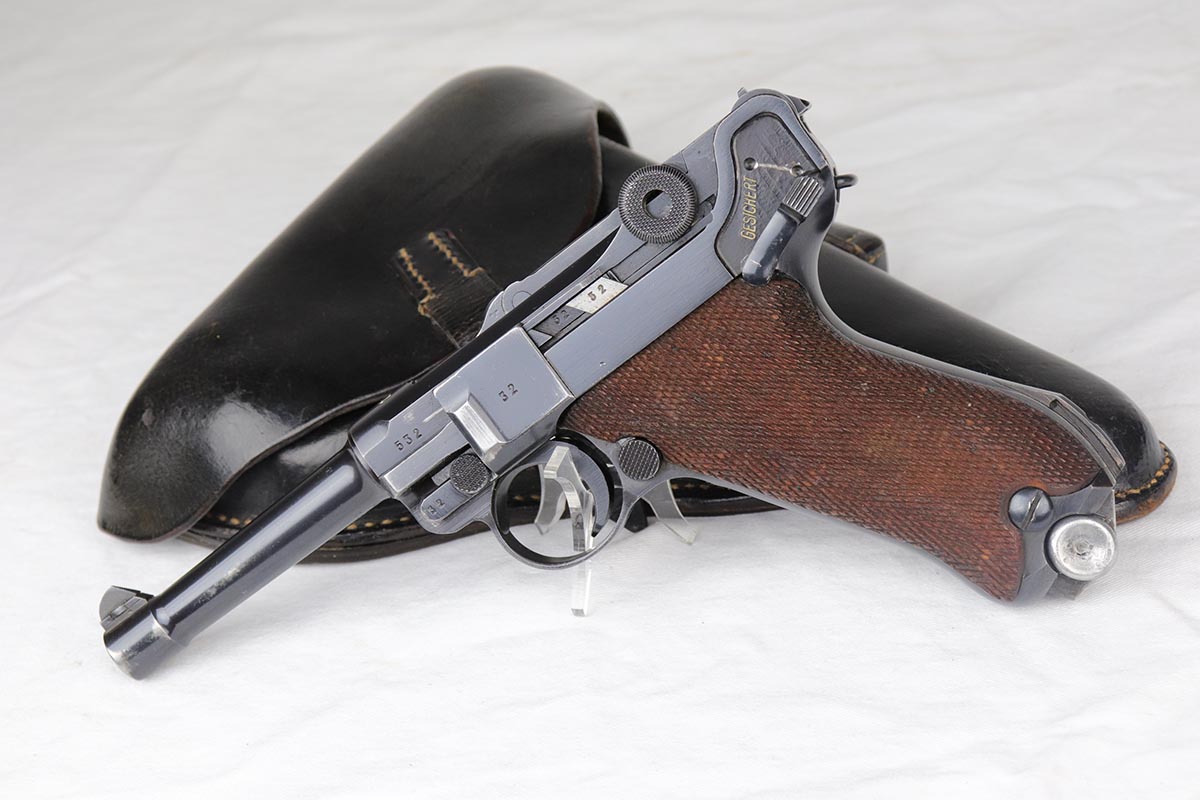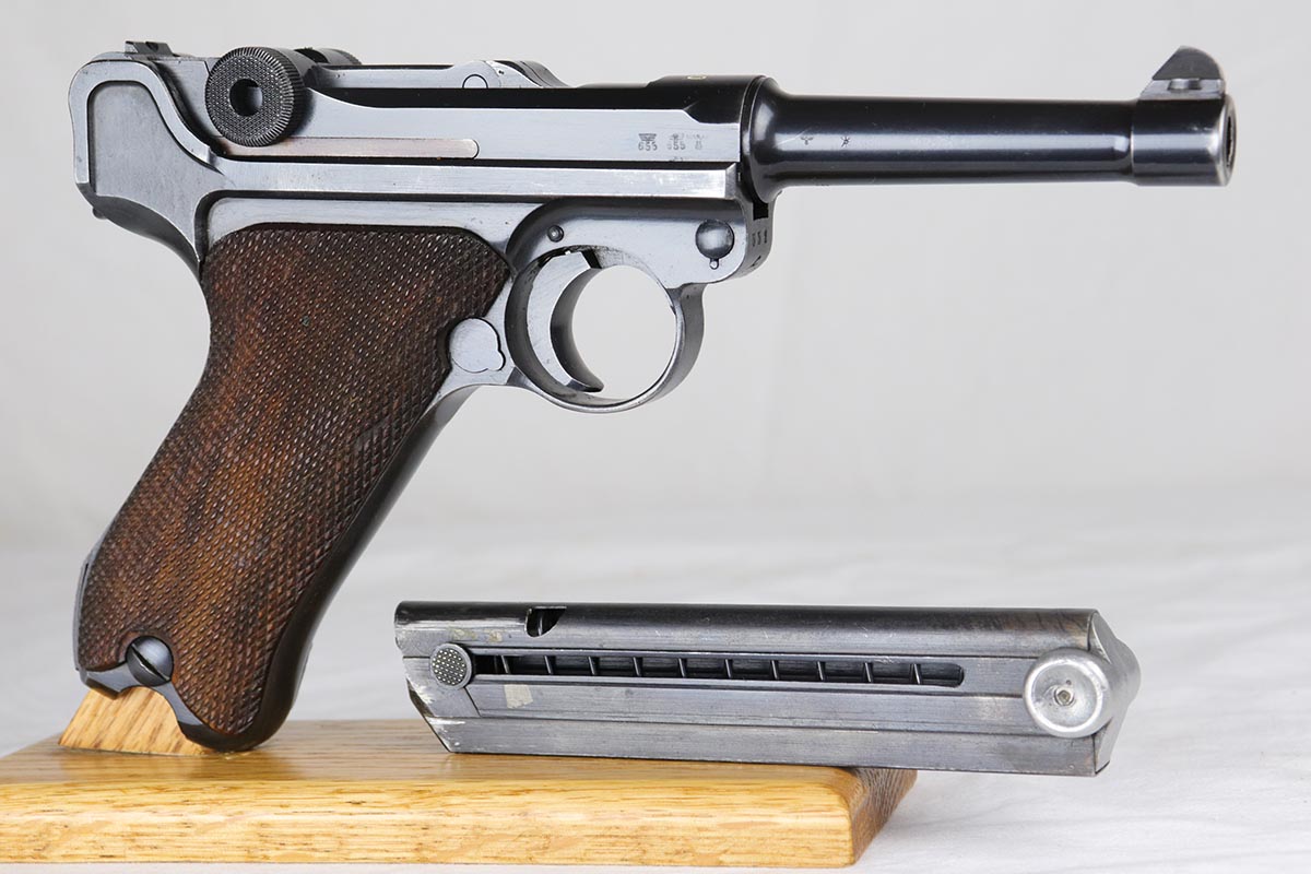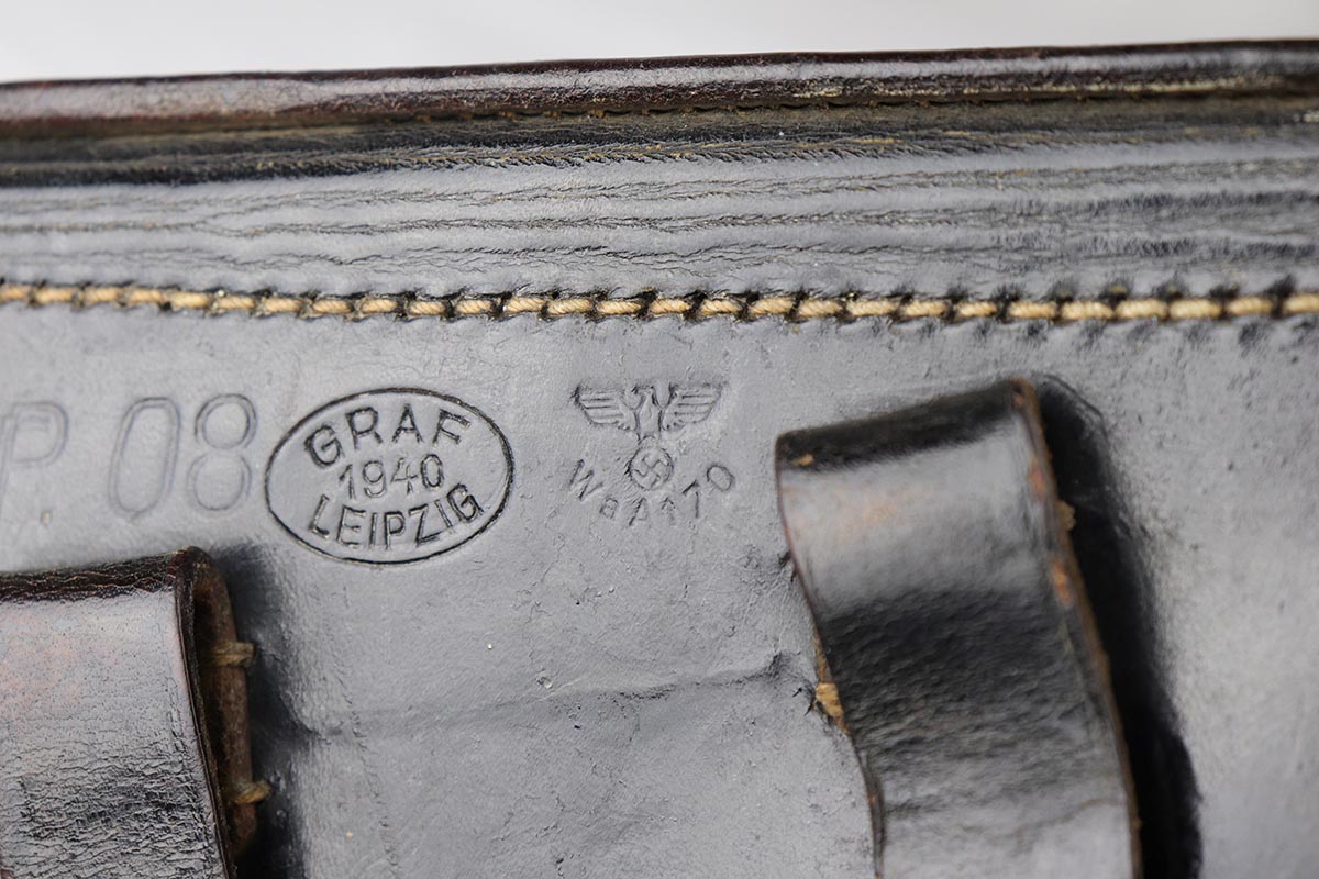 3/27/18 – This is a very nice example of a Nazi issued Mauser Luger rig from 1940.  The toggle shows the Mauser factory ’42’ code, and the pistol features all matching numbers (aside from the magazine).  The finish on the pistol rates at 94-95% with standard edge wear from the holster.  The grips are not numbered but are E/655 proofed.  The left panel does have a minor chip from the safety lever.  The holster is 1940 dated and in fantastic condition.  It is maker marked and waffen proofed.  Comes with an E/655 marked luger tool but no spare magazine.  Pistol has excellent bore.