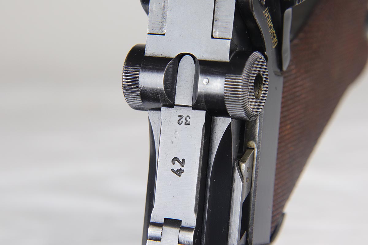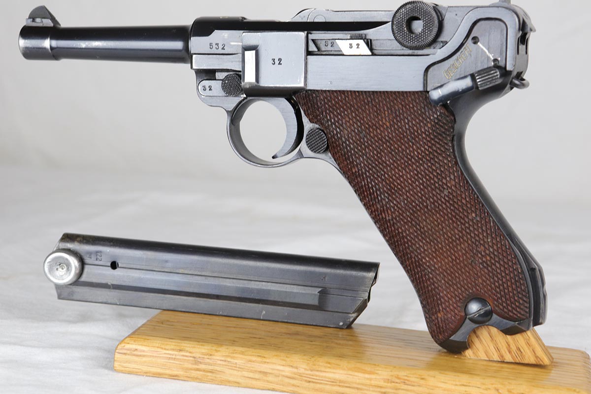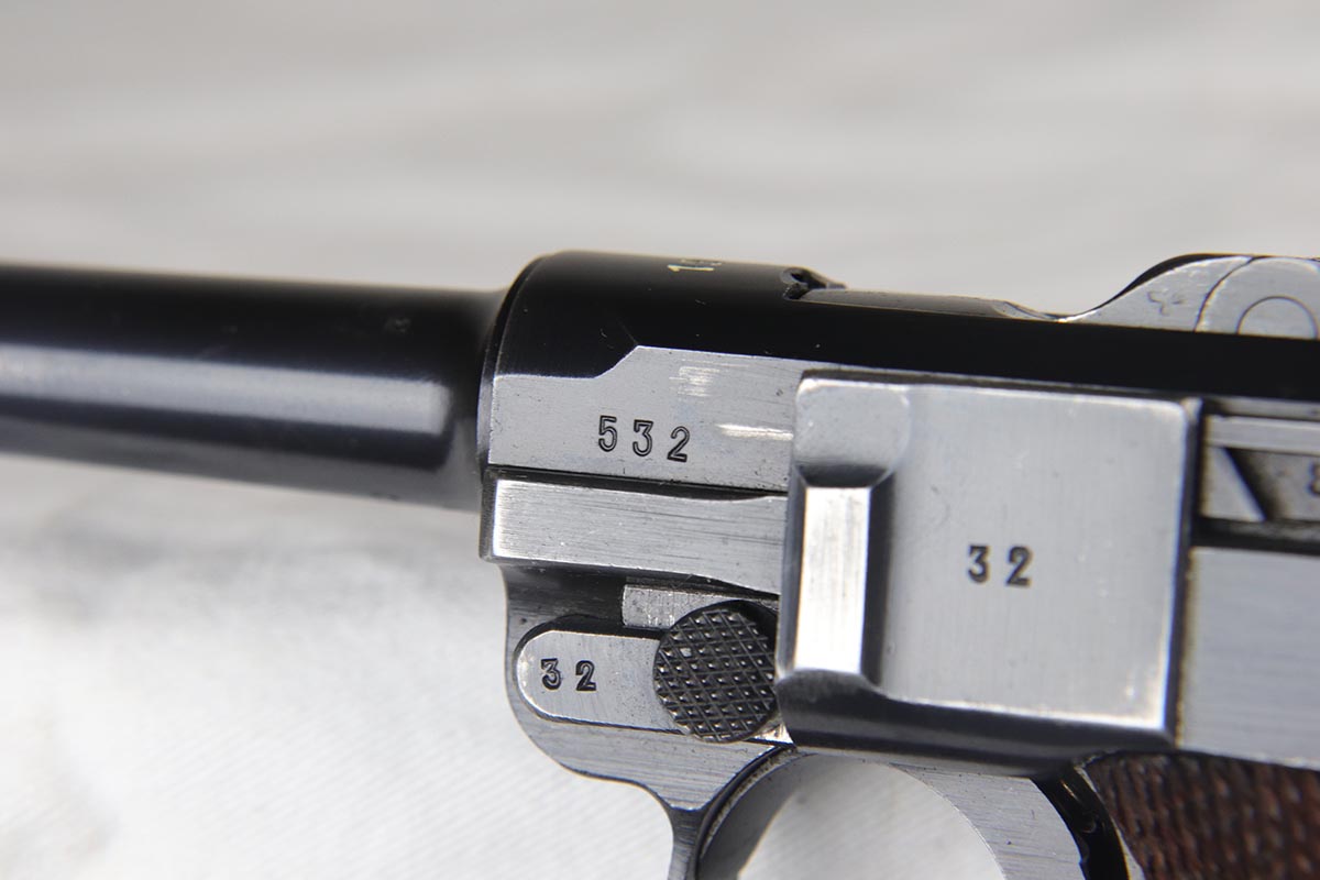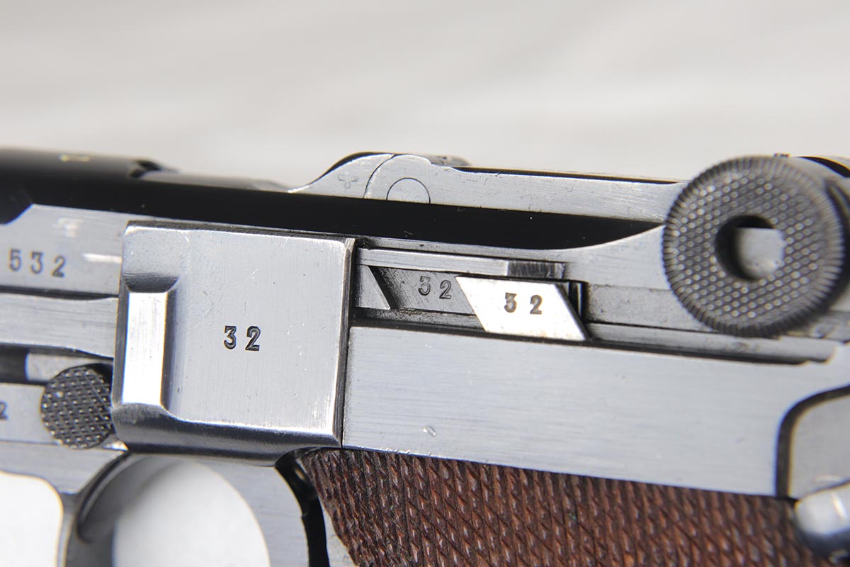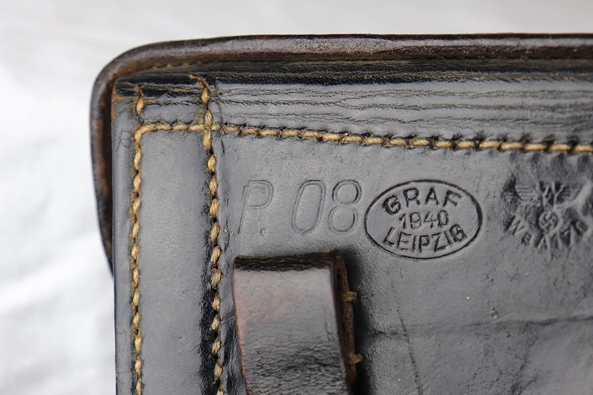 3/27/18 – This is a very nice example of a Nazi issued Mauser Luger rig from 1940.  The toggle shows the Mauser factory ’42’ code, and the pistol features all matching numbers (aside from the magazine).  The finish on the pistol rates at 94-95% with standard edge wear from the holster.  The grips are not numbered but are E/655 proofed.  The left panel does have a minor chip from the safety lever.  The holster is 1940 dated and in fantastic condition.  It is maker marked and waffen proofed.  Comes with an E/655 marked luger tool but no spare magazine.  Pistol has excellent bore.