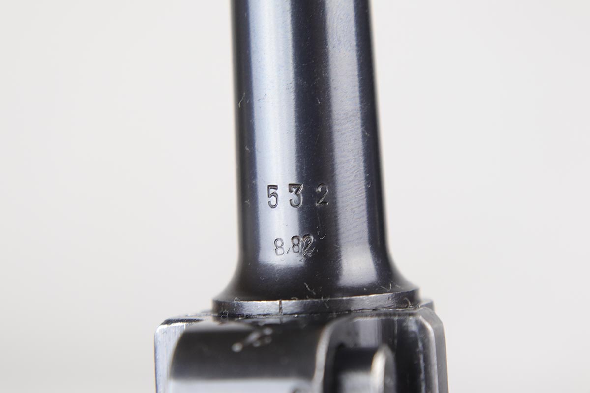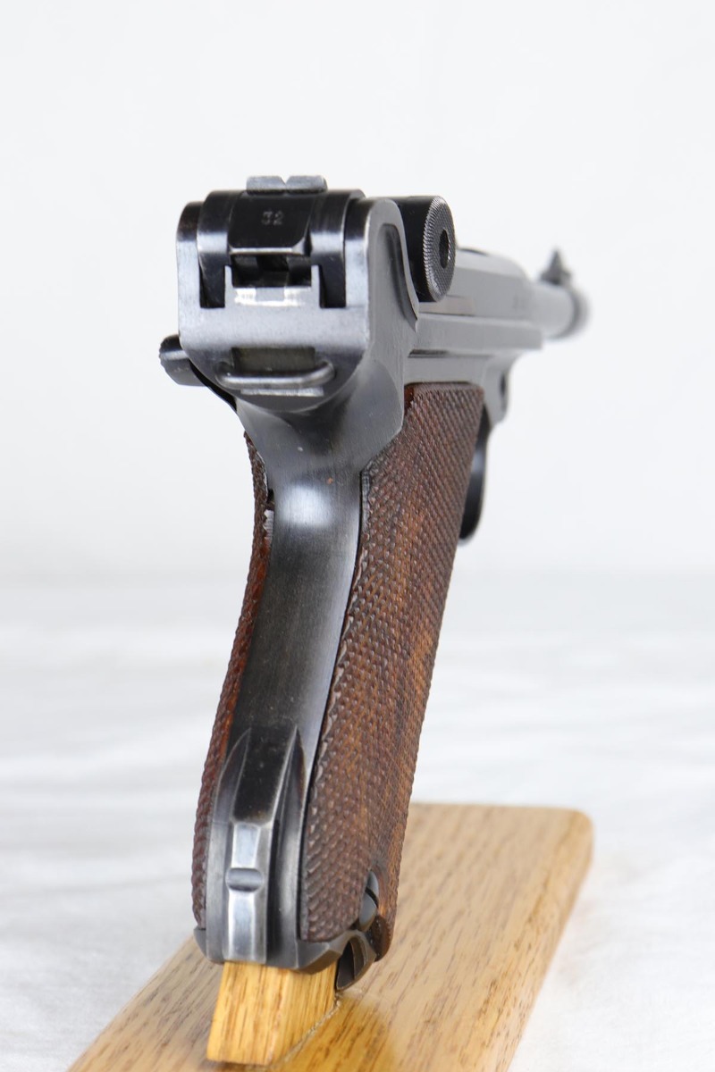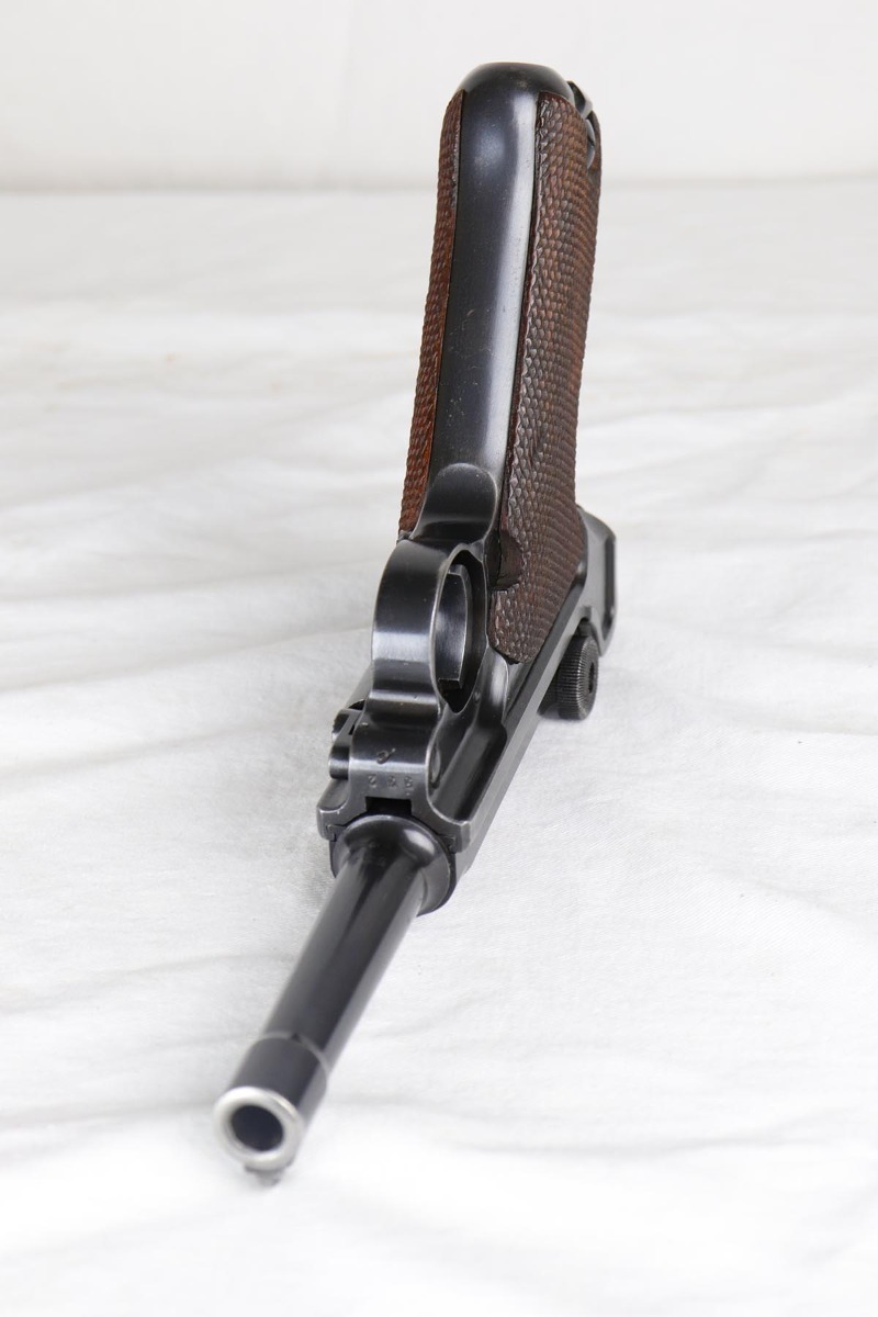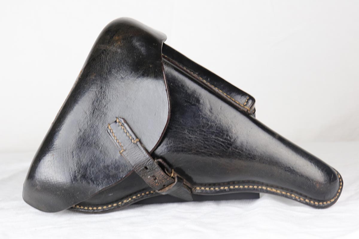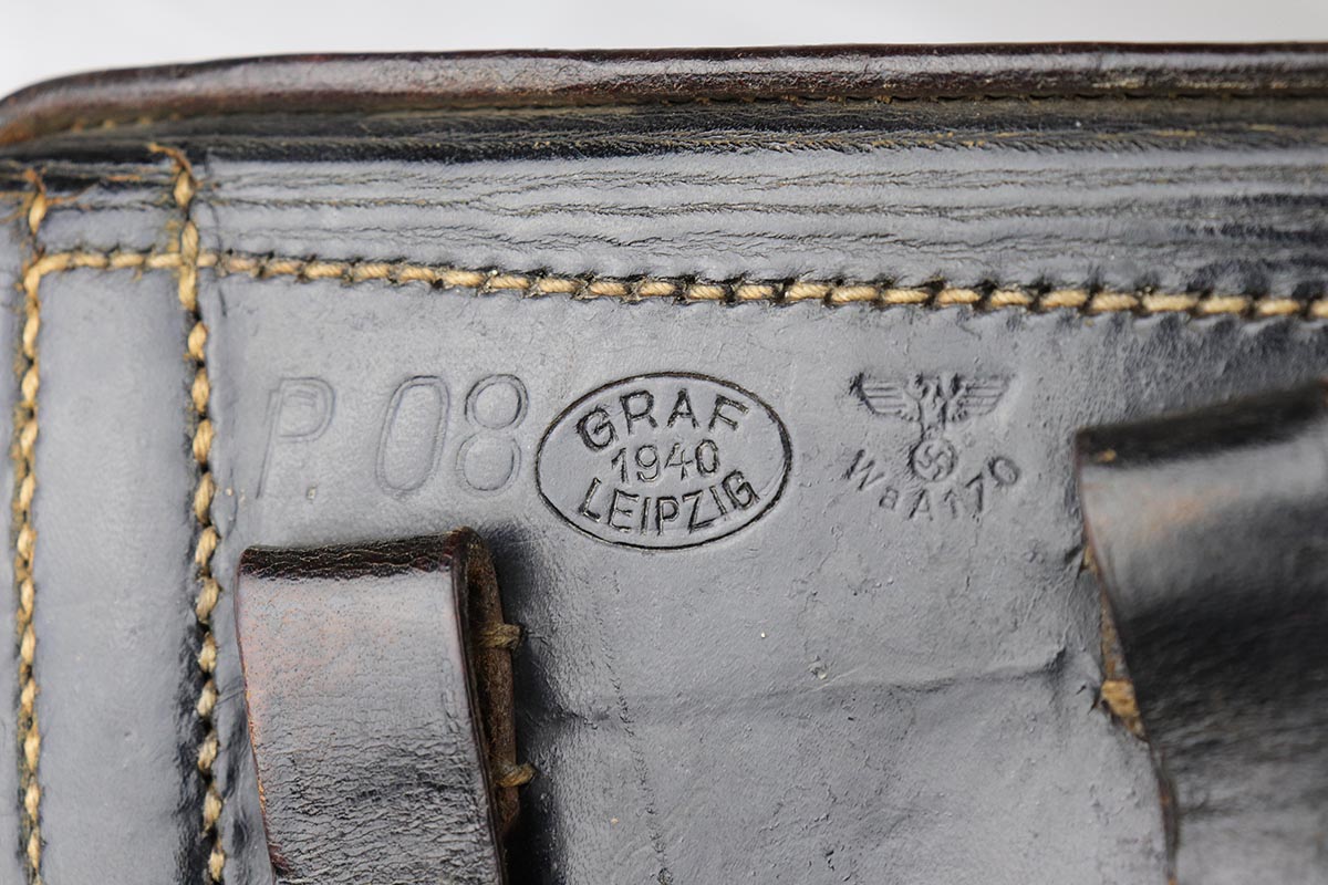 3/27/18 – This is a very nice example of a Nazi issued Mauser Luger rig from 1940.  The toggle shows the Mauser factory ’42’ code, and the pistol features all matching numbers (aside from the magazine).  The finish on the pistol rates at 94-95% with standard edge wear from the holster.  The grips are not numbered but are E/655 proofed.  The left panel does have a minor chip from the safety lever.  The holster is 1940 dated and in fantastic condition.  It is maker marked and waffen proofed.  Comes with an E/655 marked luger tool but no spare magazine.  Pistol has excellent bore.