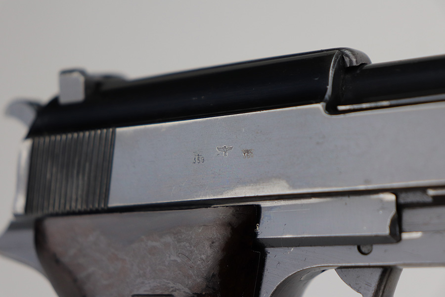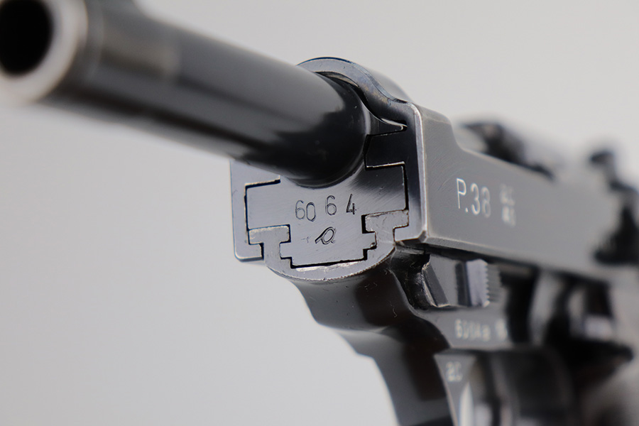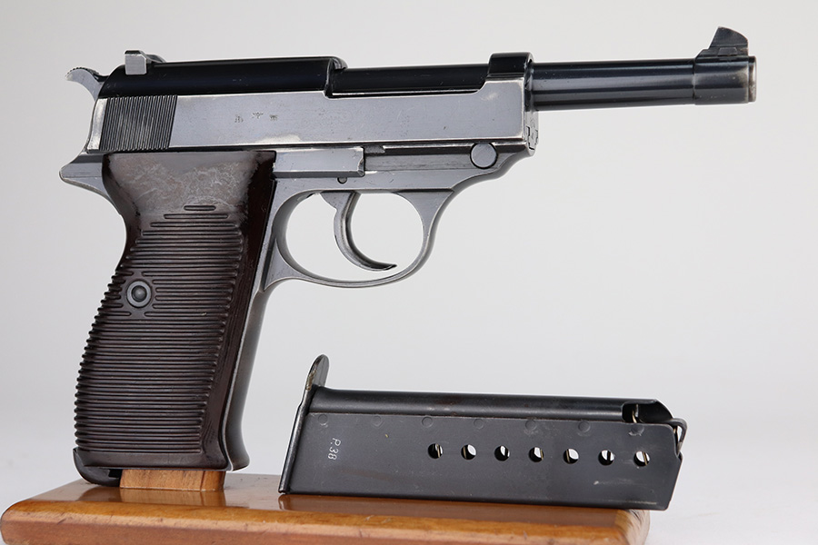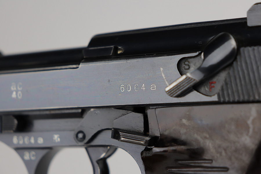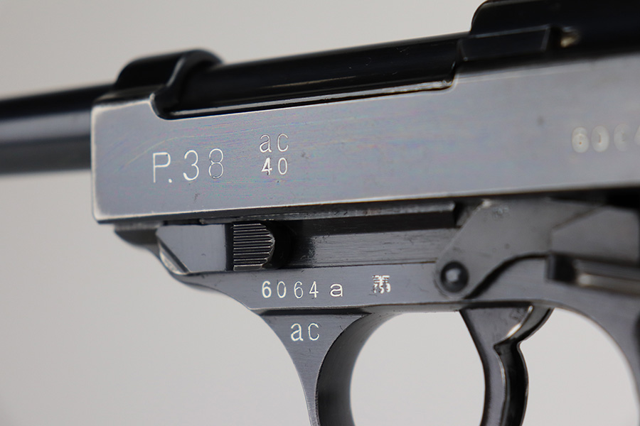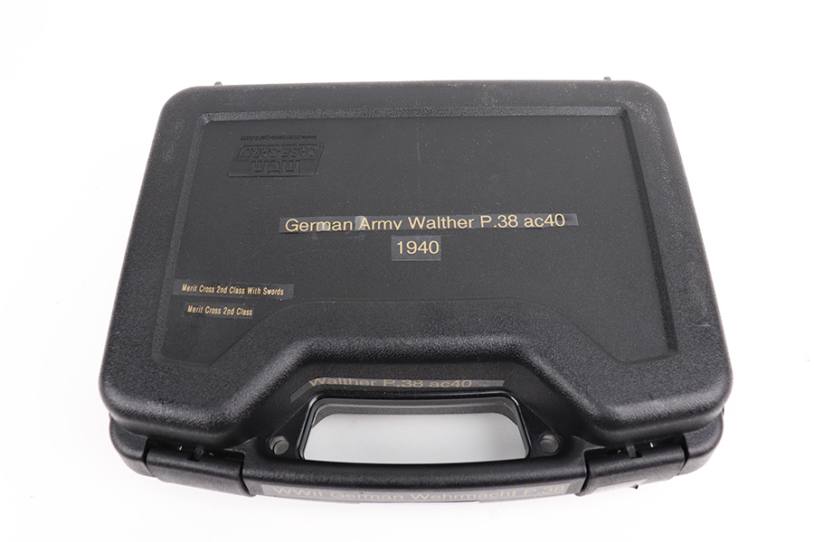 5/5/21 – This is a very nice example of a Walther P.38 issued to the Nazi military in 1940. This gun is being sold on consignment. The consignor put together a very cool assembly to accompany the gun that includes a labeled hard case, repro Nazi armband, 1939-dated Cross of Honor with swords, a 1939-dated Merit Badge, and several Third Reich coins. The gun is all matching and has the proper “Eagle 359” proofs throughout, even on the small parts. It has retained about 90% of its original high polish finish. There is spotty wear on the front strap, wear on the high edges of the slide and around the muzzle, and an area of wear on the right side of the slide. Comes with excellent grips and a period-correct magazine that is mismatched but very close. The bore bore is shiny with strong rifling with spotty freckling in the grooves. De-cocker is functional.