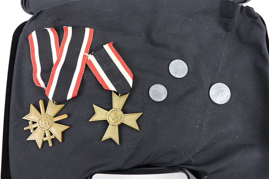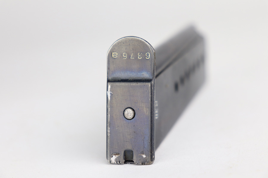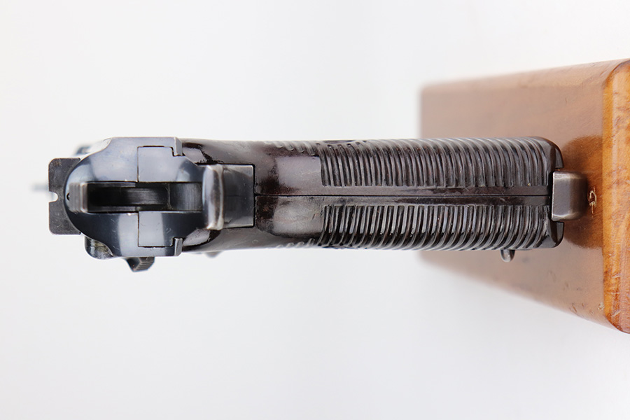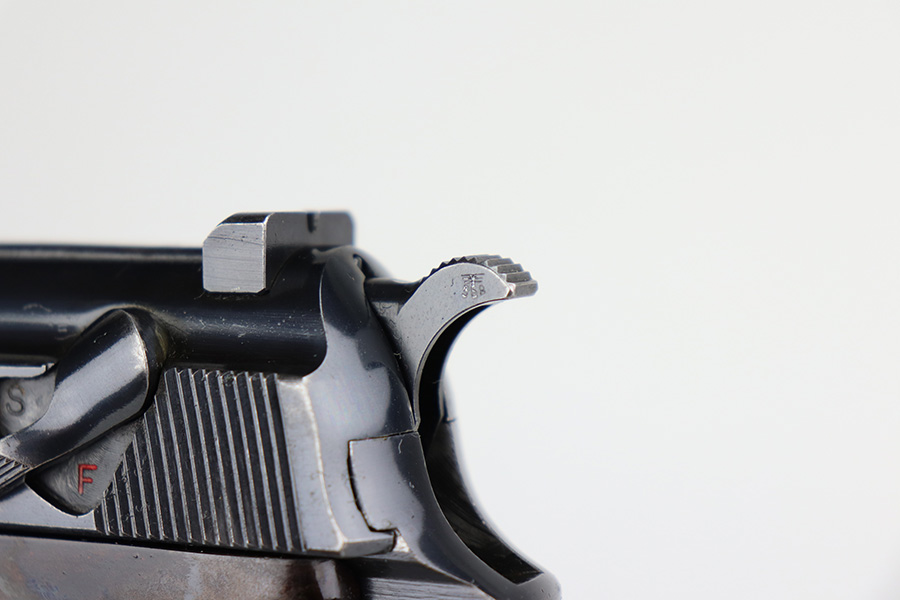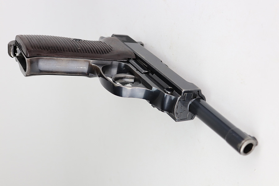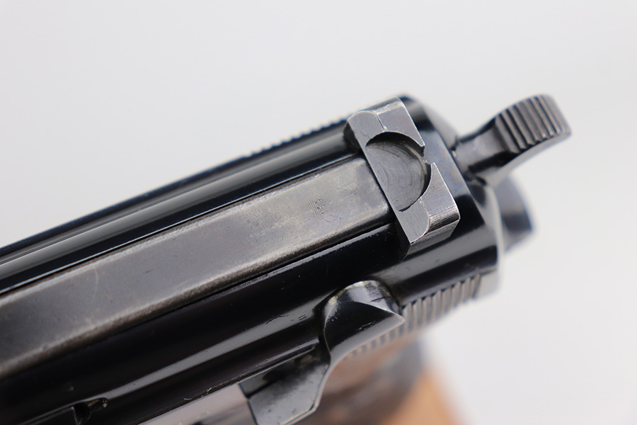 5/5/21 – This is a very nice example of a Walther P.38 issued to the Nazi military in 1940. This gun is being sold on consignment. The consignor put together a very cool assembly to accompany the gun that includes a labeled hard case, repro Nazi armband, 1939-dated Cross of Honor with swords, a 1939-dated Merit Badge, and several Third Reich coins. The gun is all matching and has the proper “Eagle 359” proofs throughout, even on the small parts. It has retained about 90% of its original high polish finish. There is spotty wear on the front strap, wear on the high edges of the slide and around the muzzle, and an area of wear on the right side of the slide. Comes with excellent grips and a period-correct magazine that is mismatched but very close. The bore bore is shiny with strong rifling with spotty freckling in the grooves. De-cocker is functional.